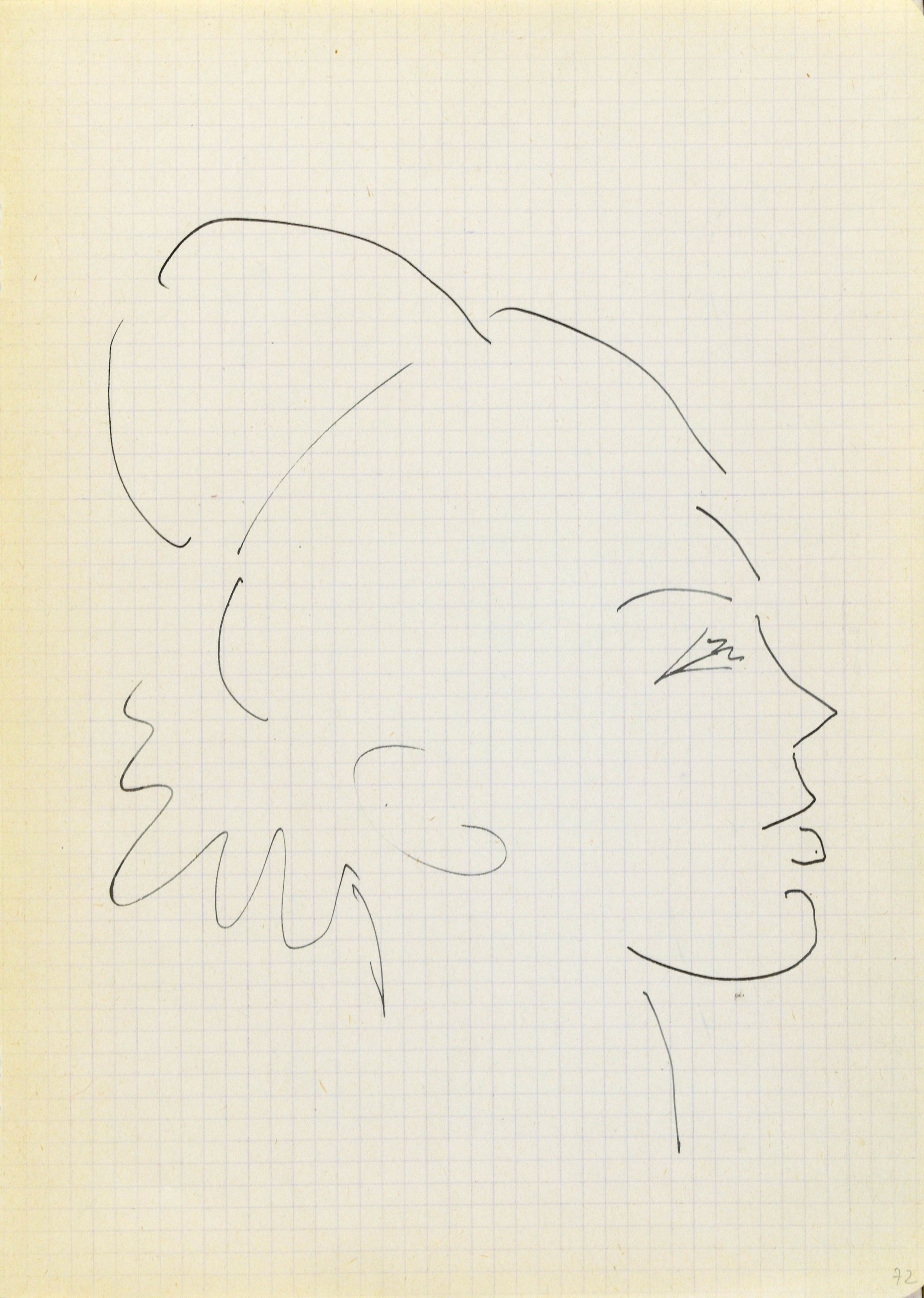 pióro, atrament ciemnoniebieski, papier kremowy w kratkę; 29,7 x 21 cm.