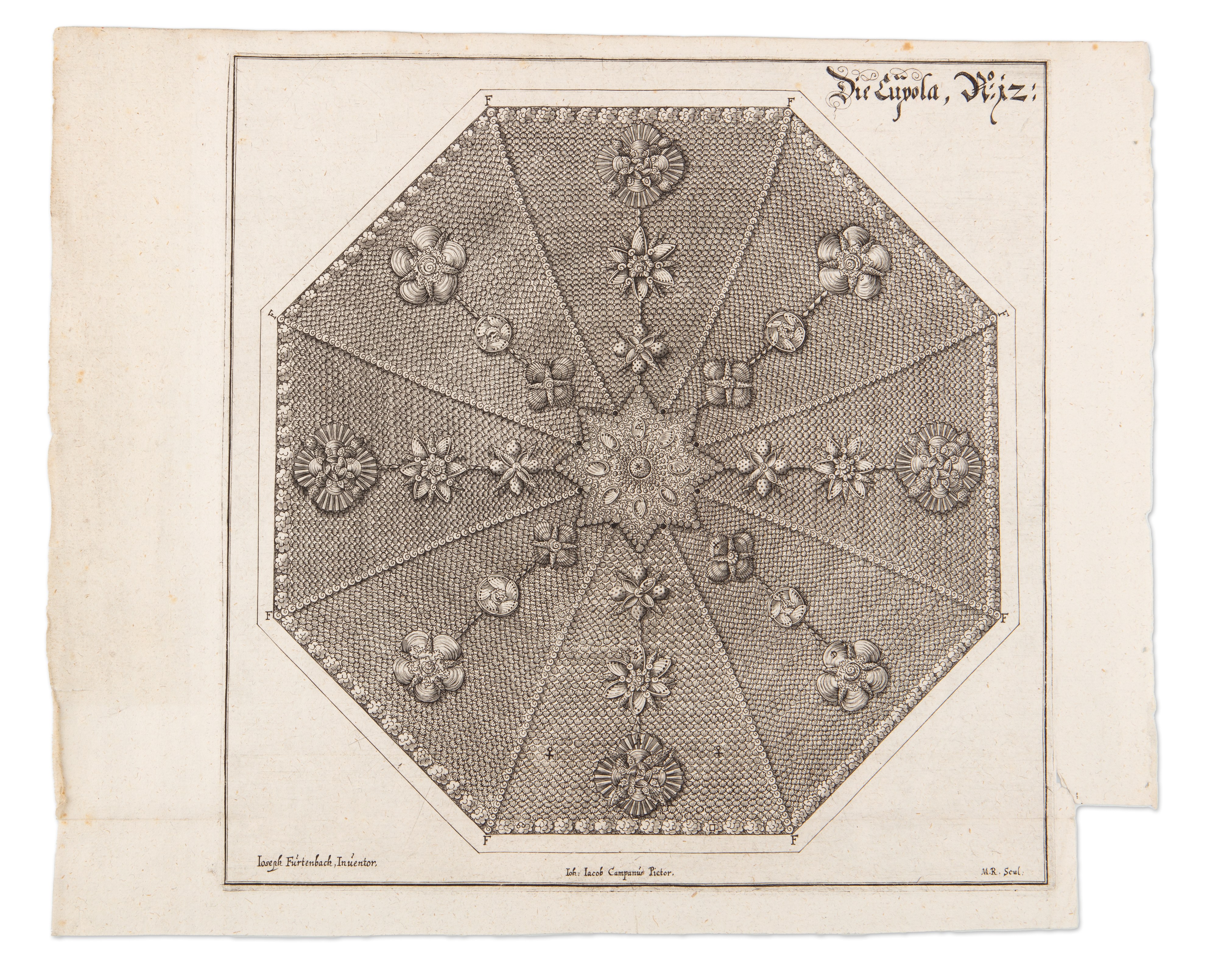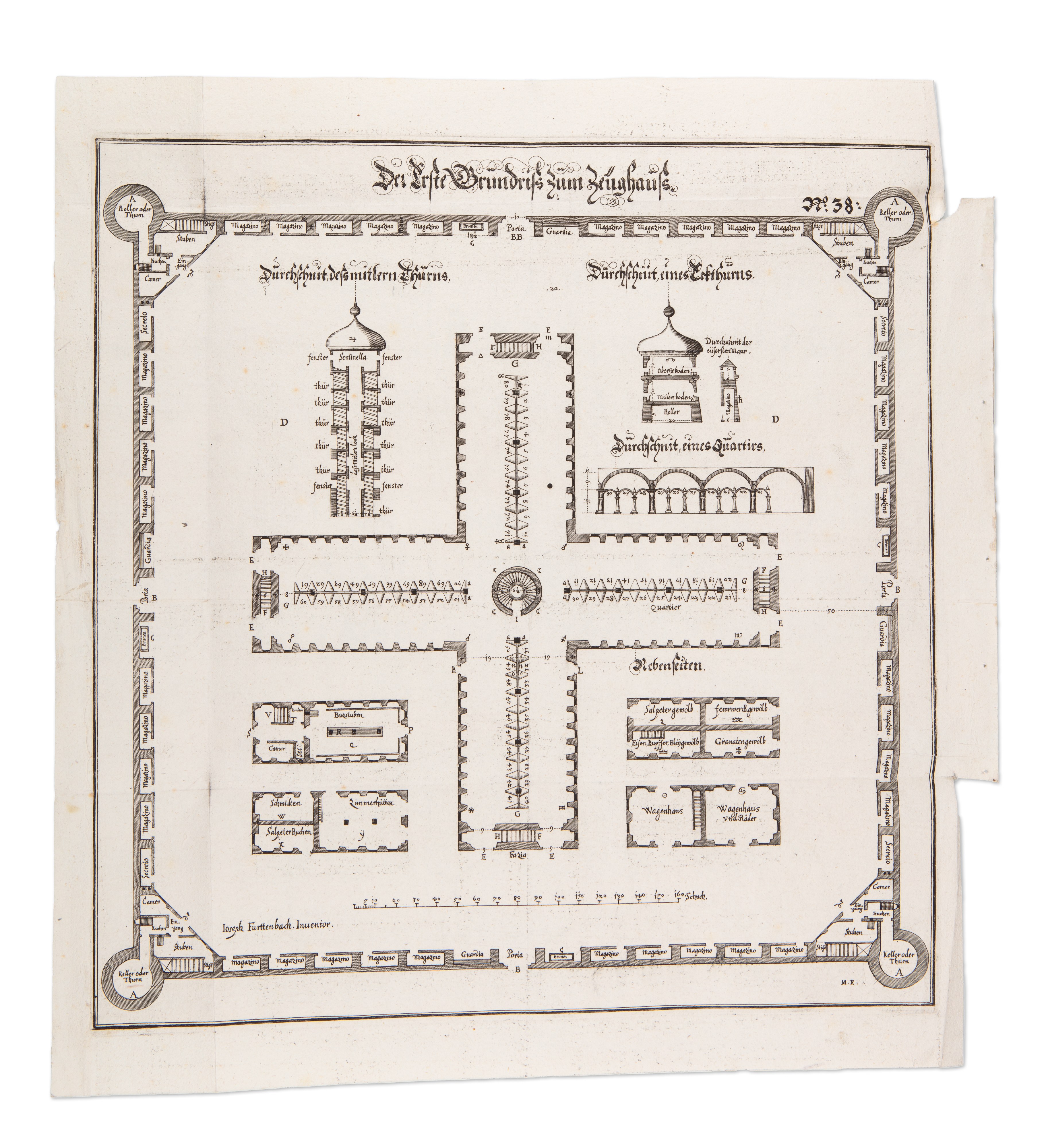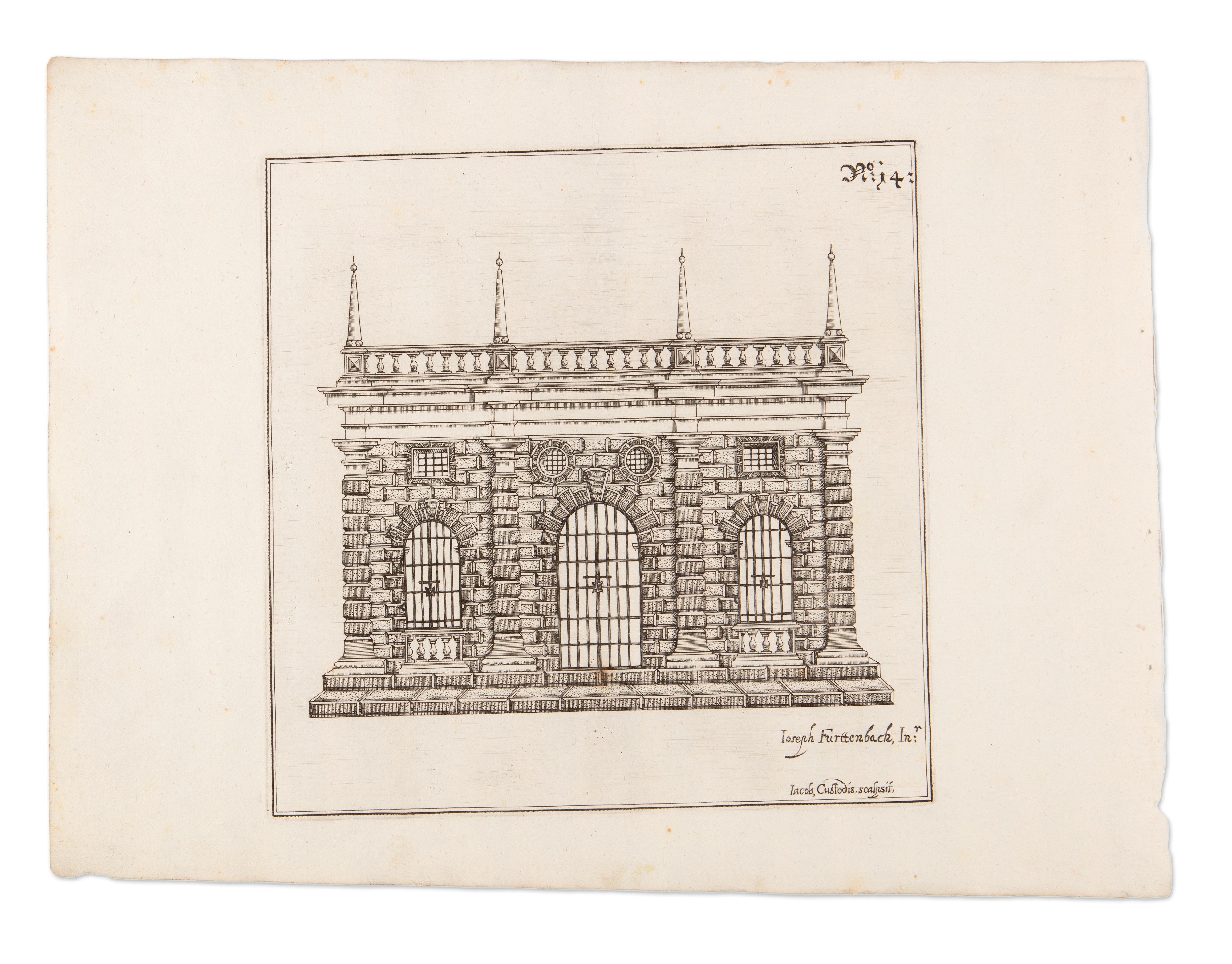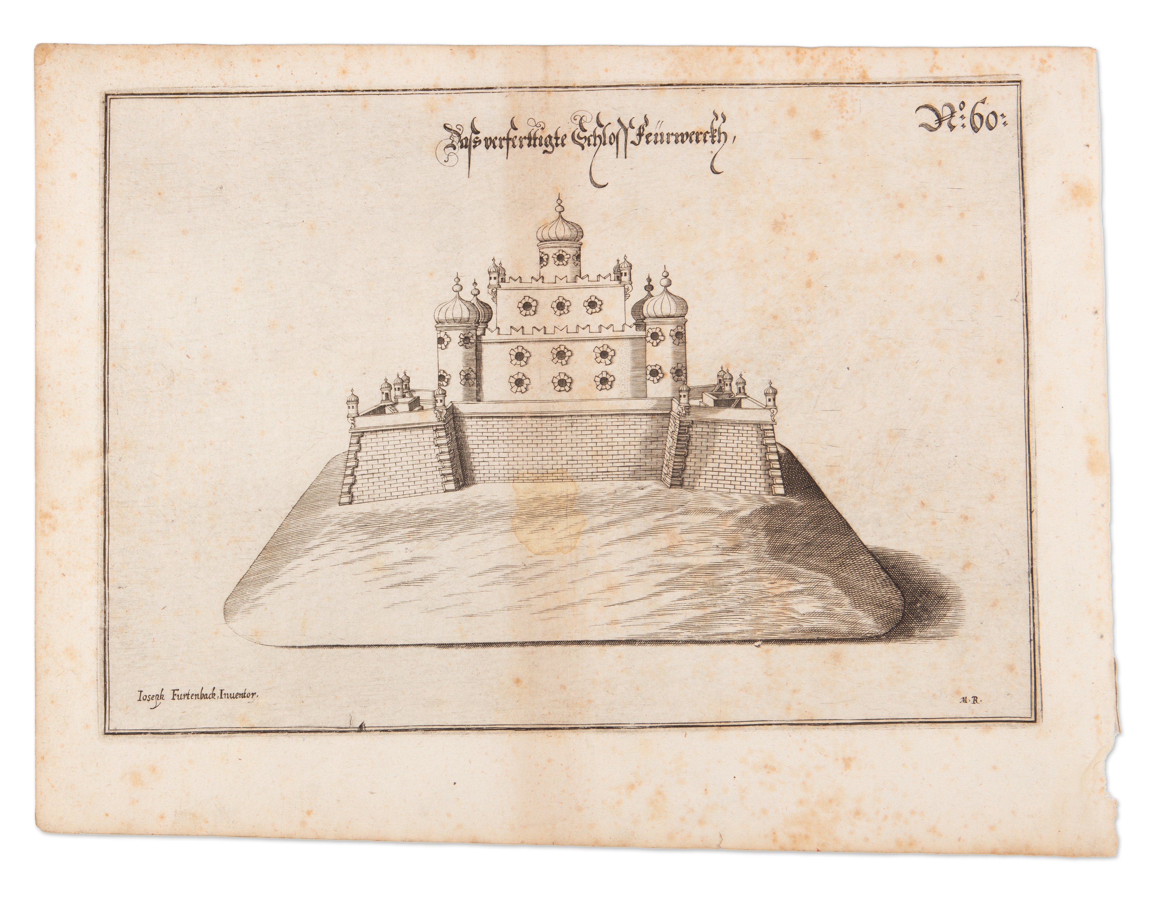 A collection containing approximately 70 technical drawings and floor plans, as well as 24 illustrations from key works by the architect, engineer and designer Joseph Furttenbach the Elder (1591-1667), author of important early Baroque treatises on architecture: Architectura civilis (1628), Architectura martialis (1630), Architectura recreationis (1640) and Architectura privata (1641).