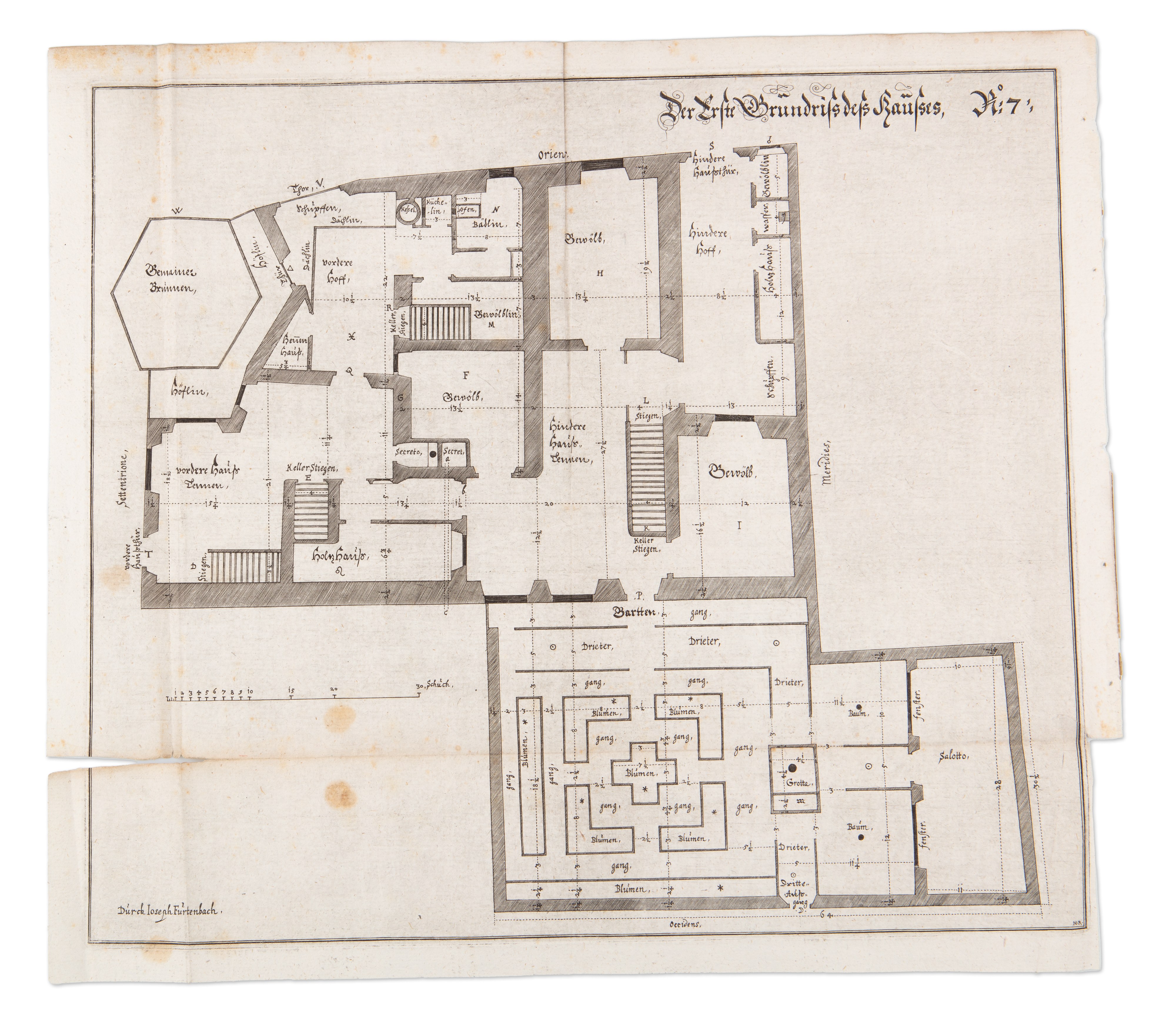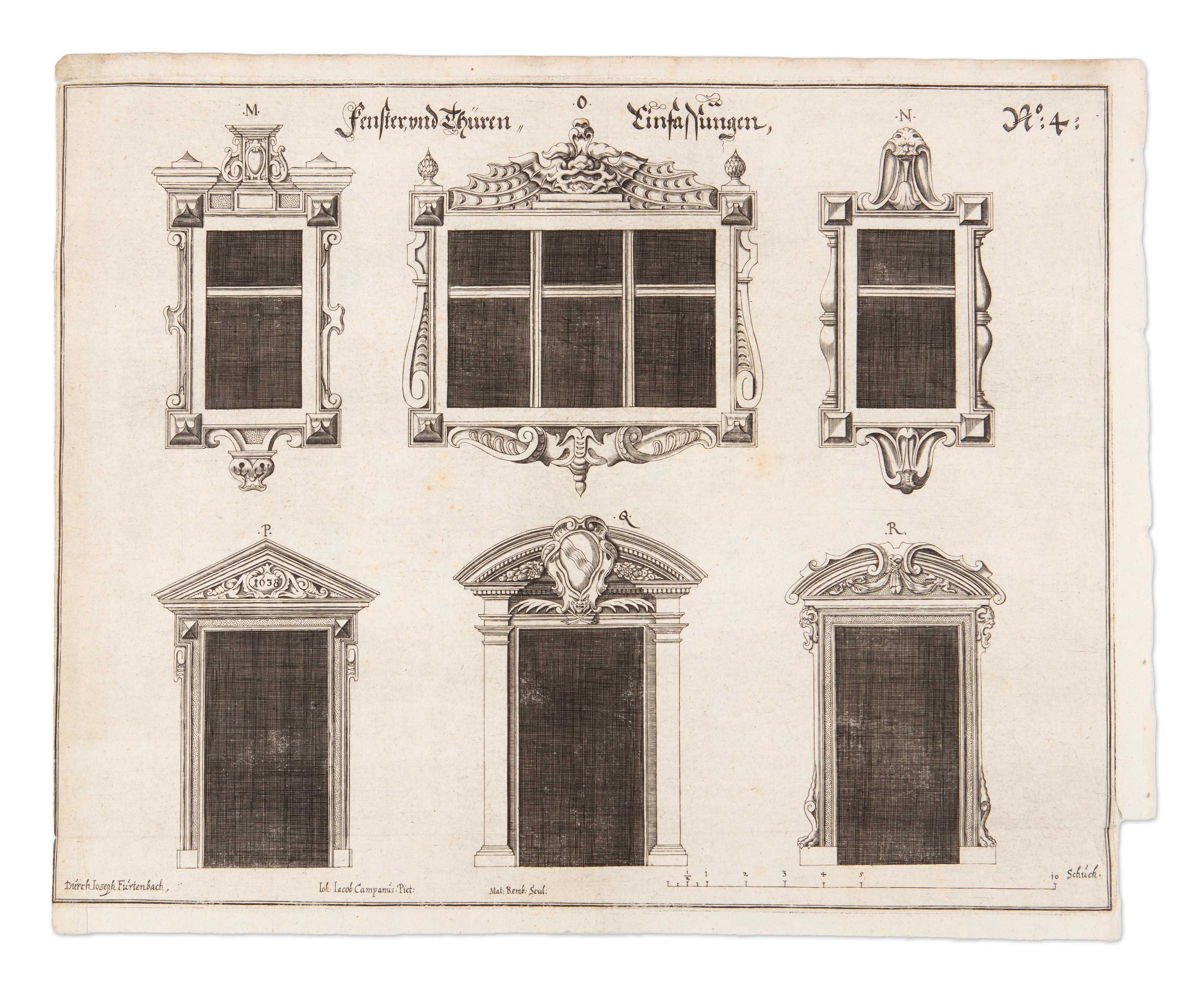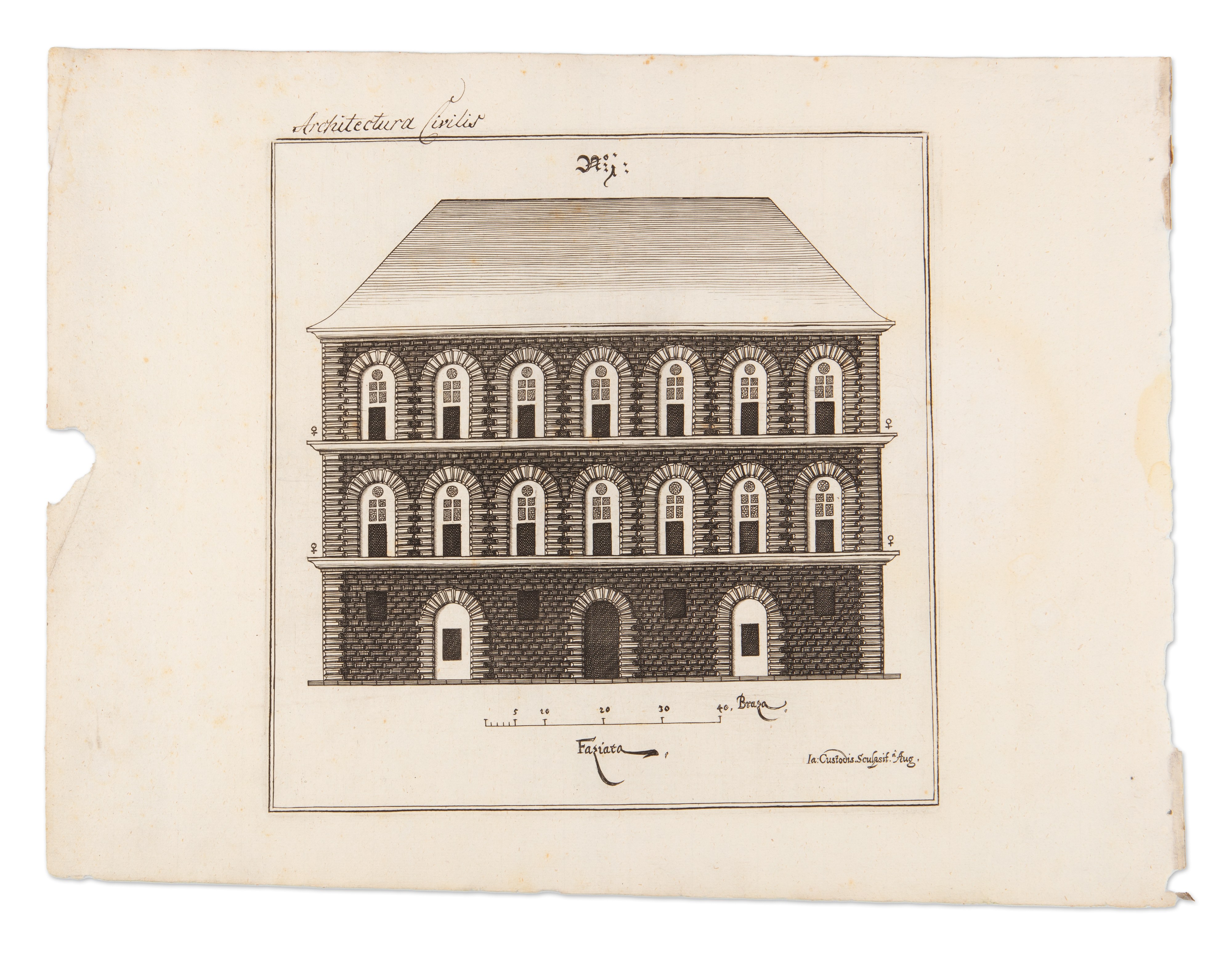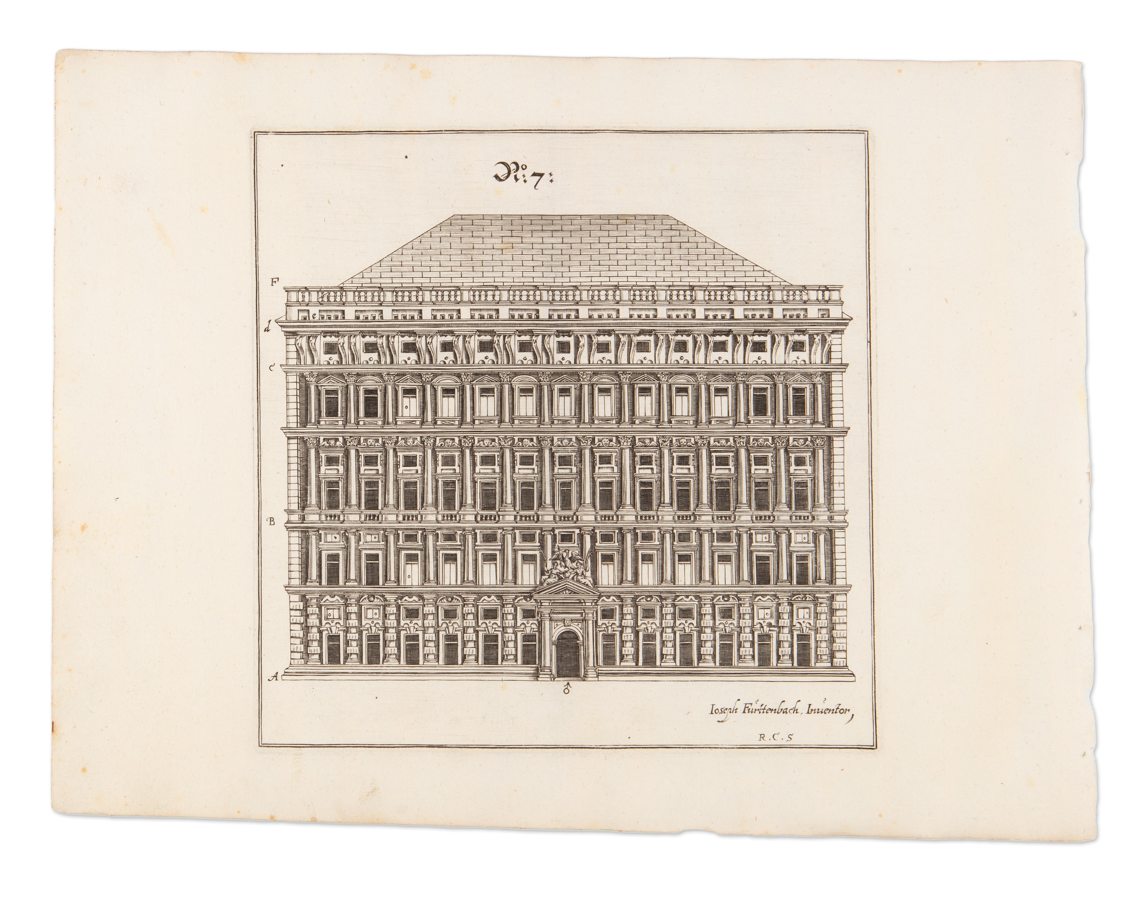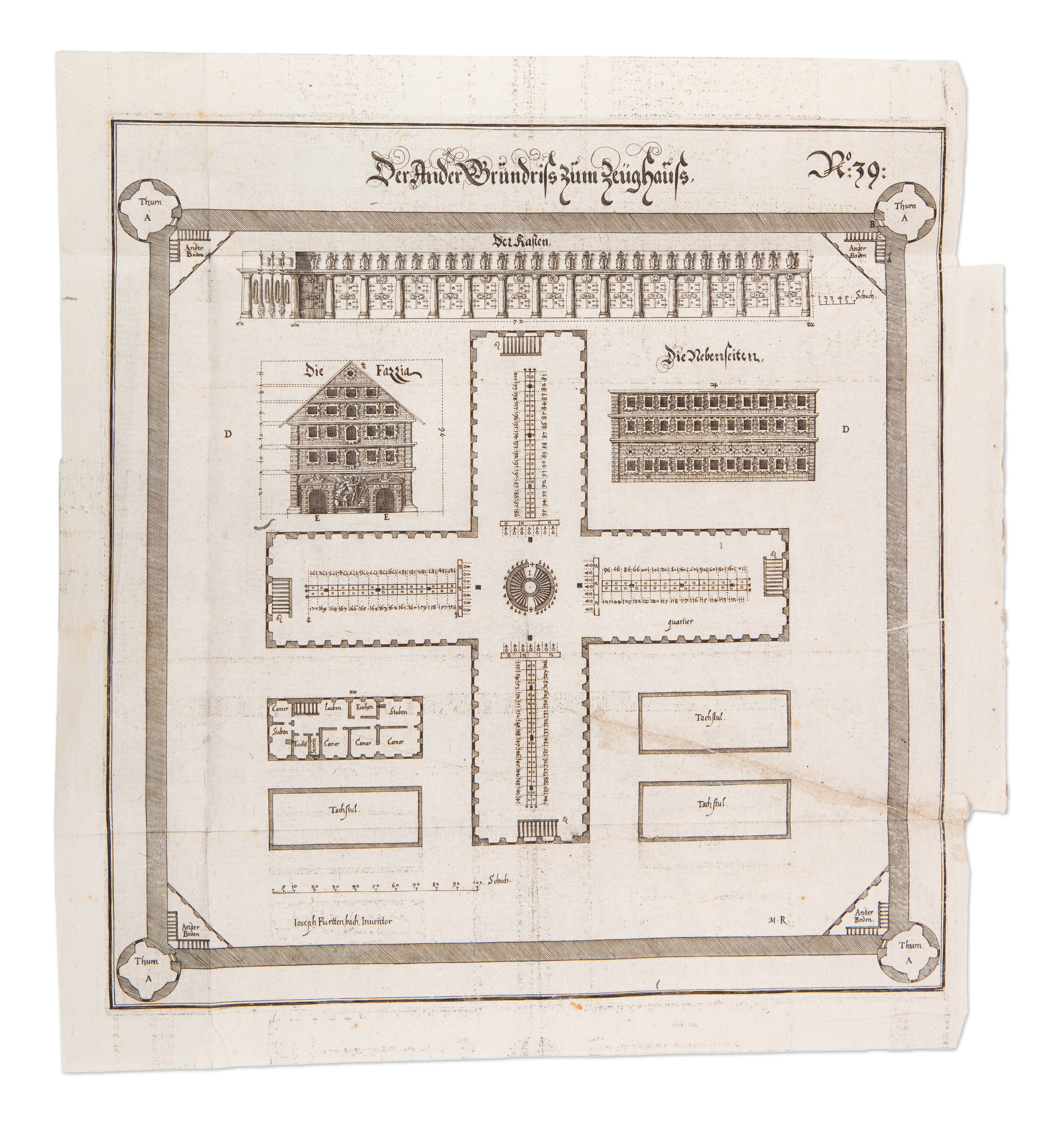 A collection containing approximately 70 technical drawings and floor plans, as well as 24 illustrations from key works by the architect, engineer and designer Joseph Furttenbach the Elder (1591-1667), author of important early Baroque treatises on architecture: Architectura civilis (1628), Architectura martialis (1630), Architectura recreationis (1640) and Architectura privata (1641).