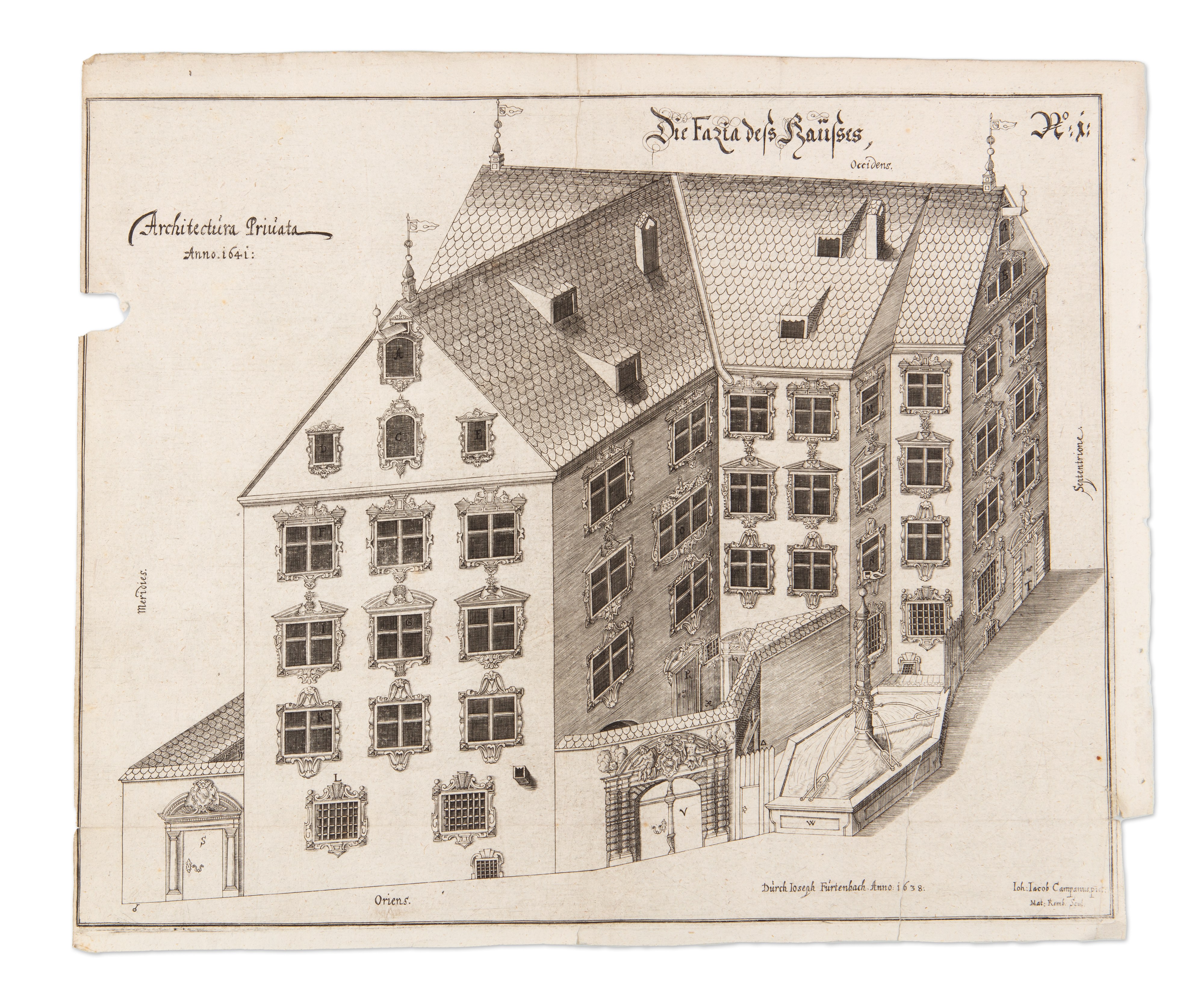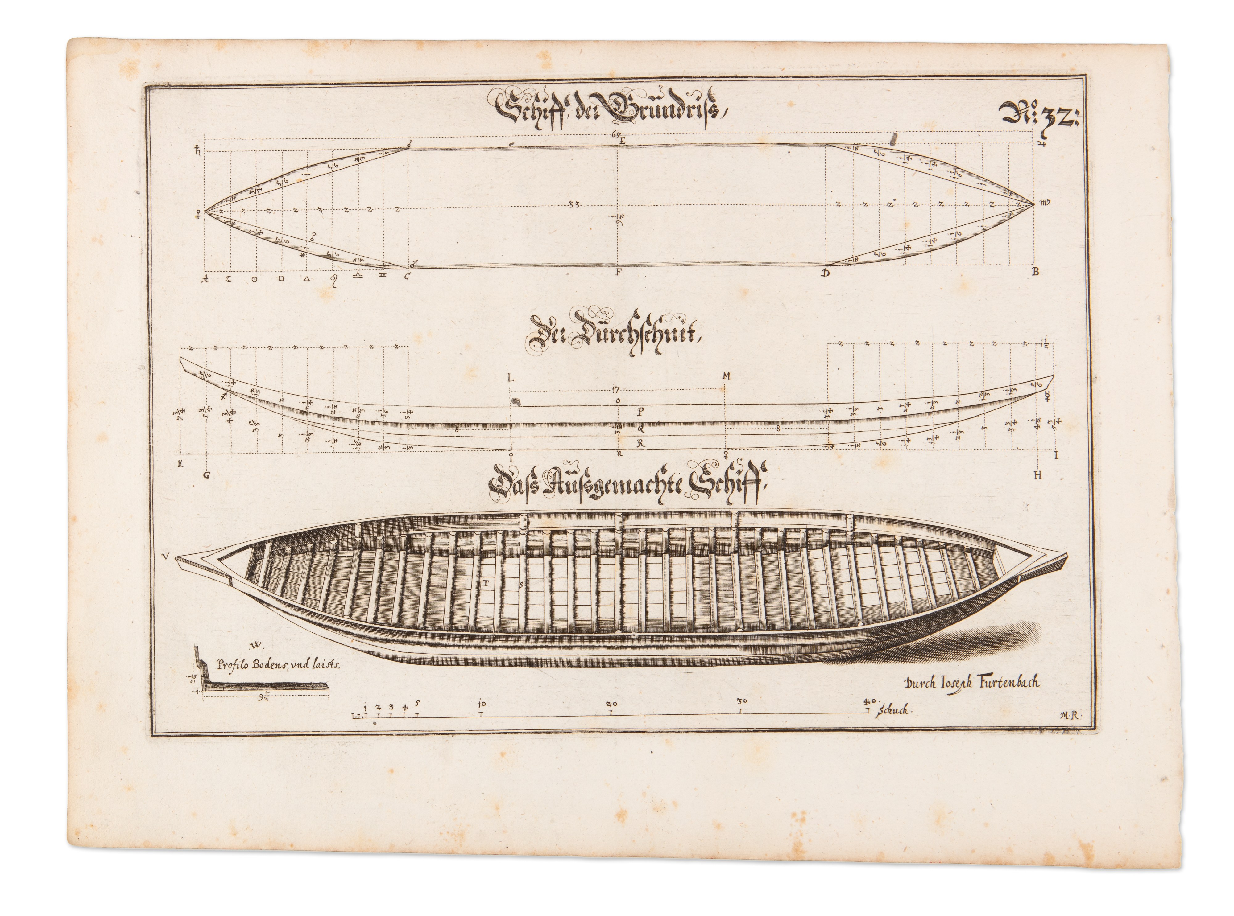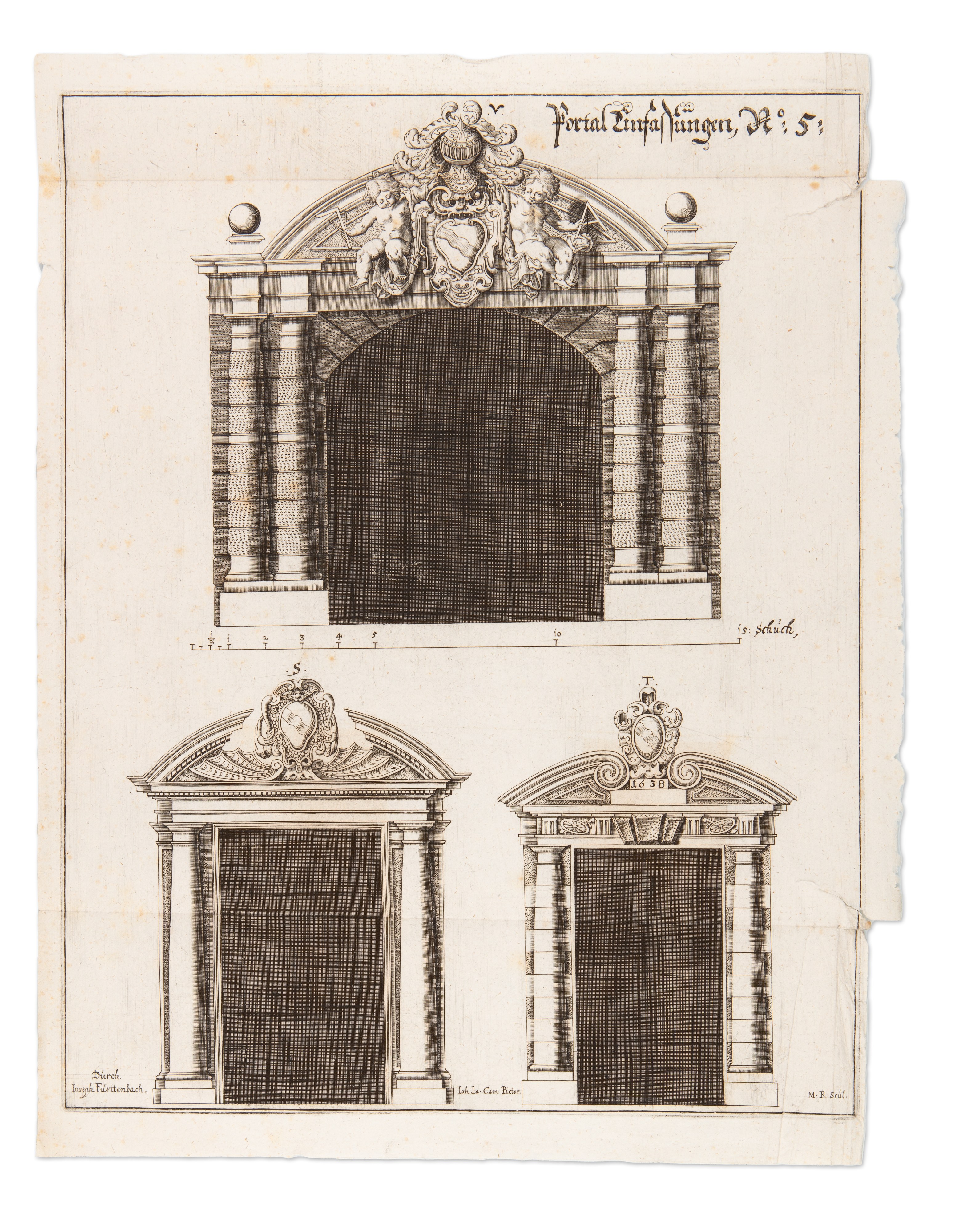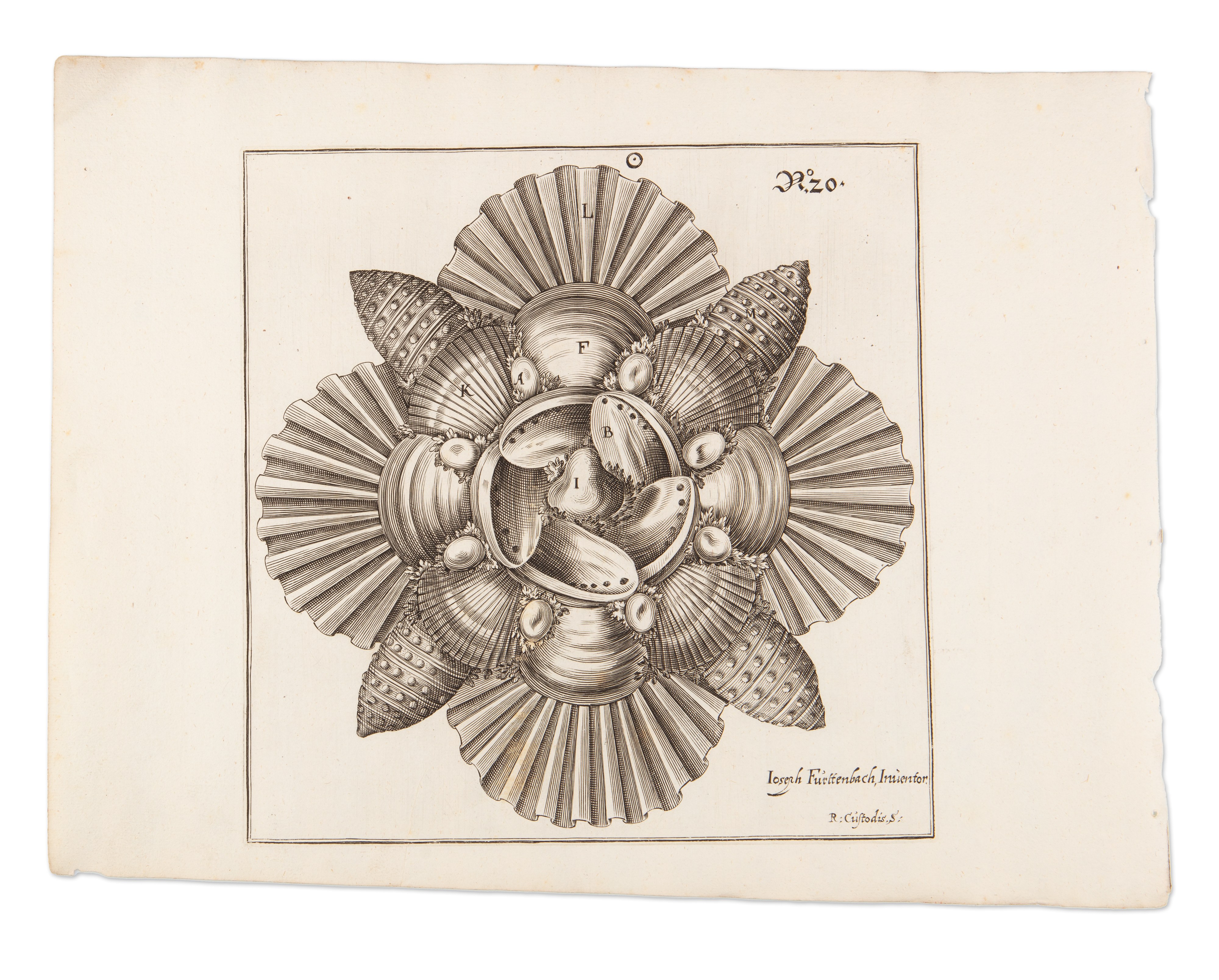 A collection containing approximately 70 technical drawings and floor plans, as well as 24 illustrations from key works by the architect, engineer and designer Joseph Furttenbach the Elder (1591-1667), author of important early Baroque treatises on architecture: Architectura civilis (1628), Architectura martialis (1630), Architectura recreationis (1640) and Architectura privata (1641).