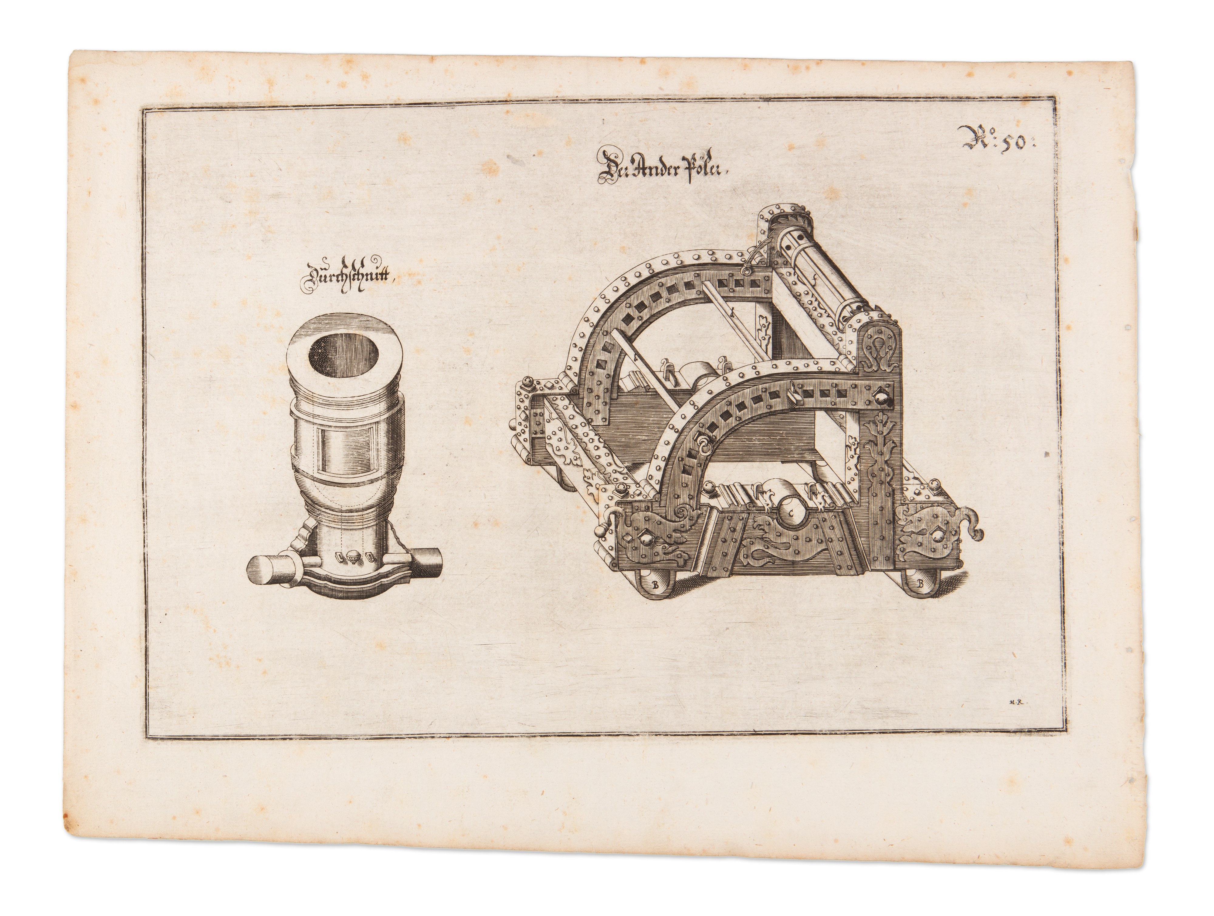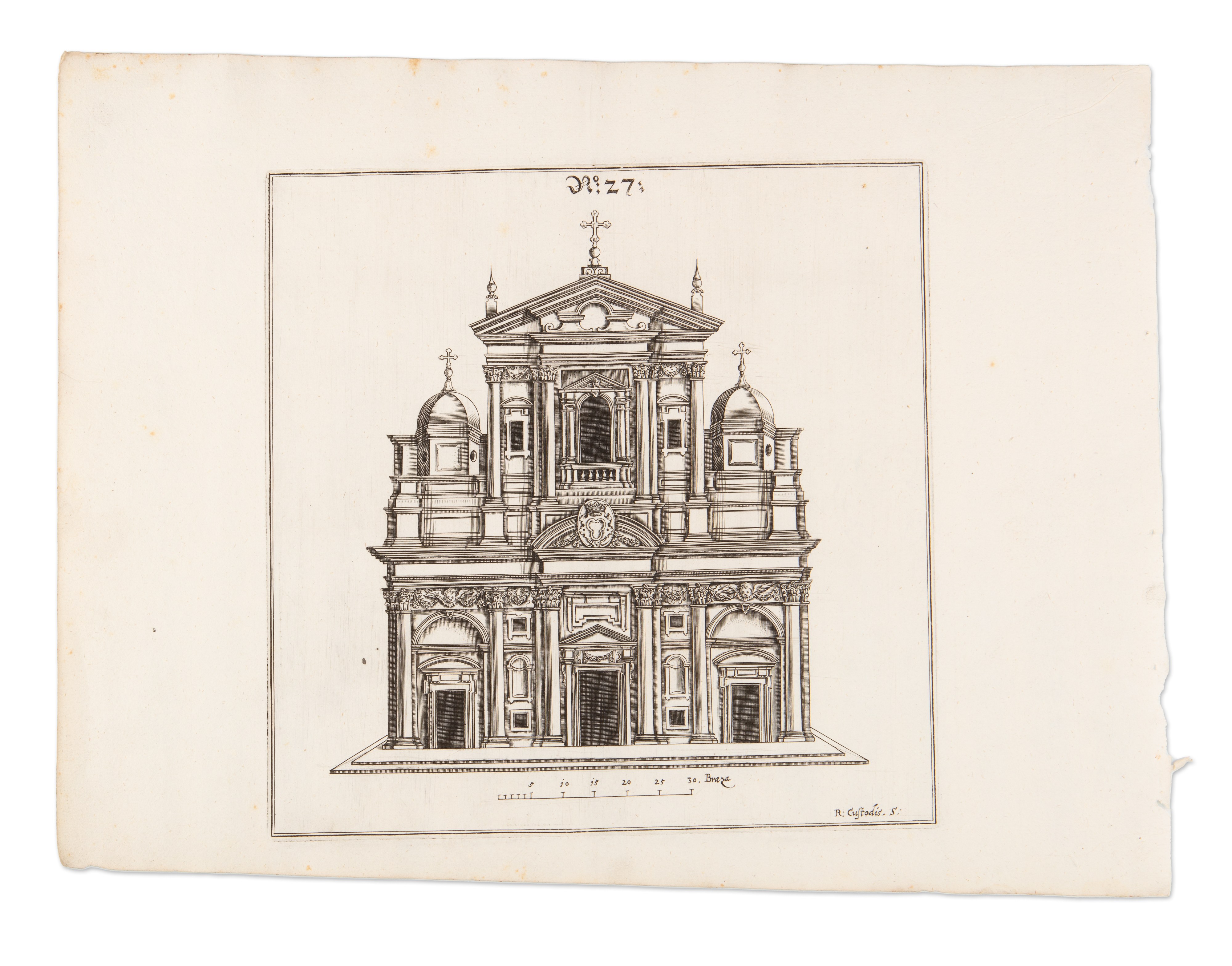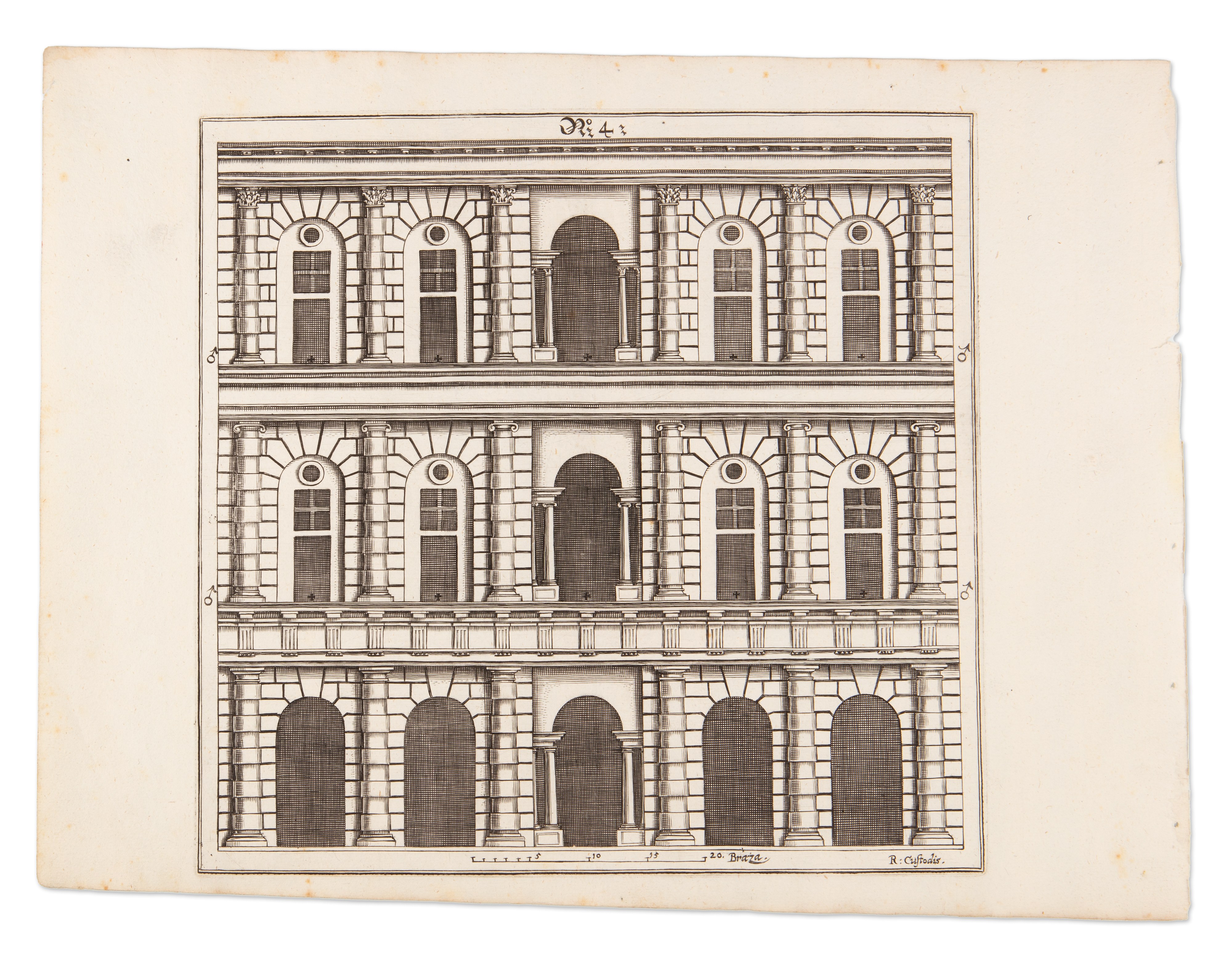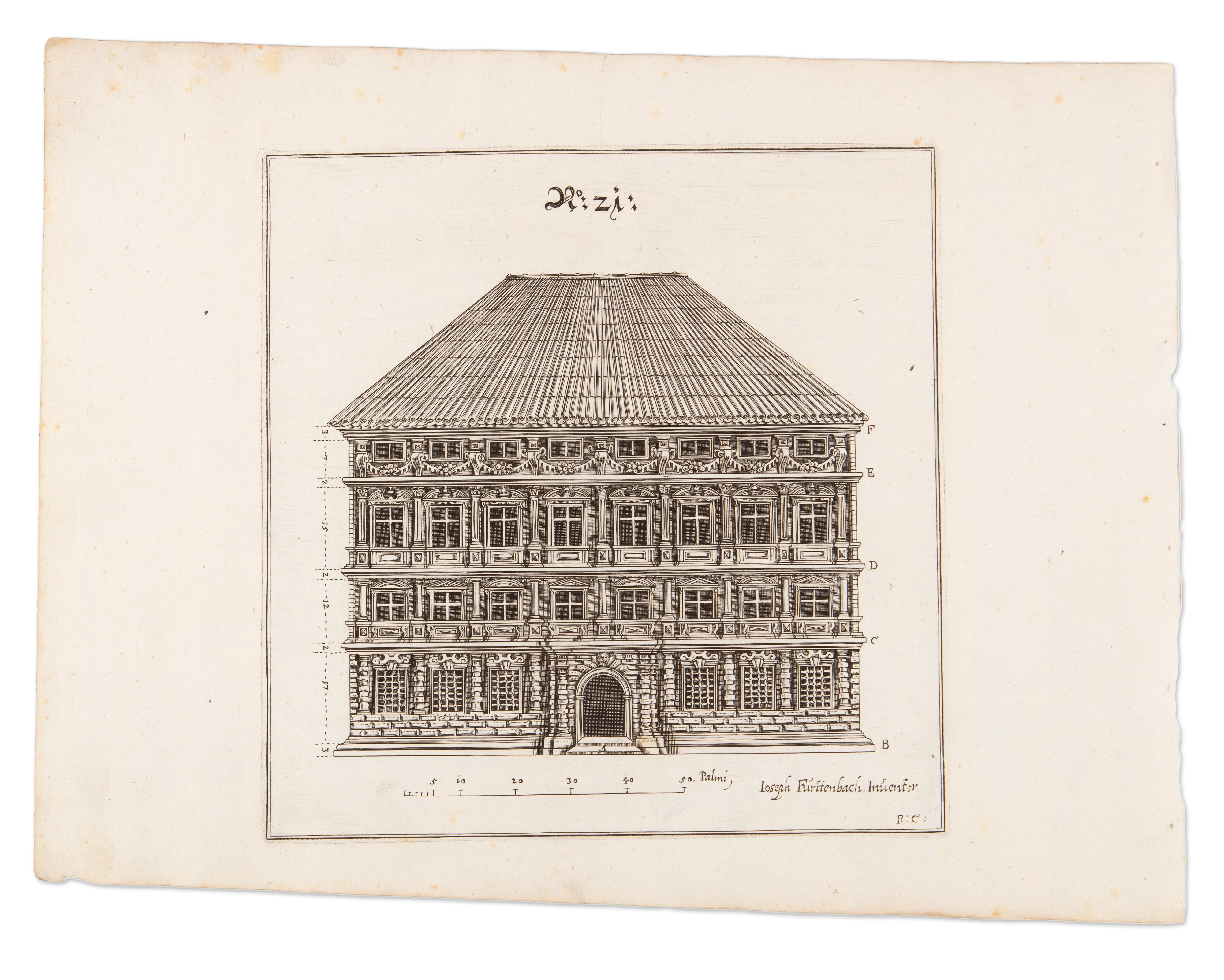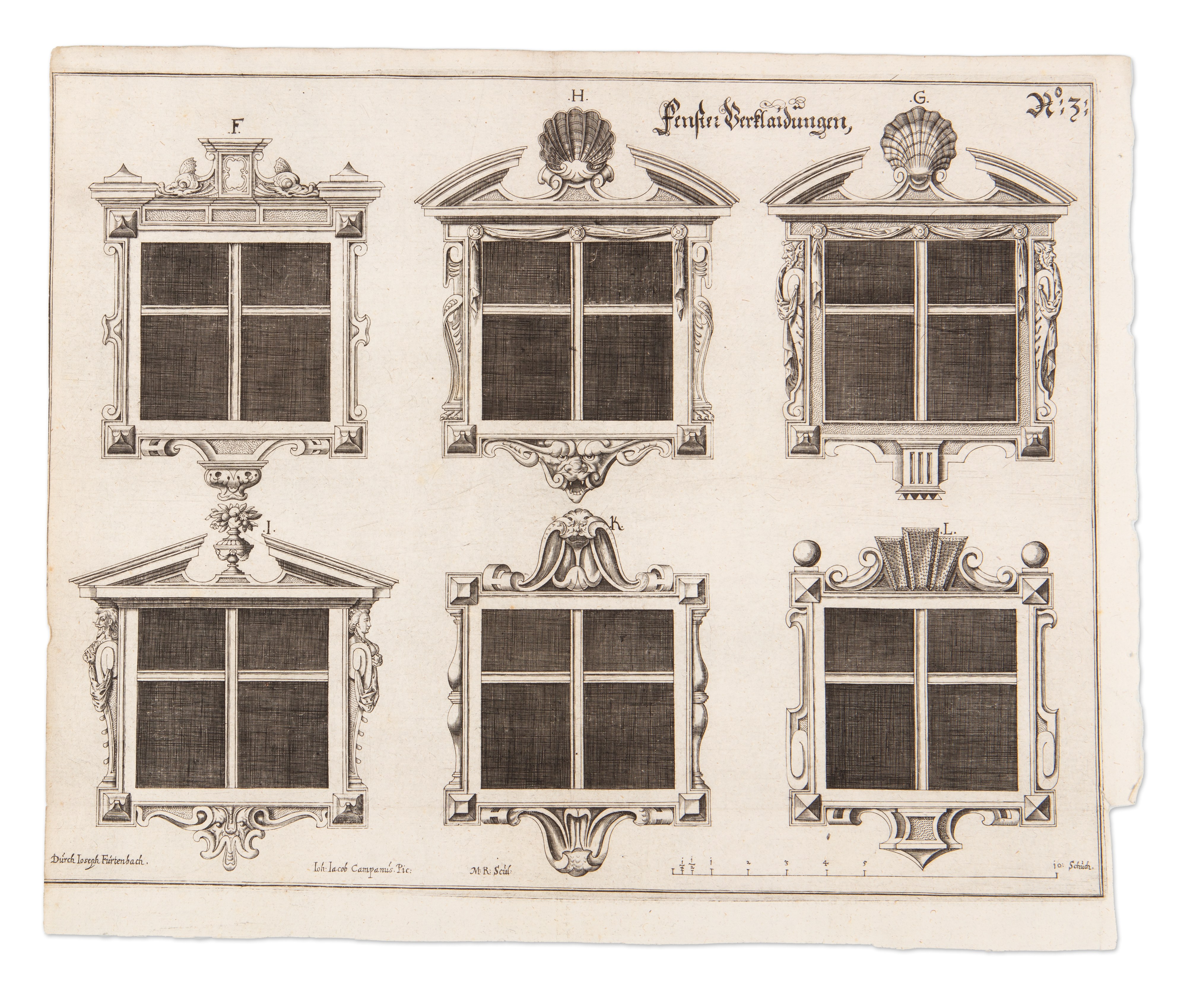 A collection containing approximately 70 technical drawings and floor plans, as well as 24 illustrations from key works by the architect, engineer and designer Joseph Furttenbach the Elder (1591-1667), author of important early Baroque treatises on architecture: Architectura civilis (1628), Architectura martialis (1630), Architectura recreationis (1640) and Architectura privata (1641).
