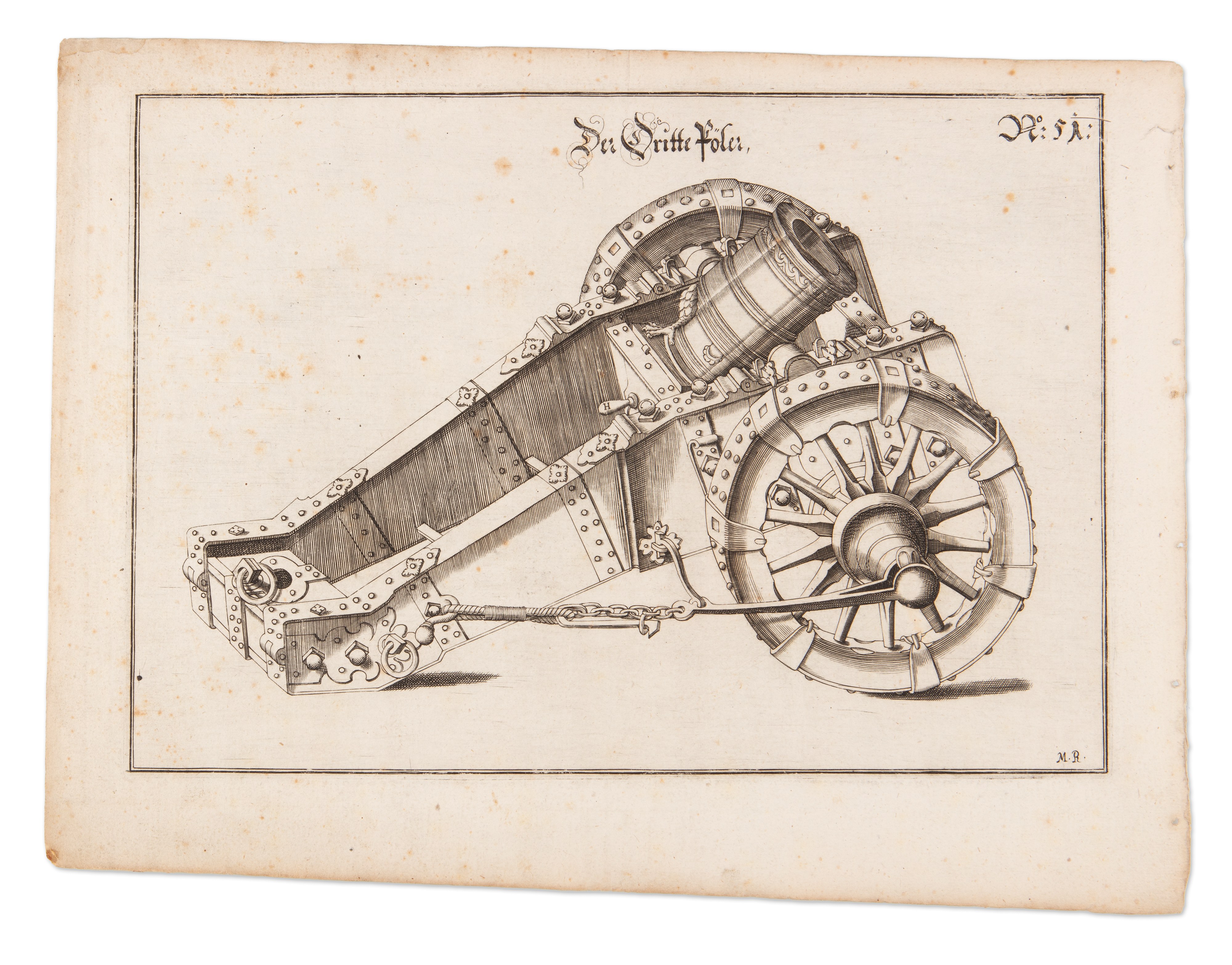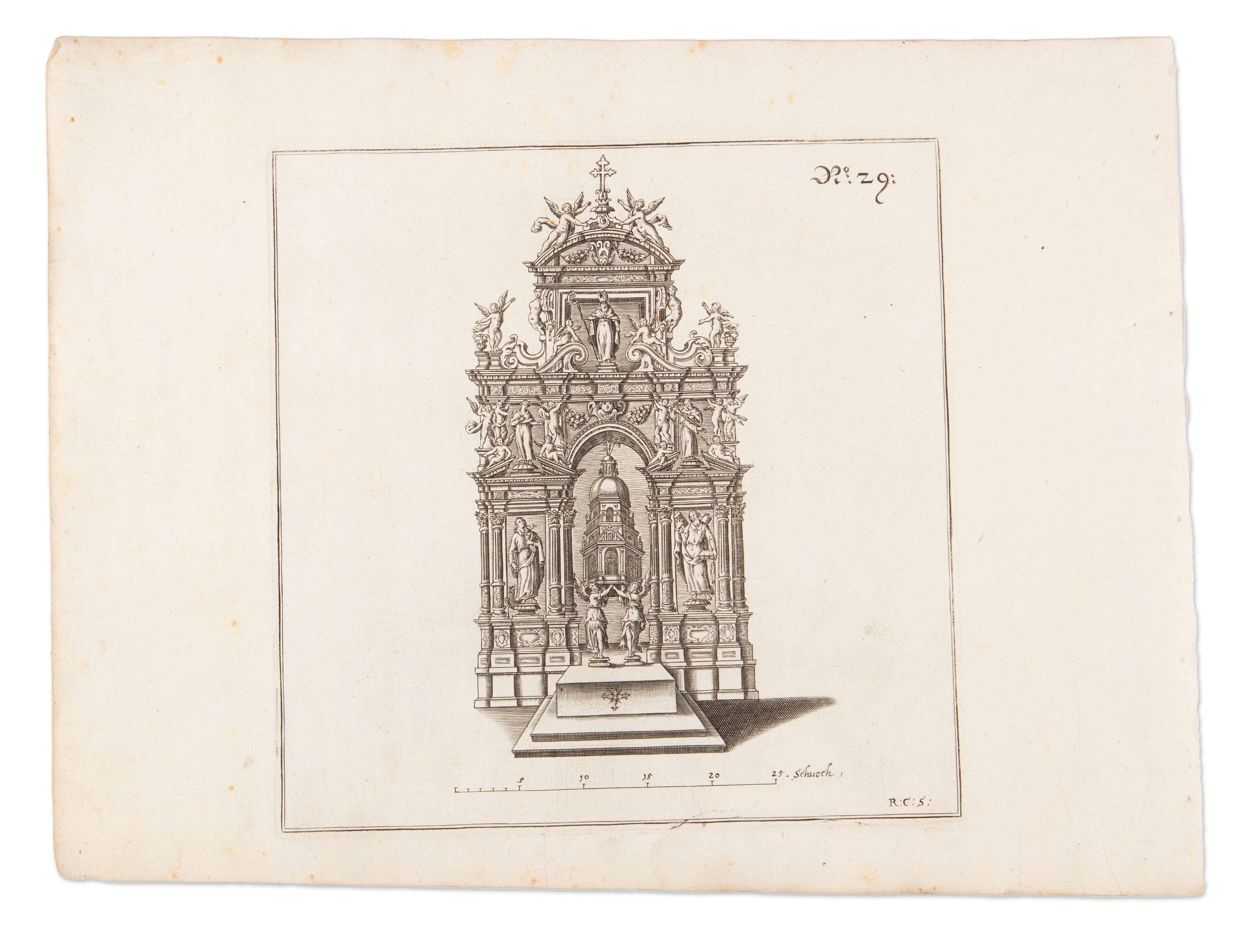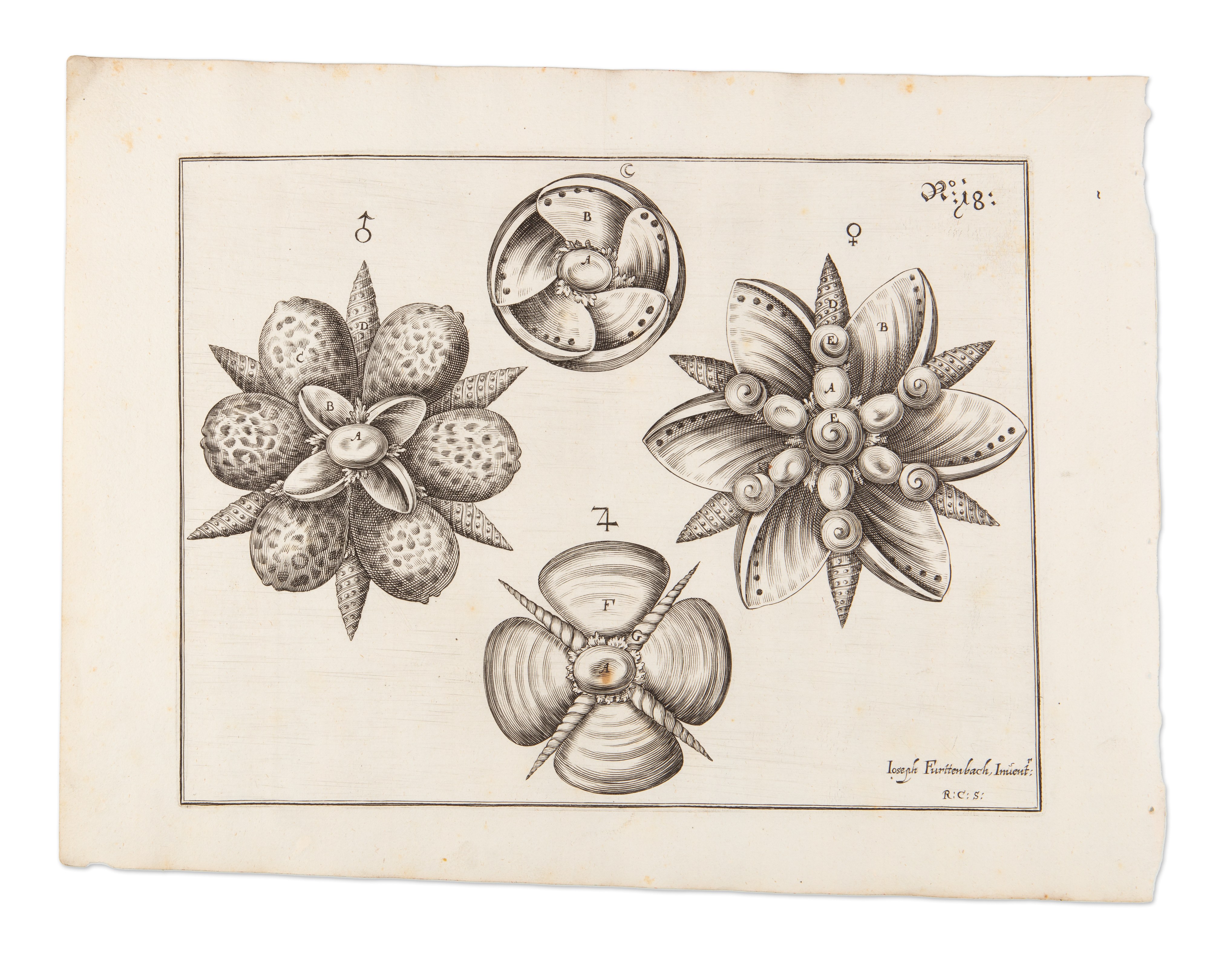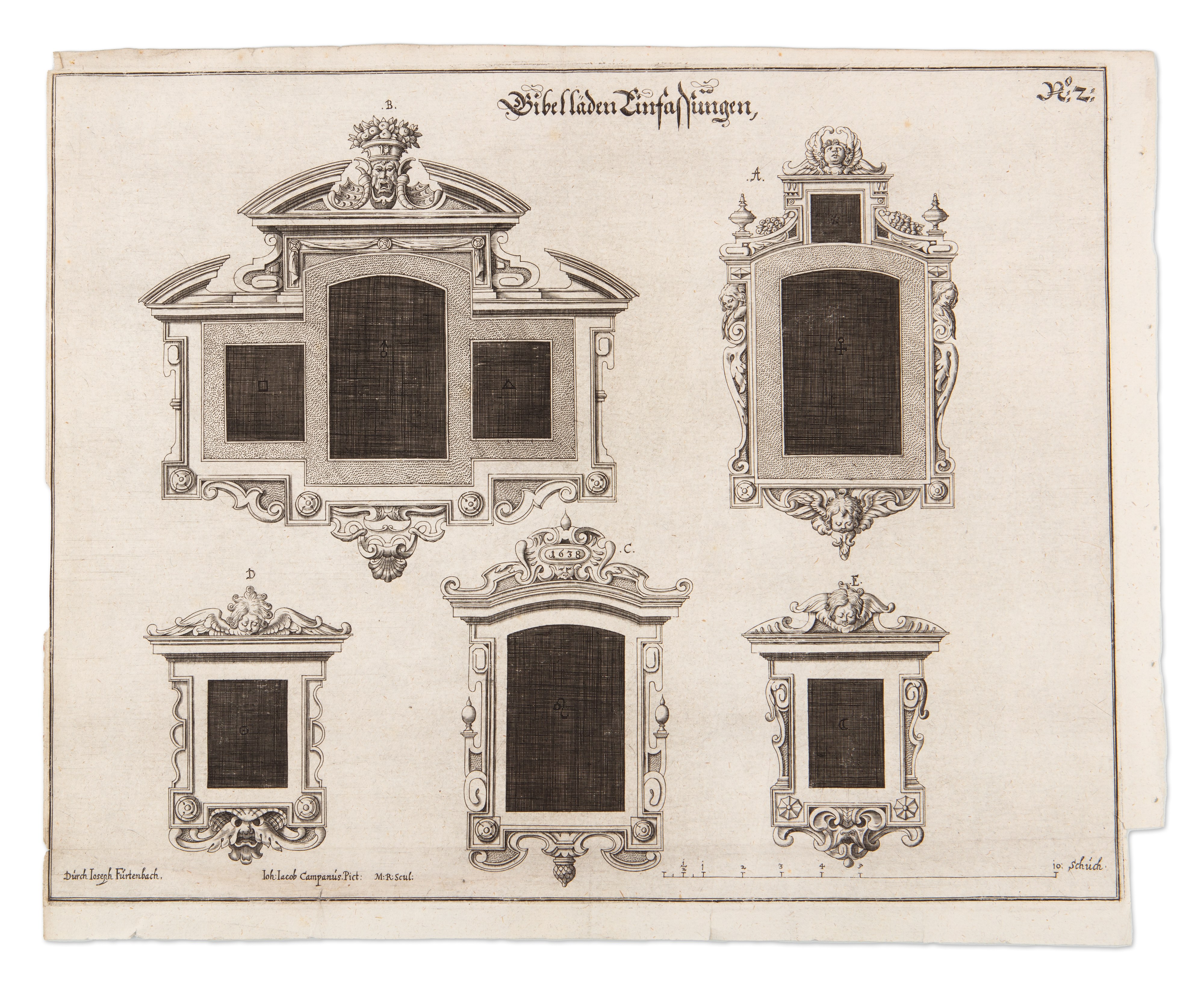 A collection containing approximately 70 technical drawings and floor plans, as well as 24 illustrations from key works by the architect, engineer and designer Joseph Furttenbach the Elder (1591-1667), author of important early Baroque treatises on architecture: Architectura civilis (1628), Architectura martialis (1630), Architectura recreationis (1640) and Architectura privata (1641).