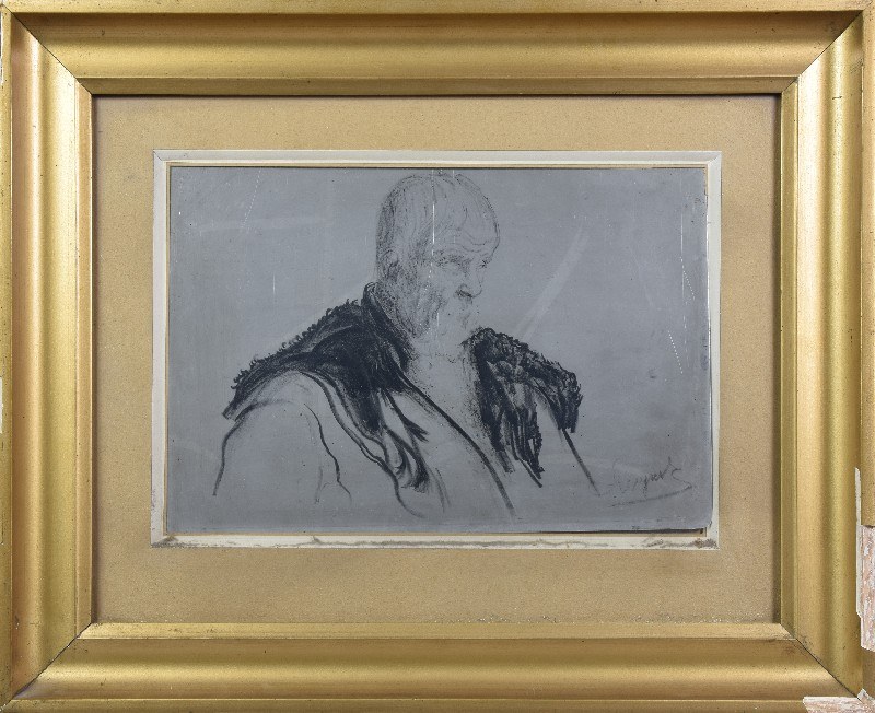 stan zachowania: wycięty prawy, górny narożnik (3,5 x 7,5 cm), liczne zadrapania płyty; ubytki ramy; na odwrocie papierowa nalepka z orzeczeniem mgr. Leszka Ludwikowskiego, Kraków 5 stycznia 1978.
