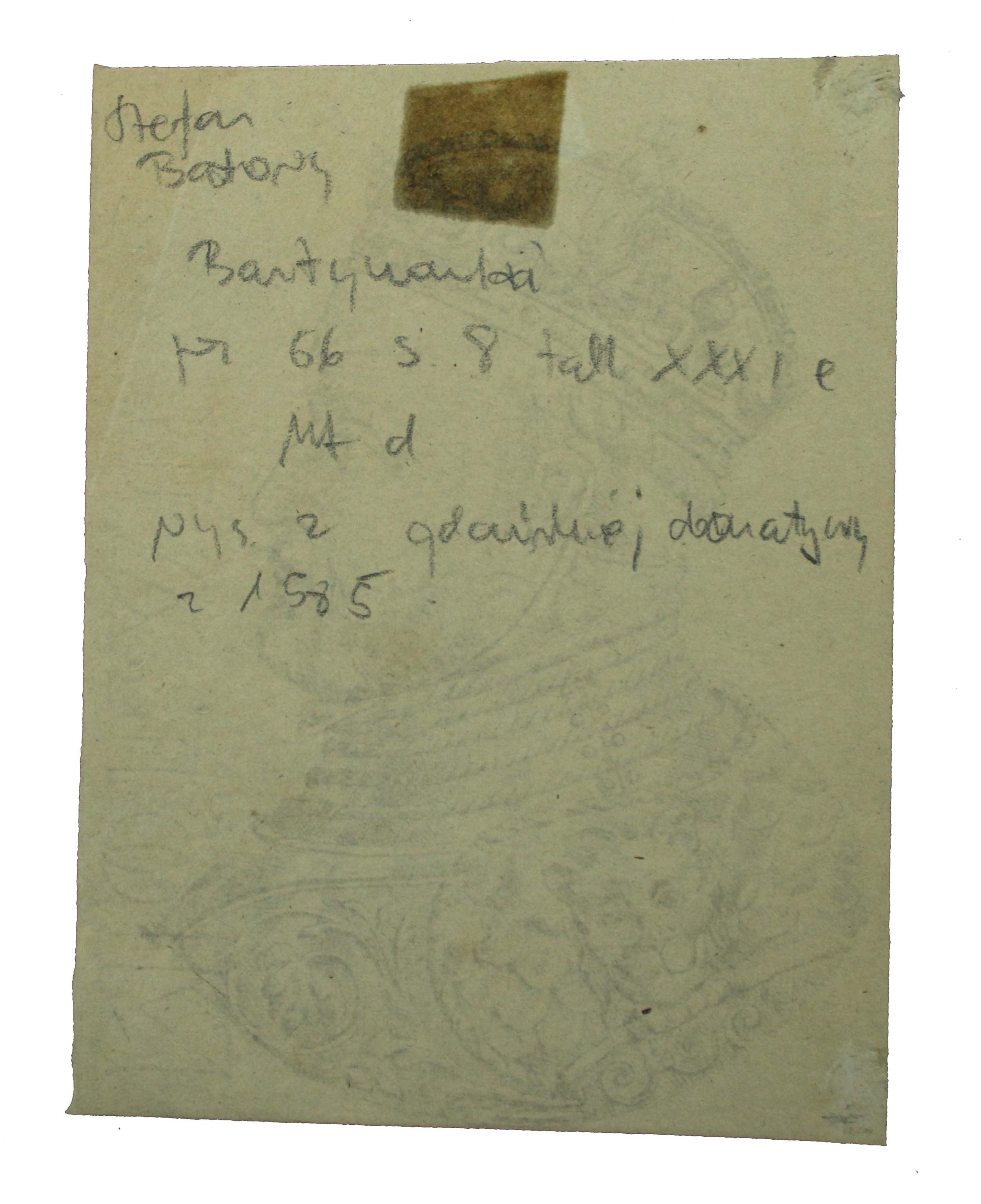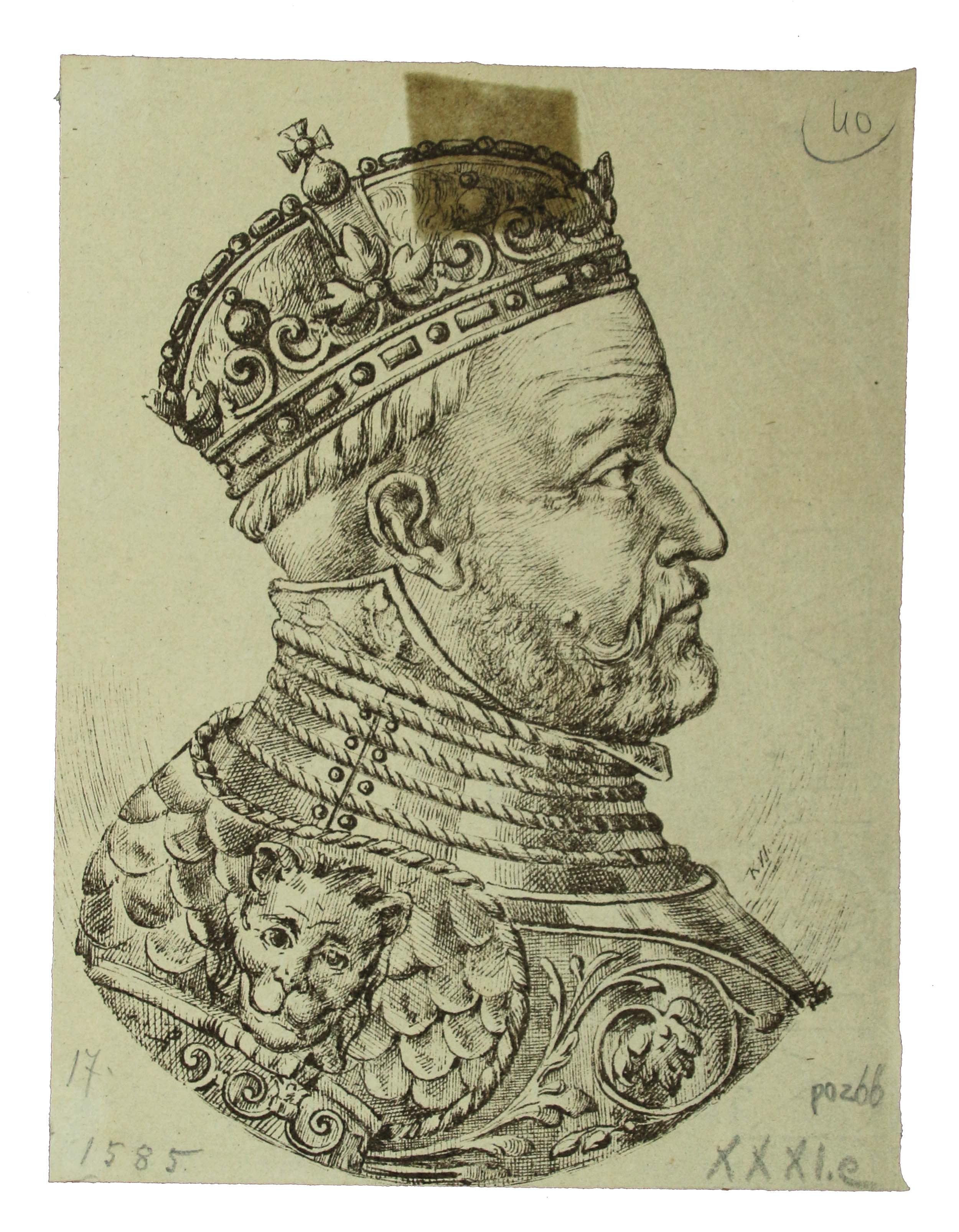 Litografia przedstawiająca Stefana Batorego z pracy Władysława Bartynowskiego "Wizerunki królów, uzbrojenie i wojsko polskie", 1908. Wym. 13,5 x 10 cm. Rys. przez K. Wawrosza.