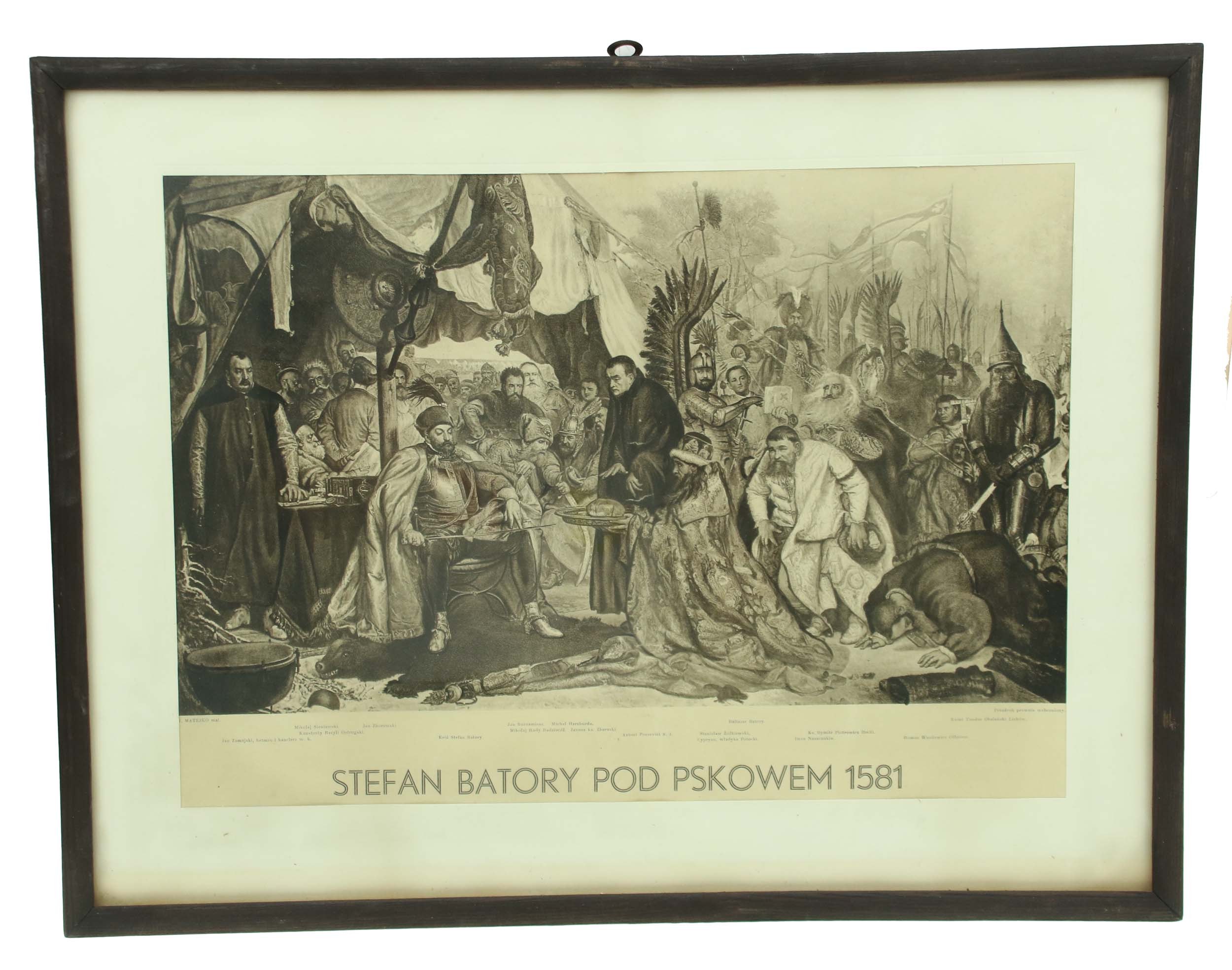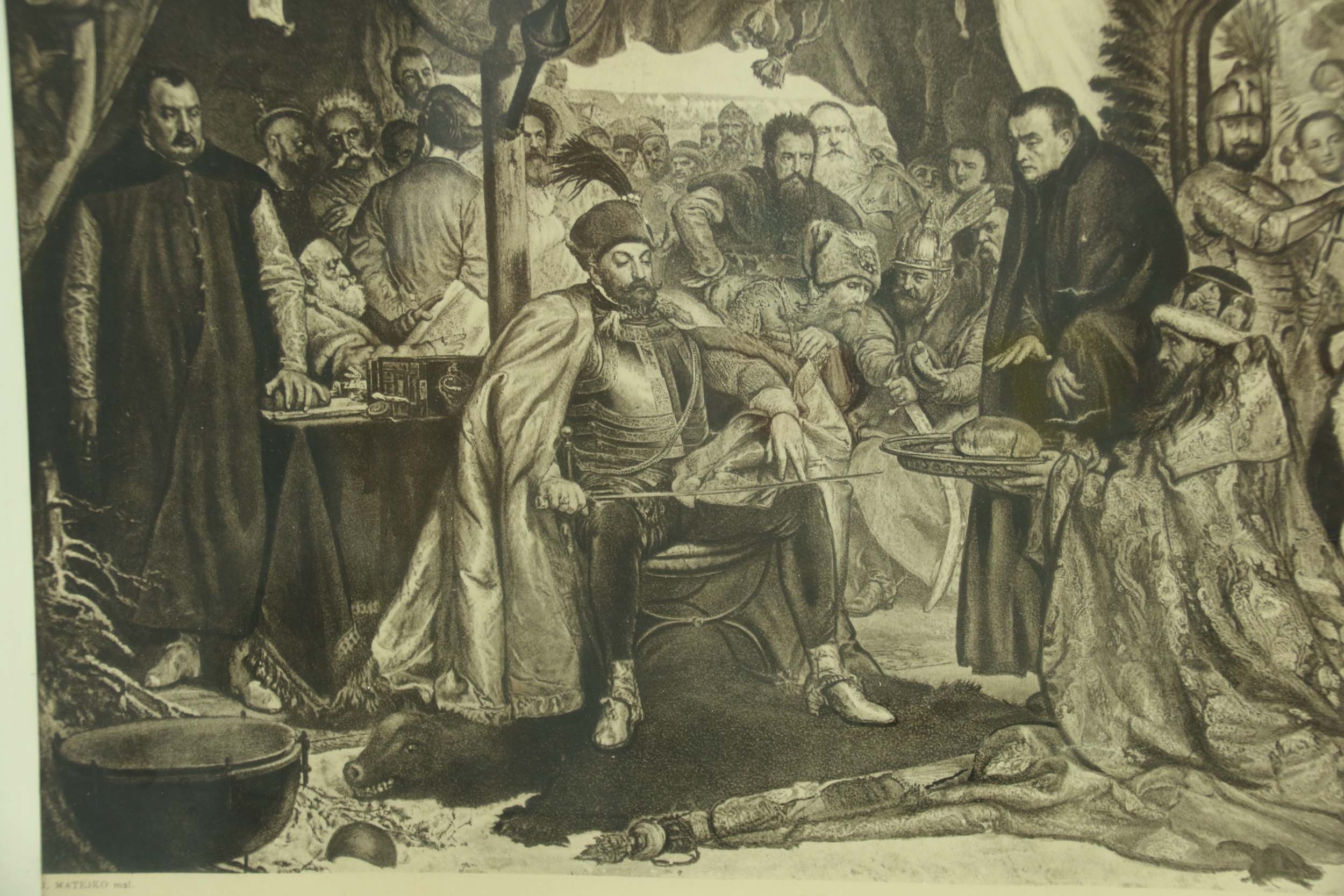 Litografia-reprodukcja obrazu J. Matejki "Stefan Batory pod Pskowem". Wym. litografii 44,5 x 31,5 cm, Wym. ramy 43 x 56 cm