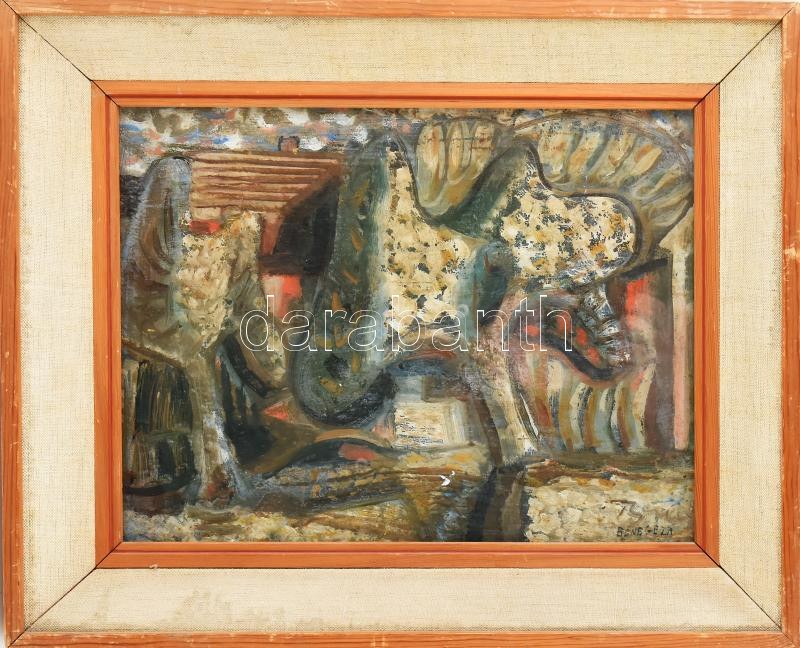 Bene Géza (1900-1960): Táj. Olaj, falemez. Jelezve jobbra lent. Hátoldalán BÁV 93. decemberi aukció címkéjével és autográf felirattal. Üvegezett keretben. 25x32 cm / oil on wood, signed lower right, framed