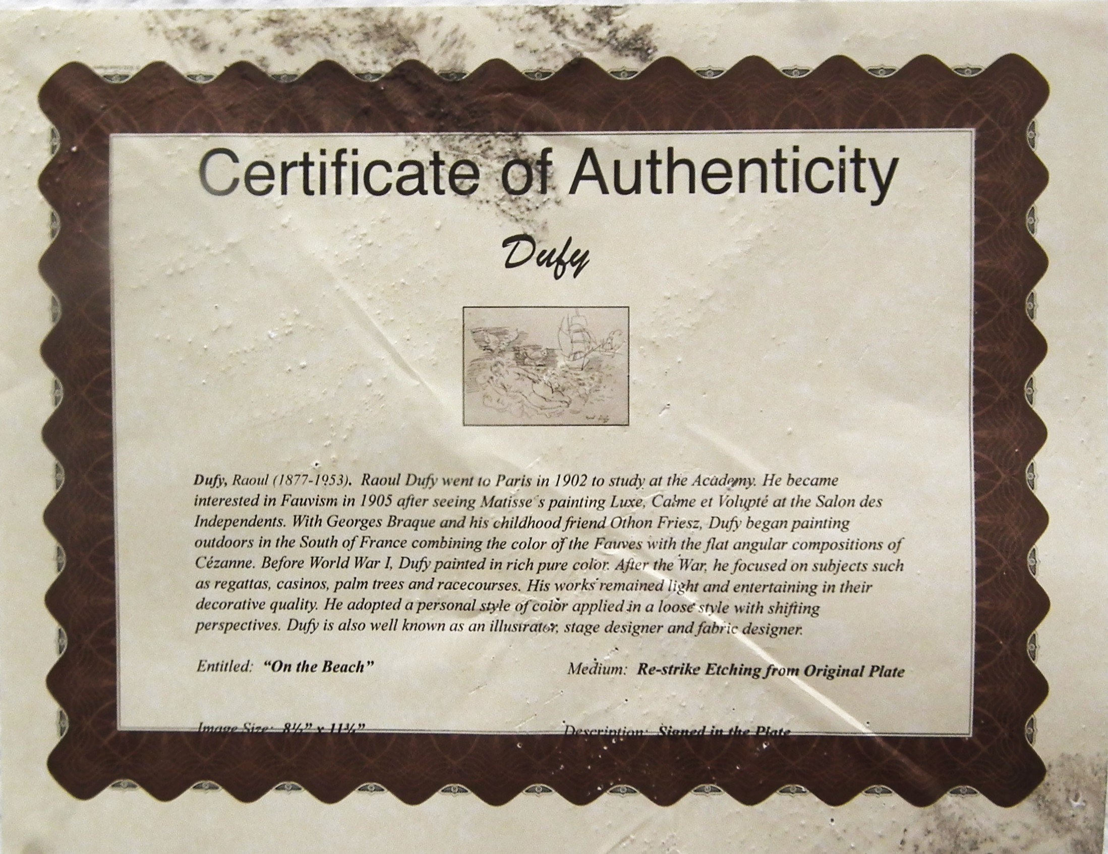 Akwaforta „re-strike” na tincie, papier welinowy Arches France o wysokiej gramaturze; 22 x 30 (odcisk płyty), 38 x 48 (arkusz), sygn. z płyty pod kompozycją „Raoul Dufy”,