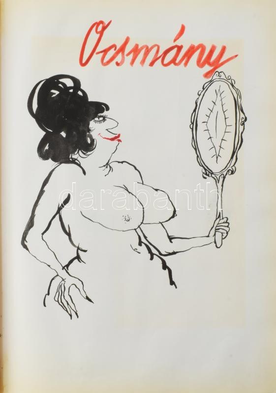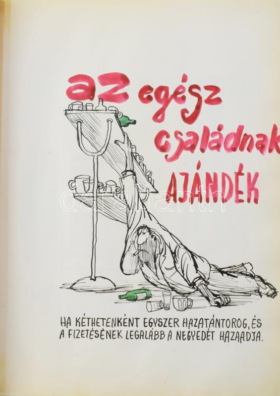 Rau Tibor (1934-2009), 26 db mű: Kiváló áruk fóruma - anti reklám, 1975. Mappa 26 db, részben erotikus karikatúrával. Akvarell, tus, kollázs. Jelzett a borítón (egyes lapok jelzés nélkül). Mappába ragasztva. 29×21,5 cm