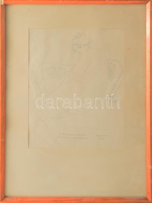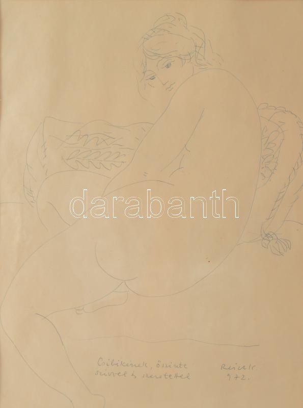 Reich Károly (1922-1986): Női akt, 1972. Toll, papír, jelzett, Reich Károly autográf ajándékozási soraival Ury Ibolya ...