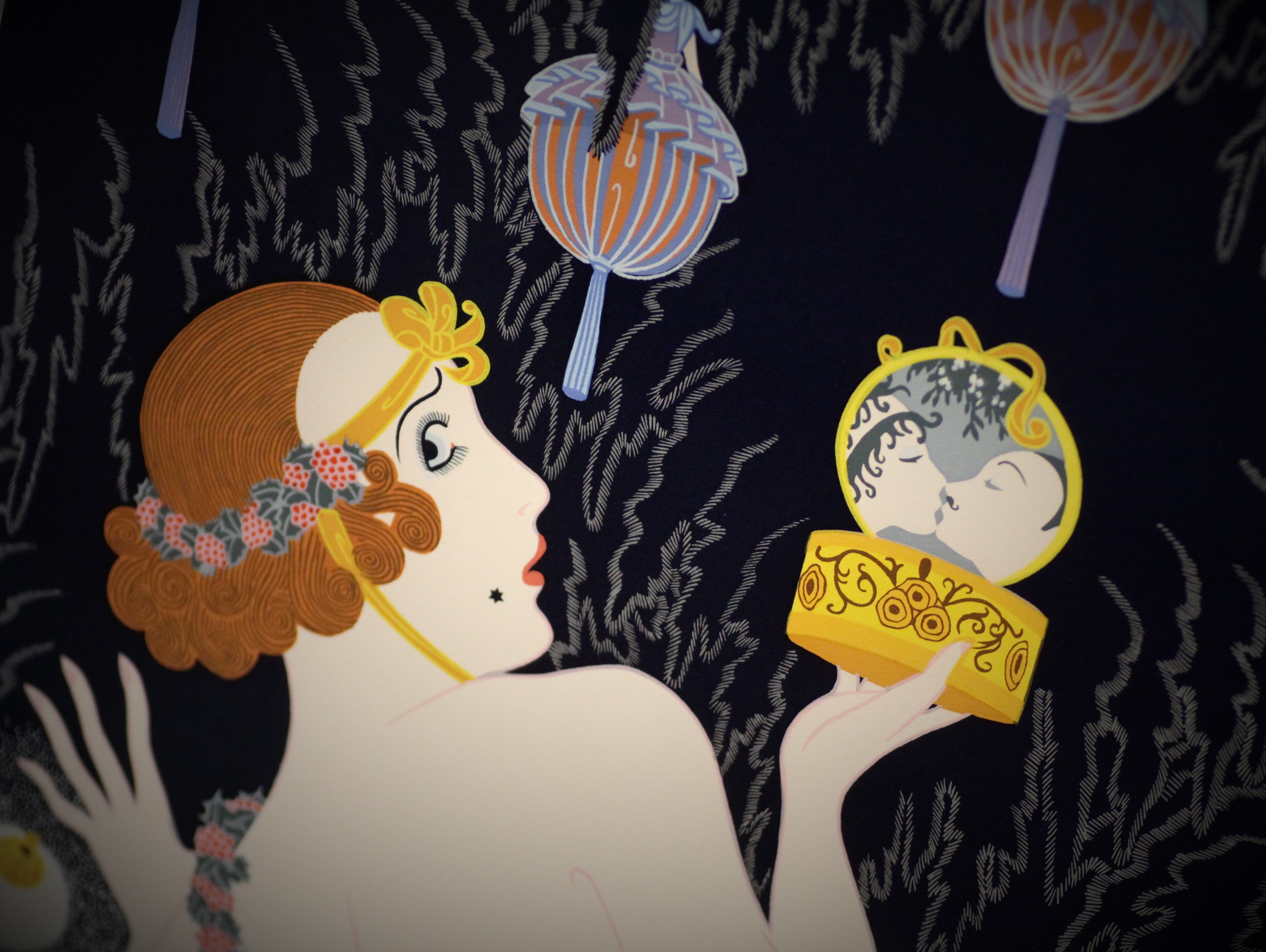 ERTÉ (Romain de TIRTOFF) [1892-1990] francuski artysta pochodzenia rosyjskiego. Jego pseudonim zaczerpnięty został z francuskiego brzmienia inicjałów. Erté był wszechstronnym artystą, nazywanym ojcem art deco. Był czynny na wielu polach takich jak malarstwo, grafika i projektowanie kostiumów, biżuterii i scenografii teatralnych. Artysta współpracował z magazynem Harper’s Bazaar poświęconym modzie. Na fali odrodzenia stylu art. deco w latach sześćdziesiątych Erté zajał się tworzeniem limitowanych sitodruków, w których można odnaleźć wpływy jego wcześniejszych projektów scenograficznych i kostiumowych. Dwa lata przed smiercią Erté zaprojektował również limitowane butelki i opakowania koniaku Courvoisier.