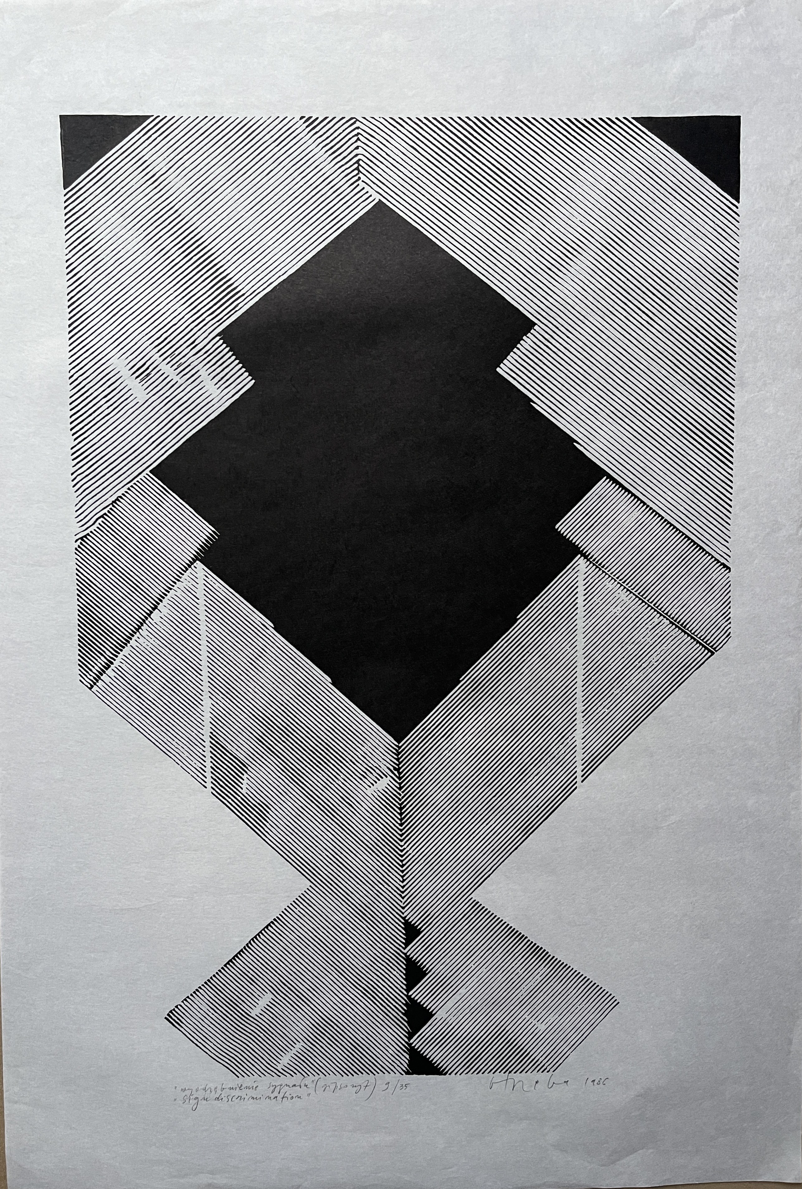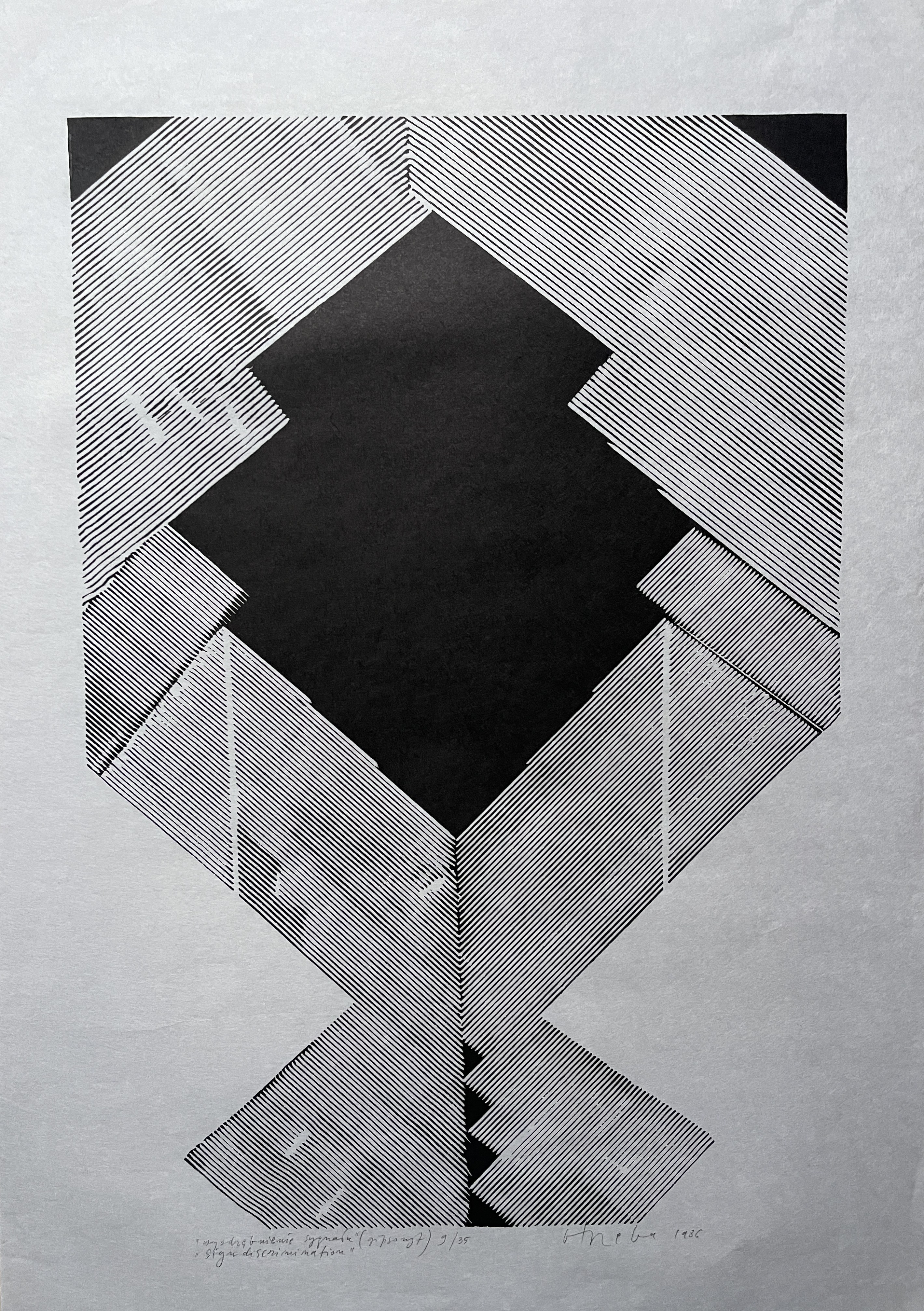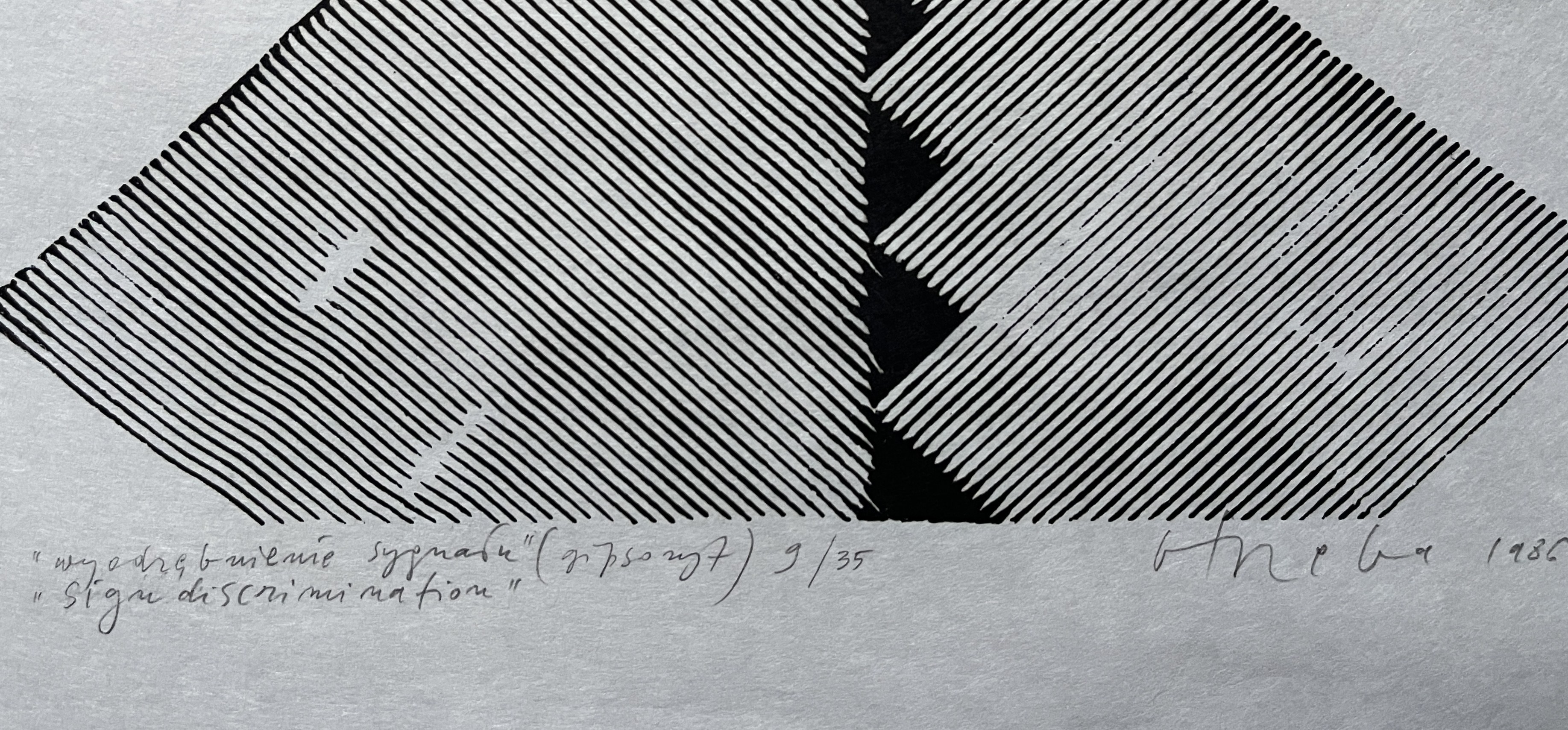 grafika (gipsoryt) papier, wym. 87 x 60 cm, sugn. i opisany u dołu kompozycji " Wyodrębnienie sygnału/Sign discrimination; gipsoryt; 9/35; Otręba 1986" ołówkiem