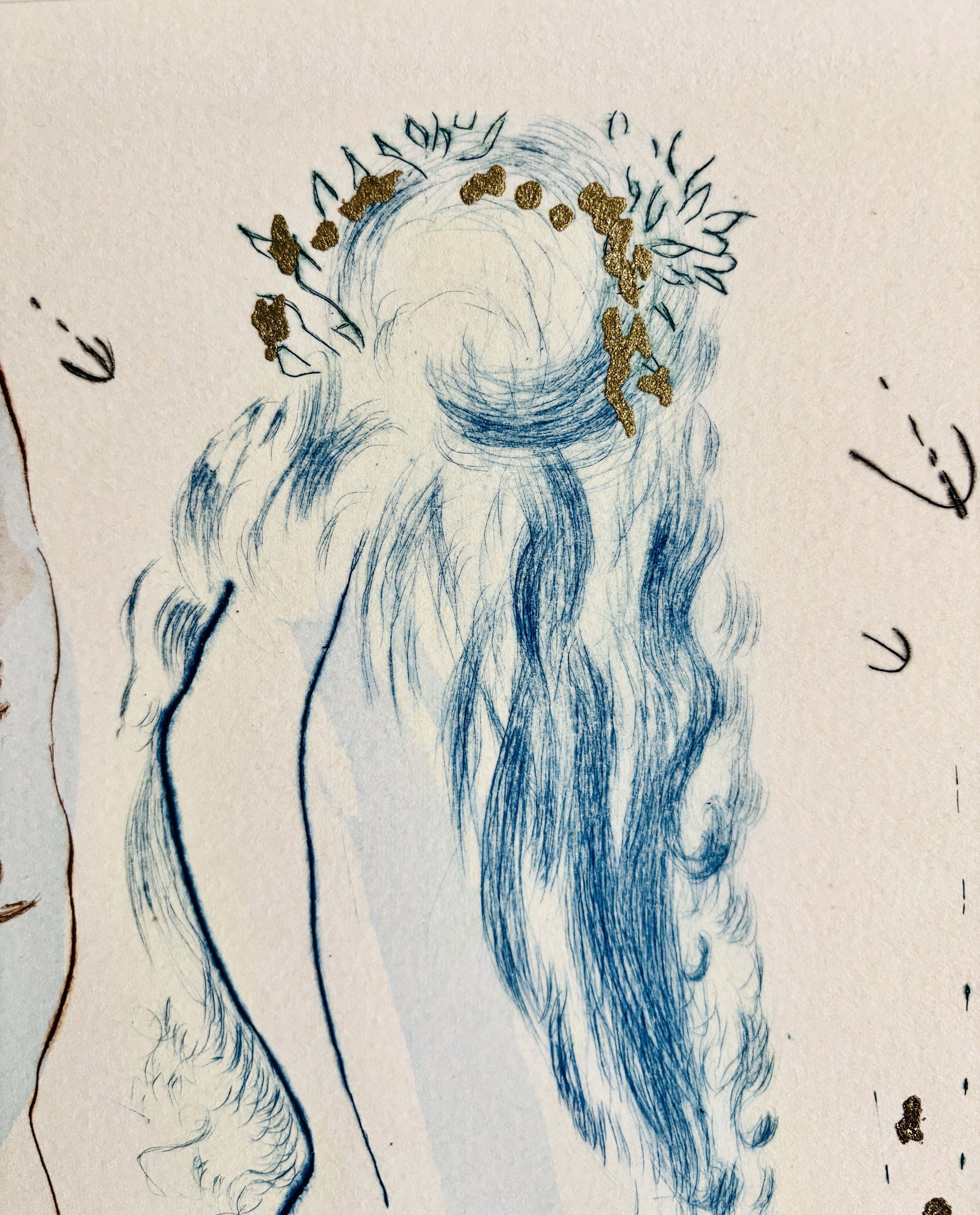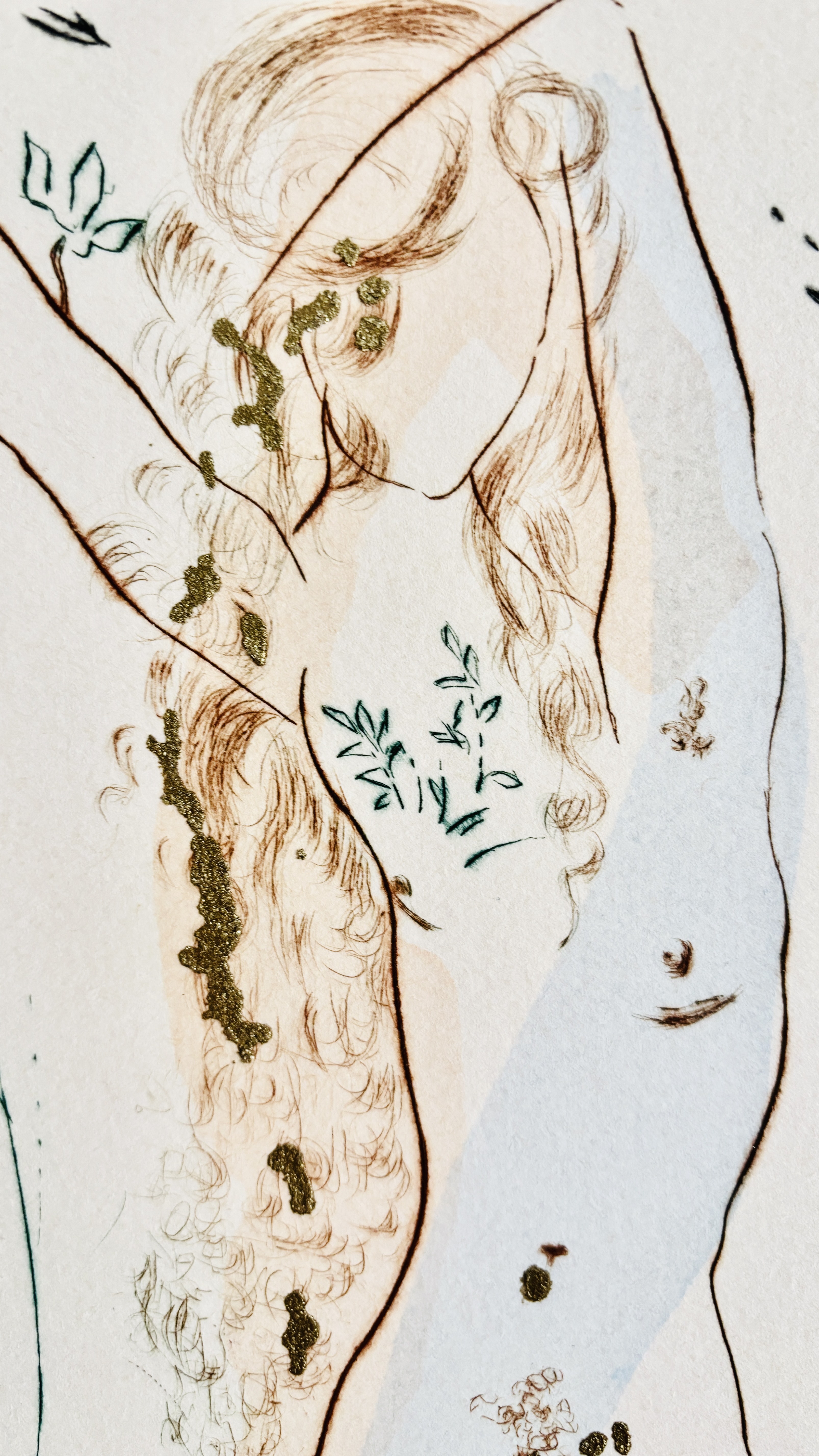 Akwaforta, sucha igła, z ręcznie naniesionymi złoceniami, papier Arches, wymiary: 58 x 37 cm , oprawiona w złota ramę, jedna z 12 akwafort z teki Pieśń nad Piesniami Salomona. Wydana w 1971 r., opublikowana przez Leon Amiel, Nowy Jork. Edycja limitowana, numerowana ręcznie ołówkiem 102/250, podpisana ołówkiem przez Autora p.d.