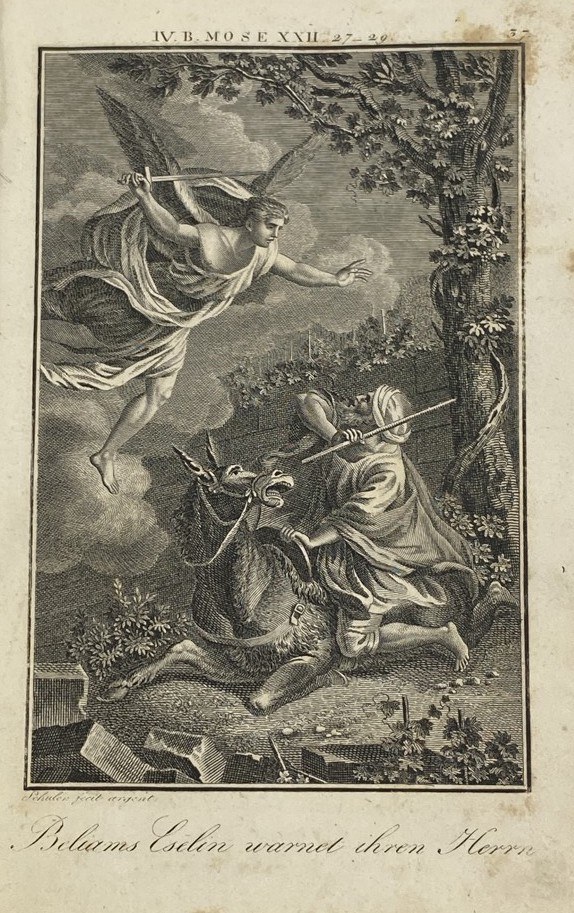 "Beliams eselin warnet ihren Herrn", ilustracja z "Biblii w obrazkach" wydanej w połowie XIX wieku, miedzioryt, wymiary ryciny ok. 9 x 14 cm, na papierze o wymiarach ok. 11,5 x 18 cm, niewielkie zabrudzenia