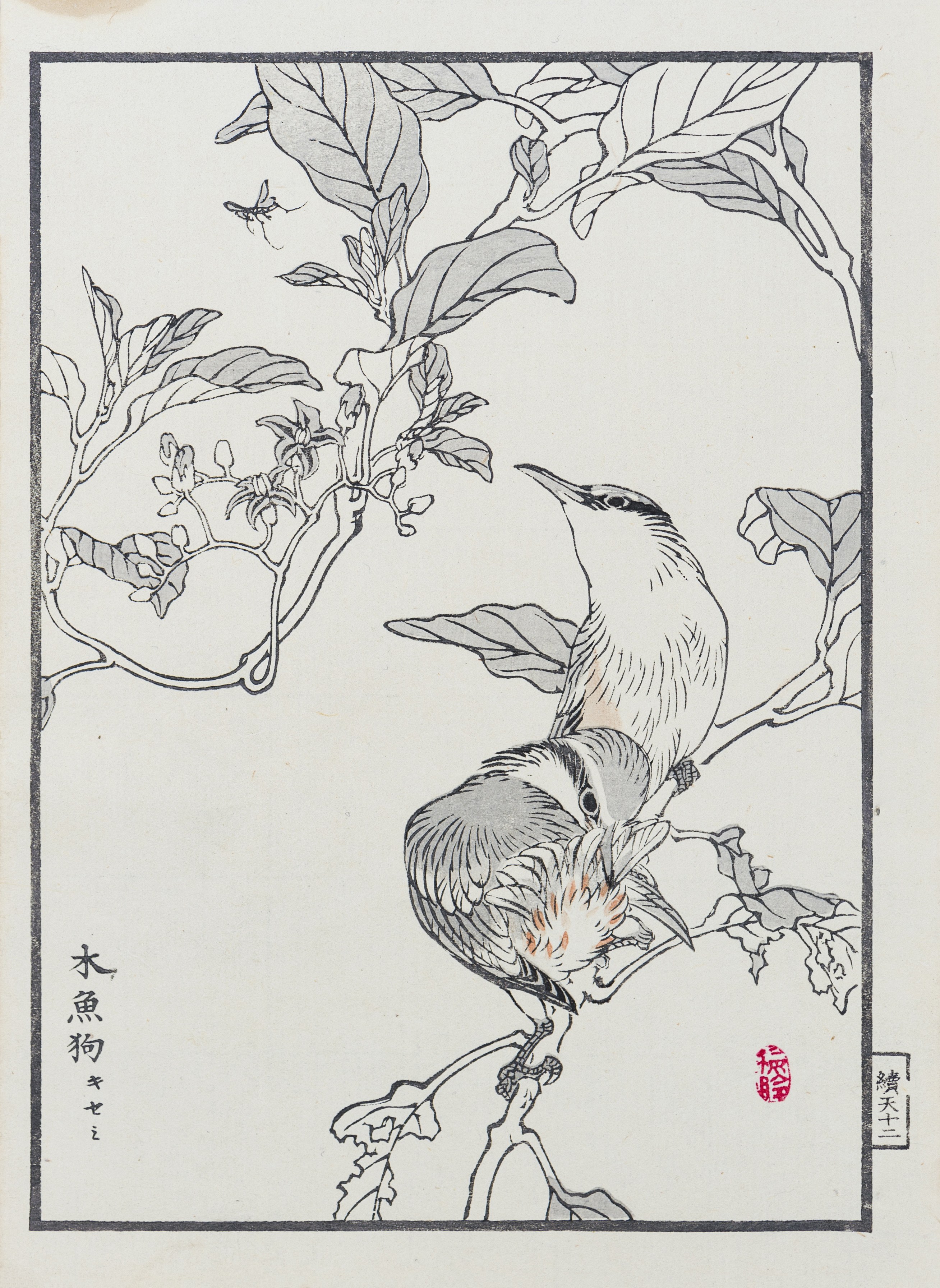 Analogiczny drzeworyt znajduje się między innymi w kolekcji Metropolitan Museum of Art w Nowym Jorku, British Museum w Londynie oraz Art Institute w Chicago. Praca pochodzi z albumu zatytułowanego: Bairei hyakuchō gafu (Album Bairei z obrazami stu ptaków) wydanego w Tokio w latach 1881-1884 (Meiji 11-14) przy współpracy z Okura Magobei. Album ten został zarejestrowany pod numerem 40070693 w japońskiej bibliotece narodowej National Diet Library.