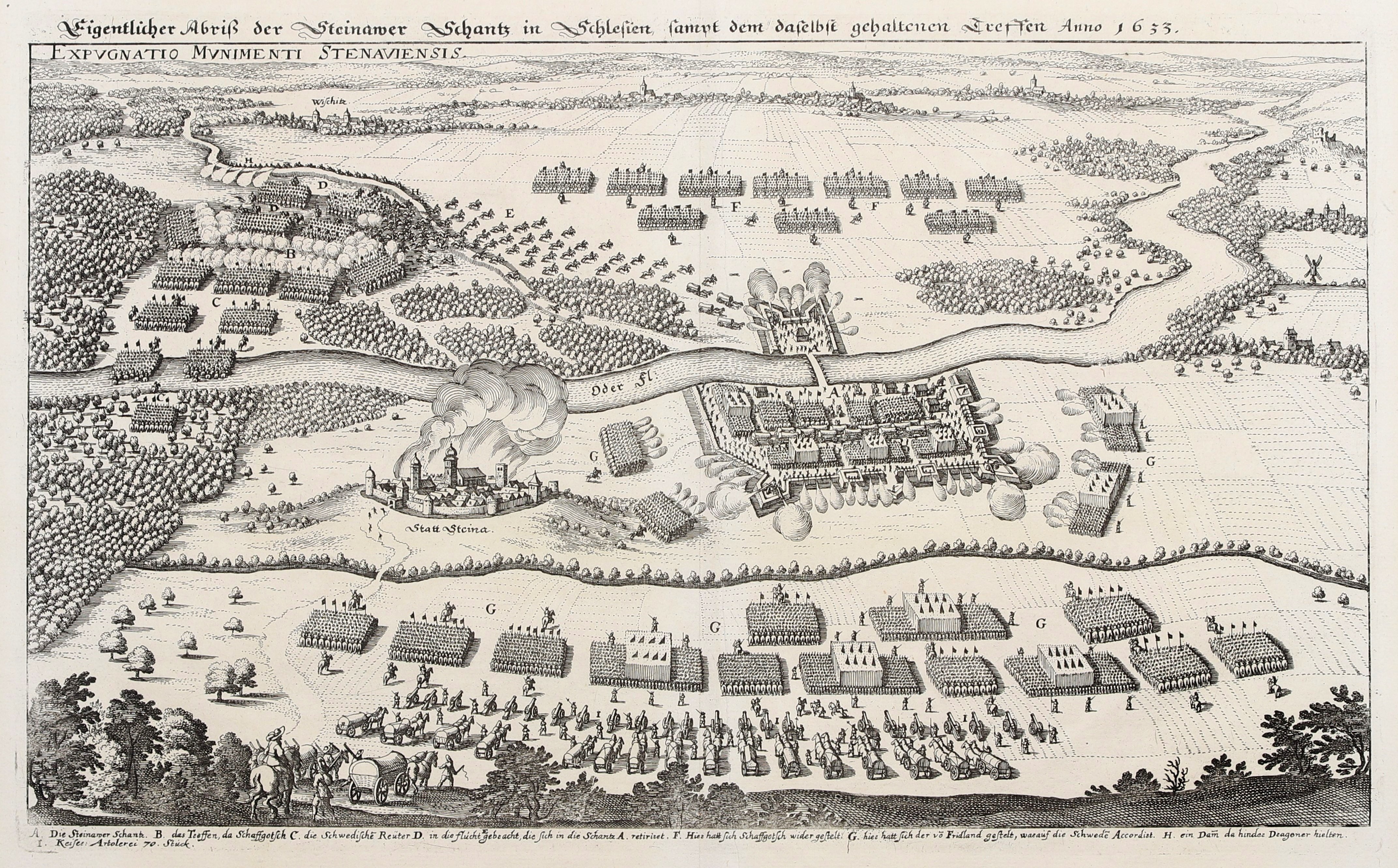 ŚCINAWA. Panorama miasta podczas oblężenia w 1633 r.; Merian, ok. 1670.
