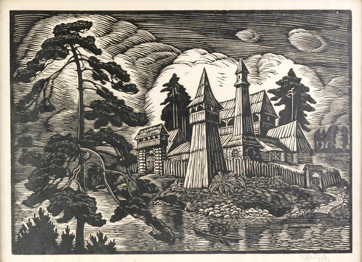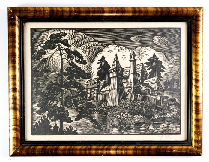 Skoczylas 155. Drzeworyt form. 22,9x32,2 na ark. 26,5x36 cm (w świetle ramy). Na dolnym marginesie z prawej odręczna ołówkowa sygnatura artysty. Odbitka z 1929. Drzeworyt w starej drewnianej ramie, za szkłem. Stan dobry.