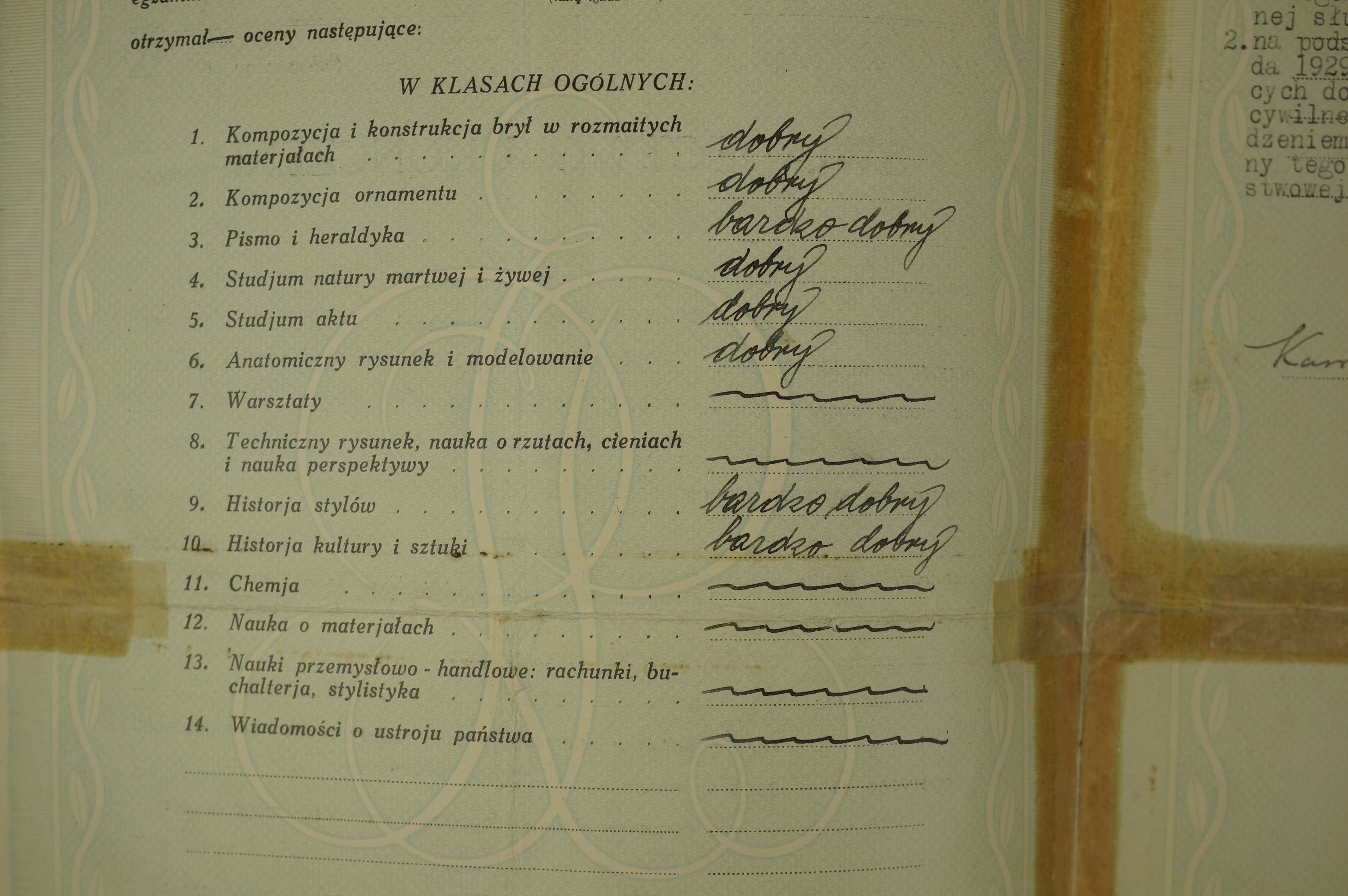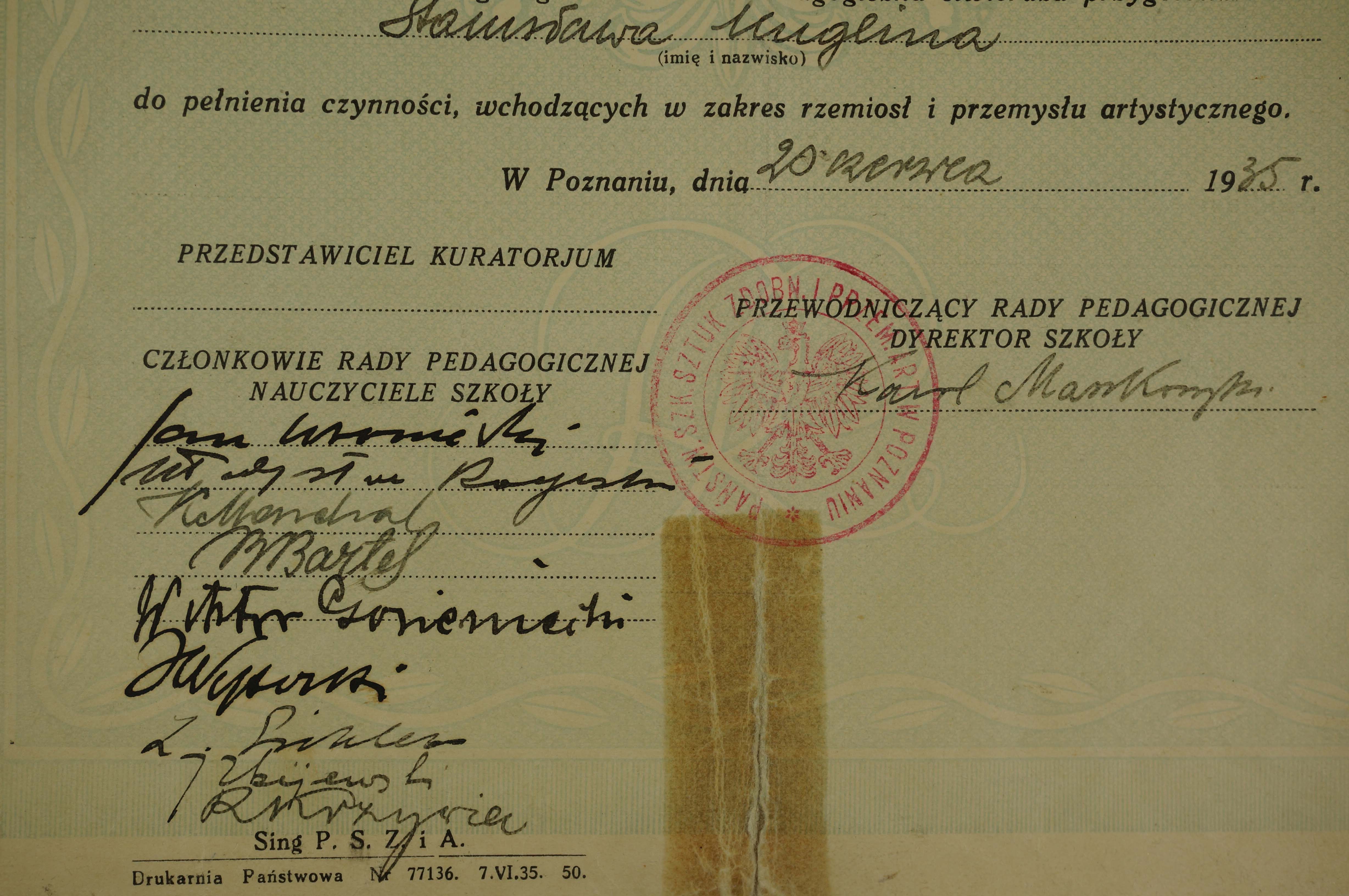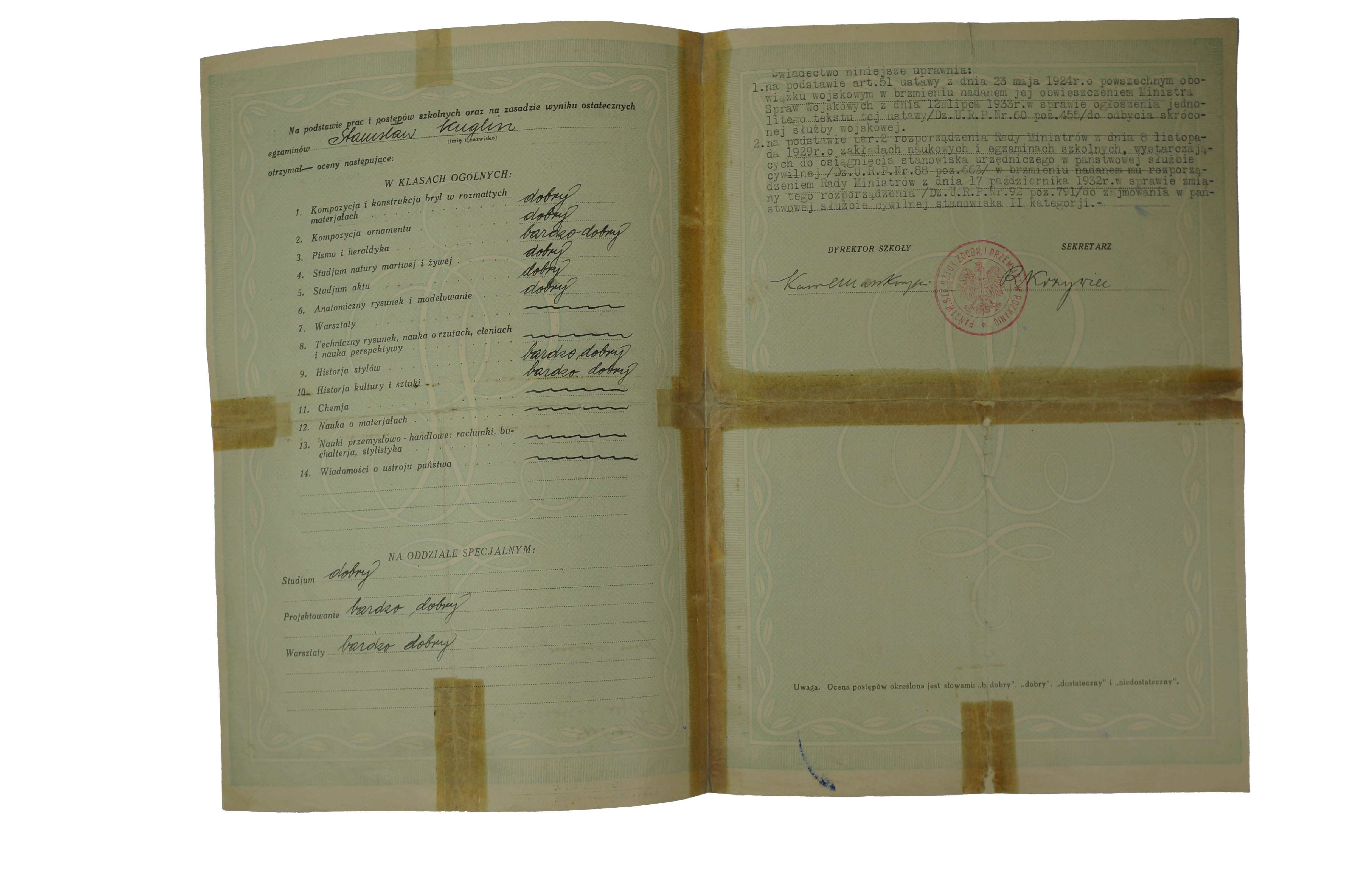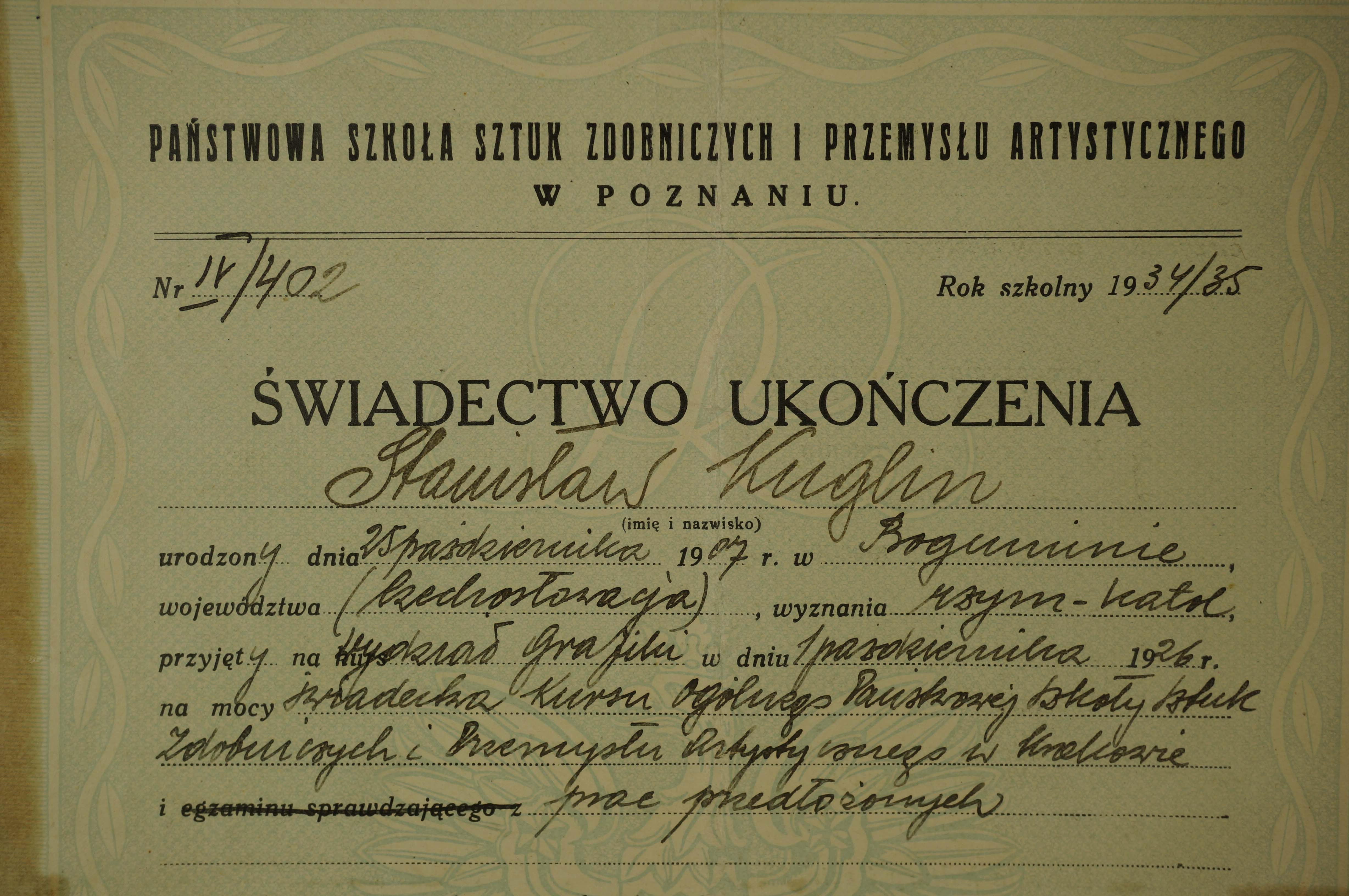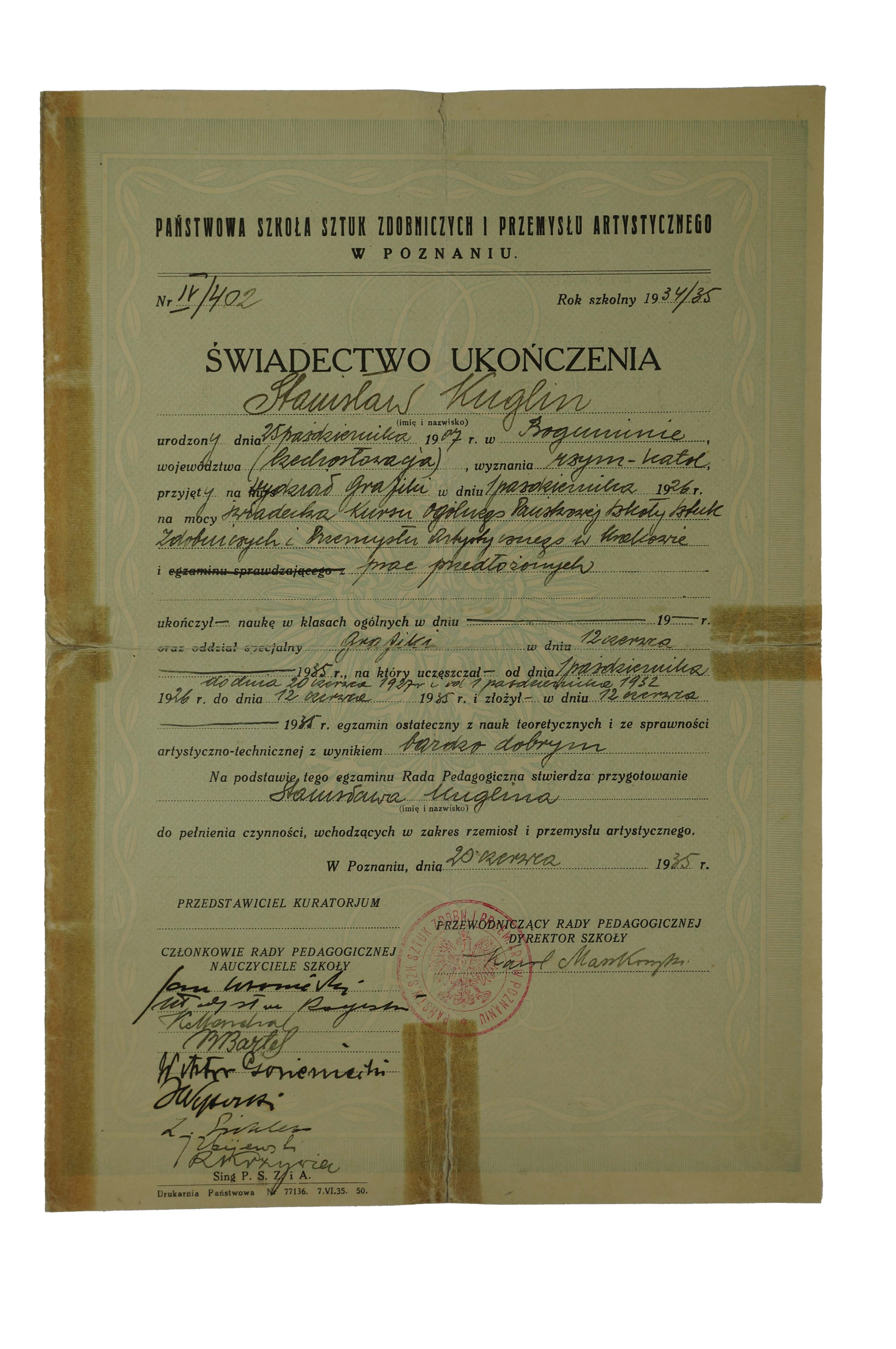 ŚWIADECTWO Państwowa Szkoła Sztuk Zdobniczych i Przemysłu Artystycznego, rok szkolny 1934/35, świadectwo wystawione dla Stanisława Kuglina [1907-1977] grafika i pedagoga, f. 20,5x29cm