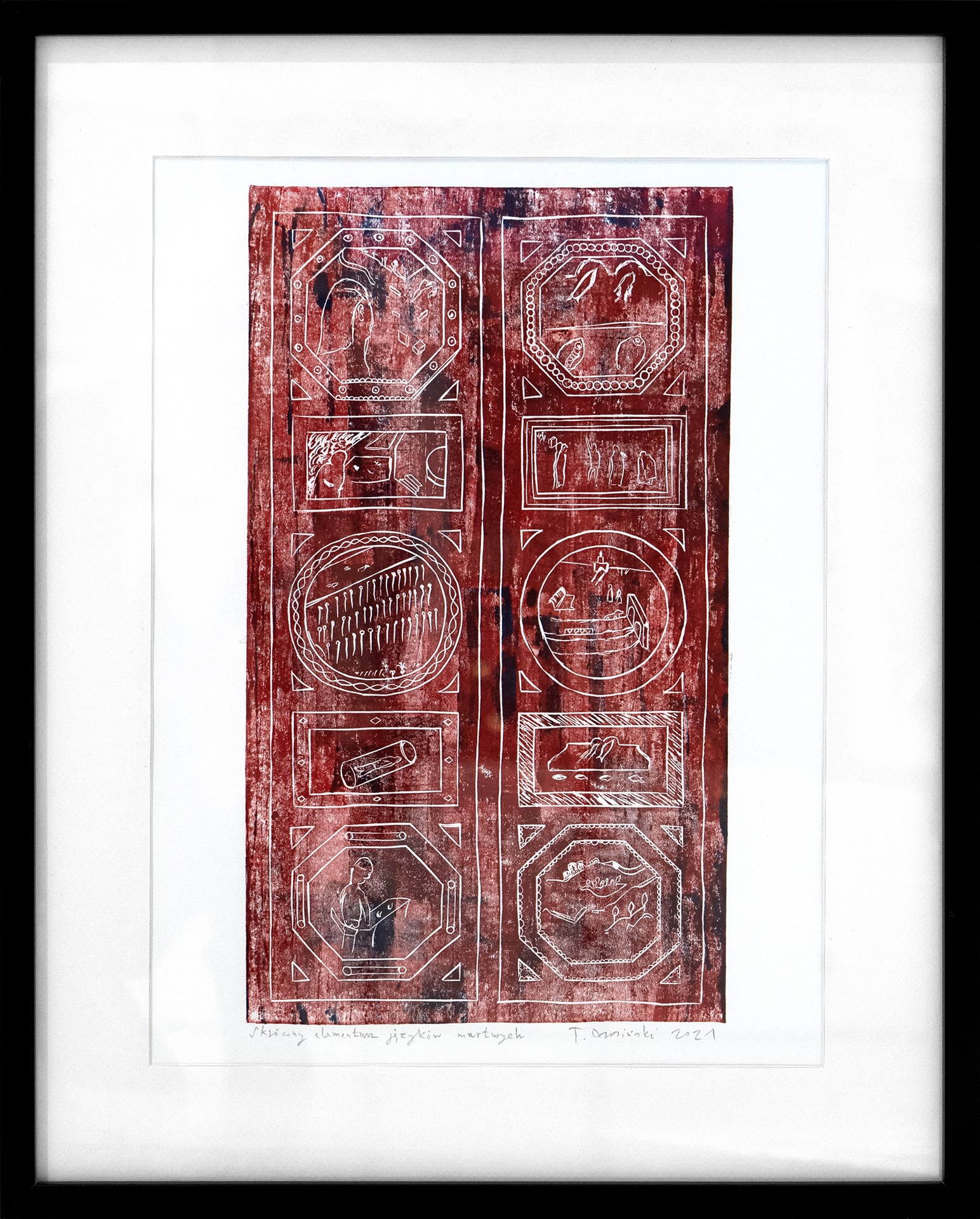 Obraz pt. 'Skrócony elementarz języków martwych' autorstwa Tomasza Osisińskiego to dzieło o wymiarach 50 cm (wysokość) na 30 cm (szerokość). Technika wykonania tego obrazu to linoryt, co sugeruje, że jest to grafika stworzona przez artystę za pomocą techniki druku linorytowego, w której rzeźbione są linie na powierzchni linoleum lub drewna, a następnie tusz jest przetłaczany na papier lub inne podłoże. Dzieło jest oprawione w ramę. Tomasz Ososiński ur. 1975, autor, tłumacz, literaturoznawca. W roku 2013 jego tomik “Pięć bajek” otrzymał nagrodę na konkursie Złoty Środek Poezji oraz nominację do Nagrody Silesius. Wydany w roku 2020 “Dom Andersena” otrzymał I nagrodę na Konkursie na książkę autorką w Świdnicy oraz nominację do nagrody Orfeusz. Tłumaczy literaturę niemiecką, głównie poezję, przekładał m.in.M. Rilkego, G. Benna, P. Celana, E. Jelinek, J. Wagnera. Jest laureatem wielu nagród za przekład literacki (m.in. I nagrody na Festiwalu Puls Literatury), był stypendystą m.in. S. Fischer Stiftung oraz Literarisches Colloquium Berlin. Obecnie przygotowuje wybór wierszy Jana Wagnera oraz antologię współczesnych poetek niemieckich. Uczy historii literatury niemieckiej oraz przekładu literackiego na Uniwersytecie Łódzkim. Jako literaturoznawca zajmował się m.in. inkunabulistyką oraz edycją rękopisów neogotyckich.