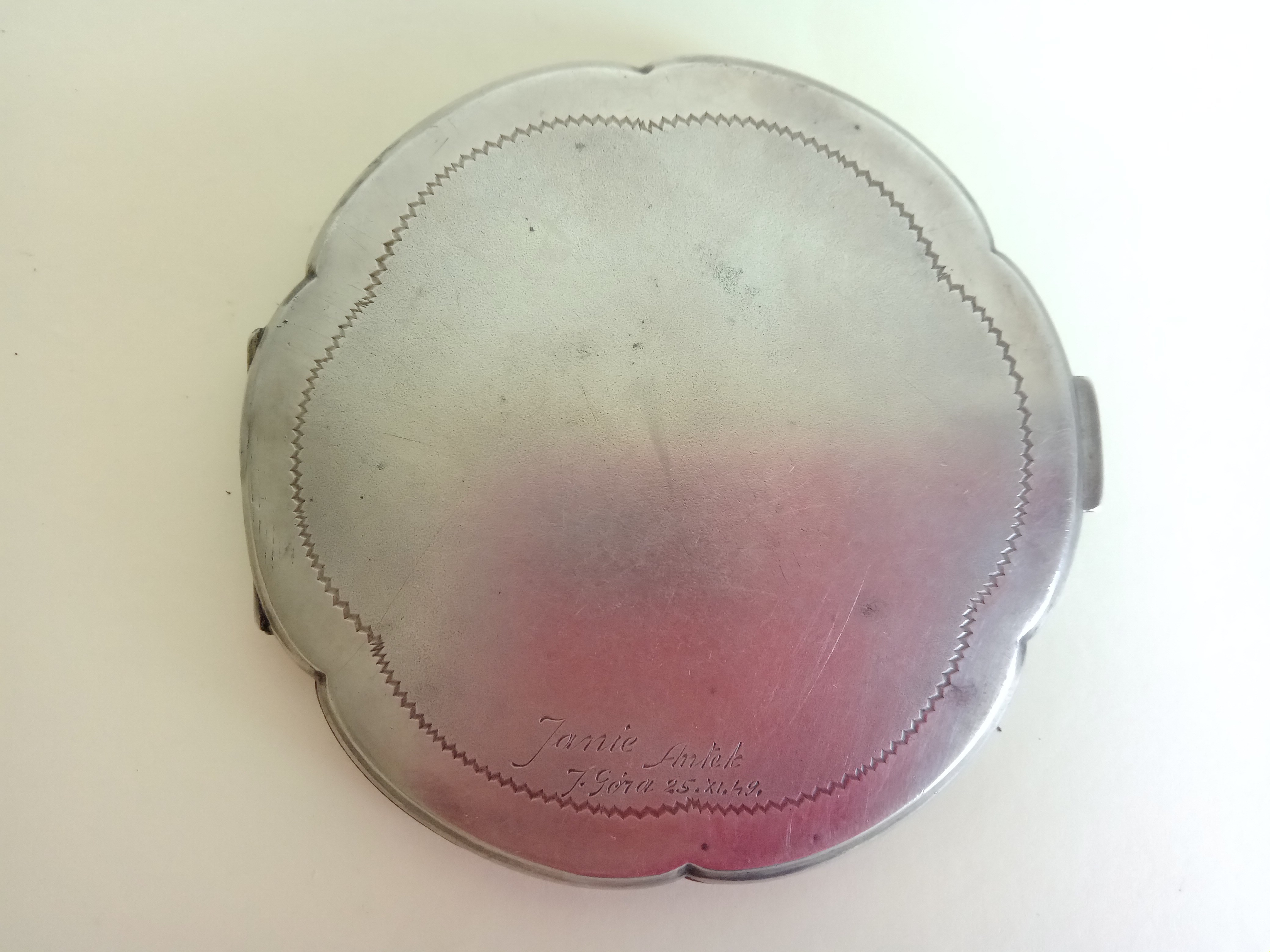 biały metal, grawerunek o następującej treści „Janie Antek, J. Góra, 25.XI. 49” bardzo osobisty przedmiot ! Świadek przemieszczeń ludności w okresie 1945-49 na tereny Polski zachodniej; jest to prawdopodobnie prezent podarowany w Jeleniej Górze na Ziemiach Odzyskanych; stanowi dowód początków normalnego życia po wojnie na terenie, na którym działa Fundacja Pałac Bojadła i dokumentuje zabytki rezydencjonalne;