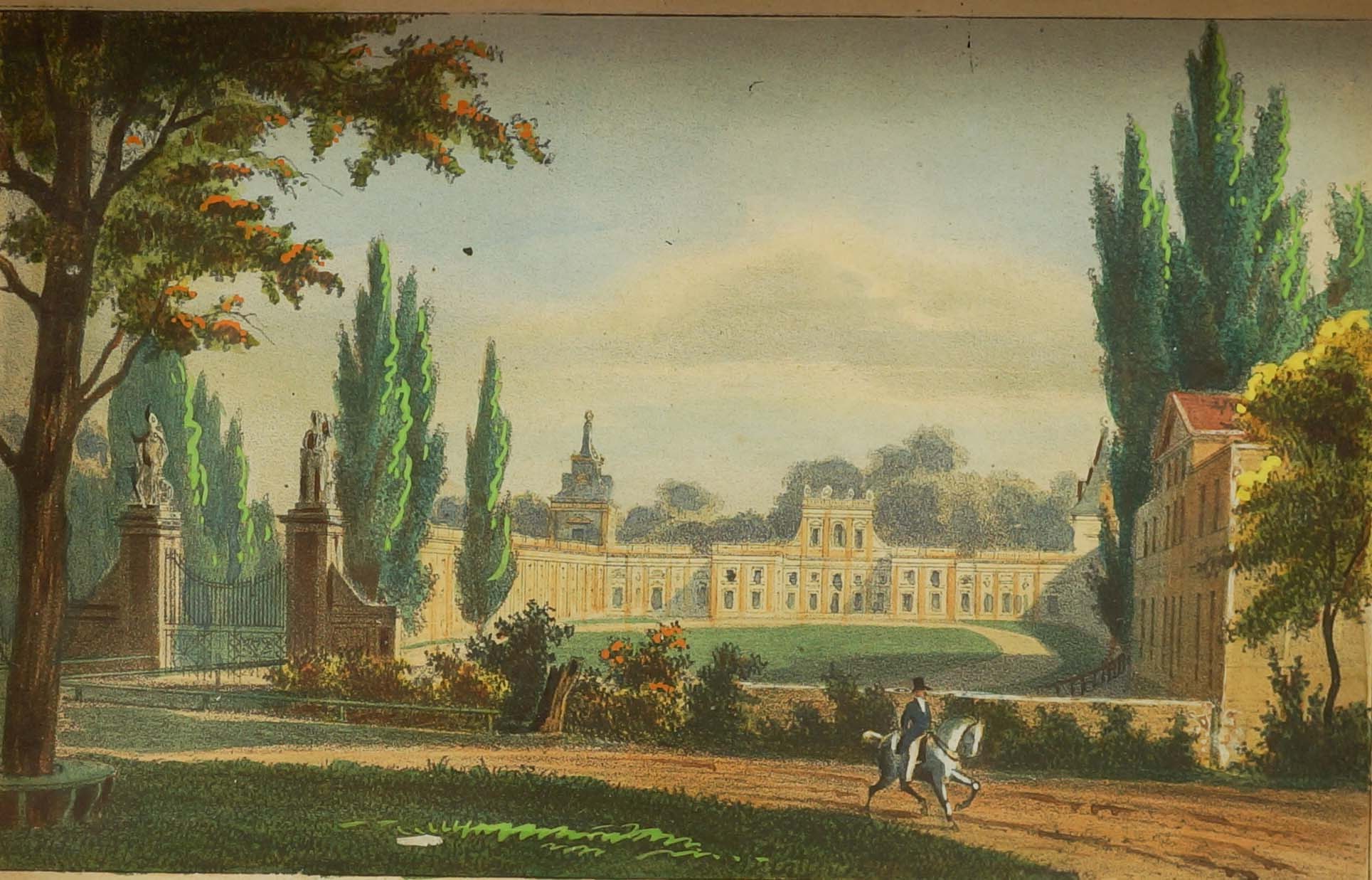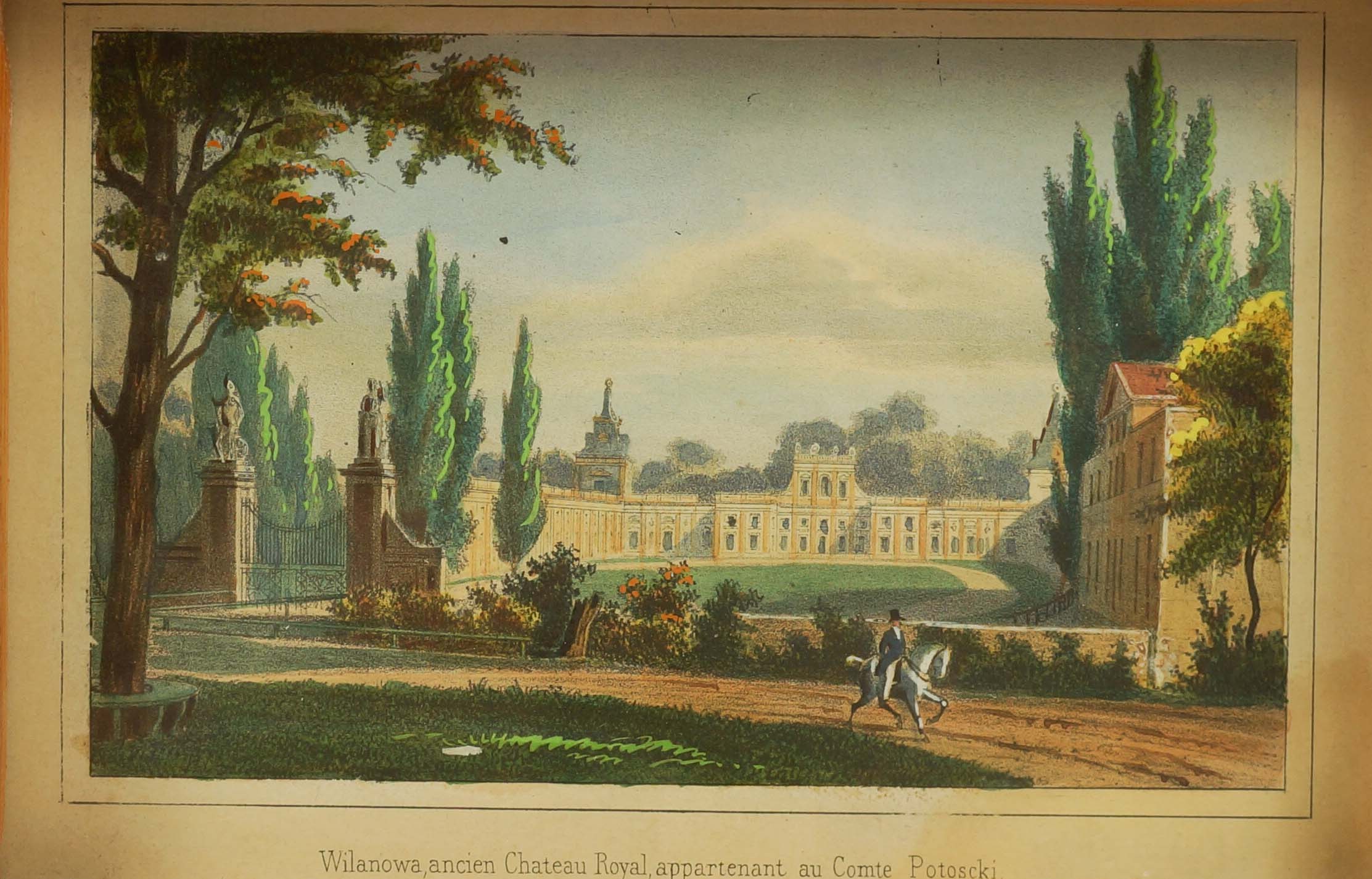 Wilanowa ancien Chateau Royal appartenant au Comte Potocki / Wilanów dawny zamek królewski należący do hrabiego Potockiego, litografia barwna , f. 13,5x8,5cm kompozycja w świetle ramy, 25x19cm całość