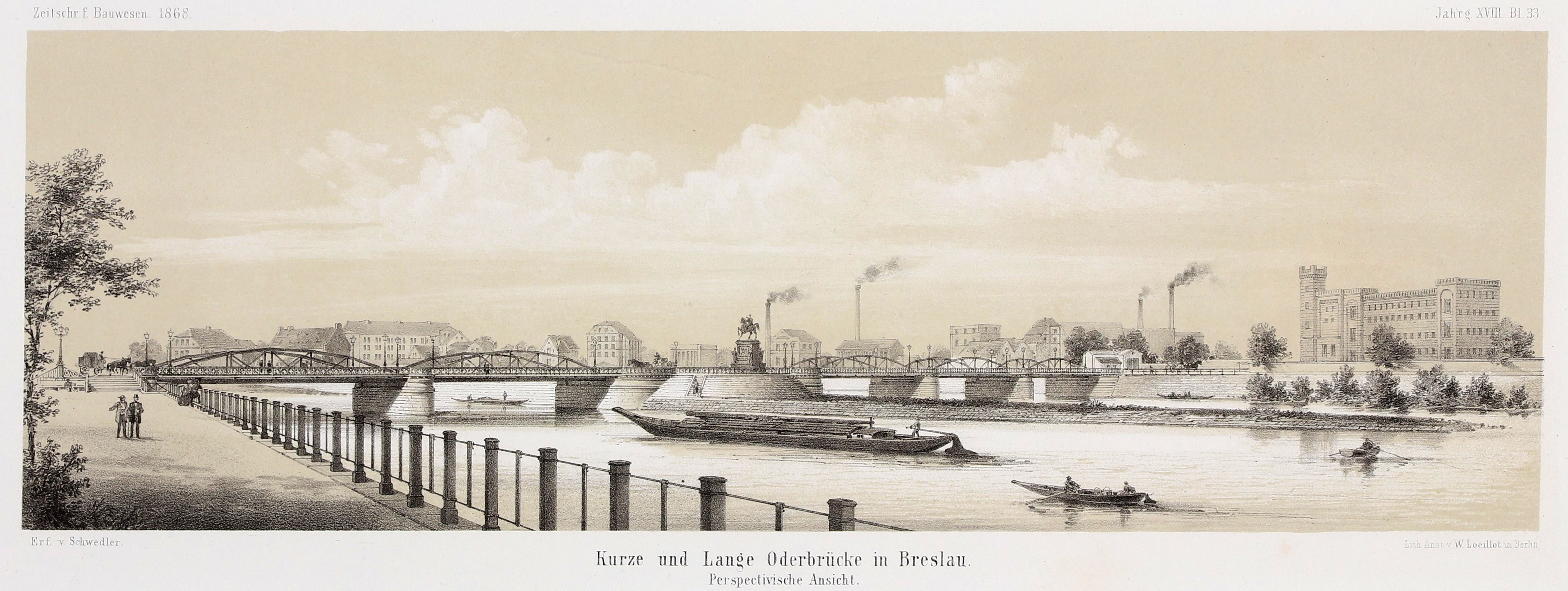 WROCŁAW. Most Uniwersytecki – wizualizacja projektu autorstwa J.W. Schwedlera; lit. W. Loeillot, 1868; lit. tonowana, st. bdb., przetarcia w narożnikach; wym. widoku 387x127 mm; Kurze und Lange Oderbrücke in Breslau. Perspectivische Ansicht; BARDZO RZADKIE!