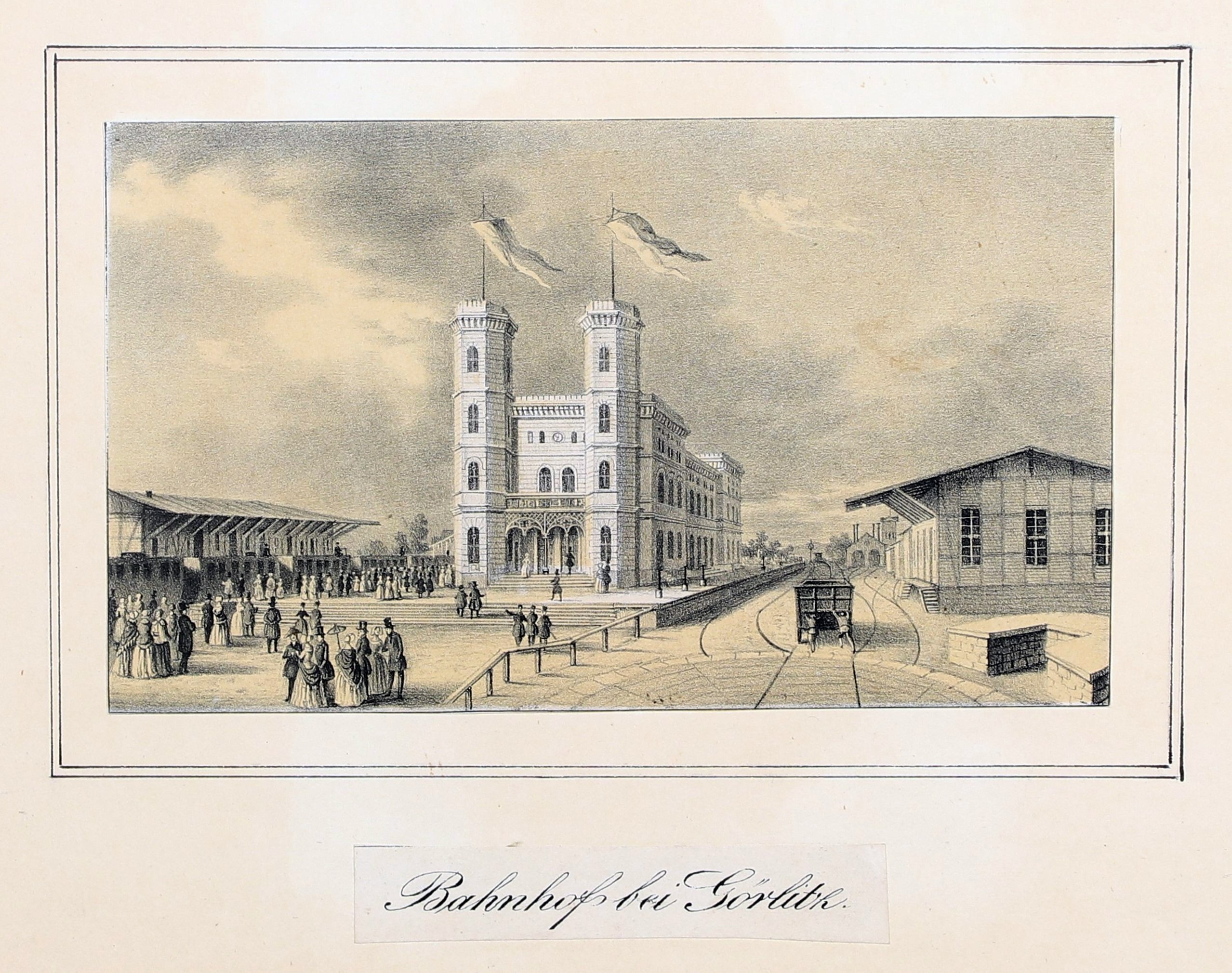 ZGORZELEC. Otwarcie dworca w Zgorzelcu 1 września 1847 r.; anonim; lit. tonowana, podklejona papierem, st. bdb.; wym. lit. 148x87 mm; tyt. na doklejonym szyldziku: Bahnhof bei Görlitz; BARDZO RZADKIE.