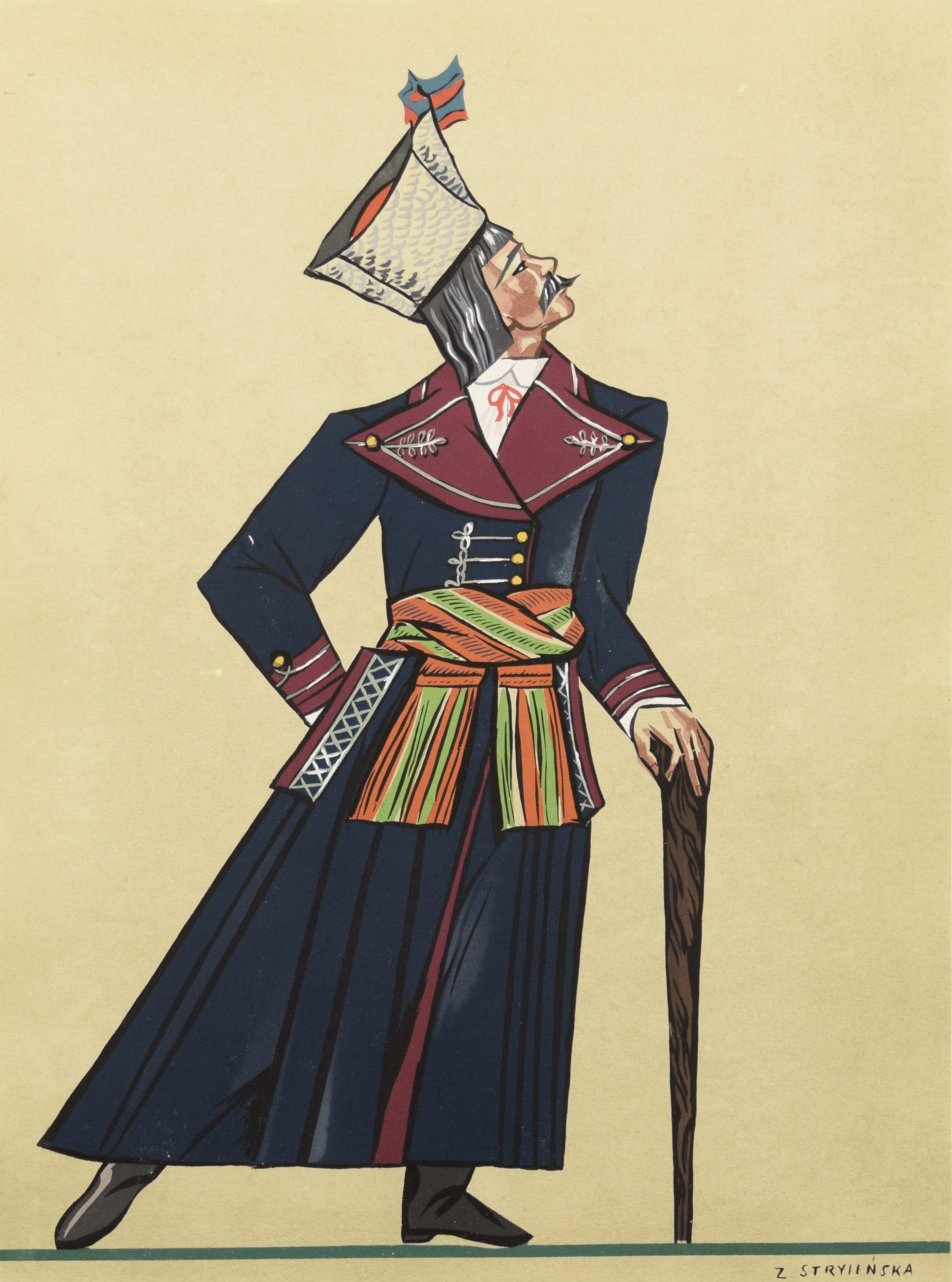 Praca pochodzi z teki: Zofia Stryjeńska, „Polish Peasants Costumes” [with introducion and notes by Thaddée Seweryn, Curator of Ethnographical Museum in Cracow], Nice 1939. Published by C. Szwedzicki, plansza VII.
