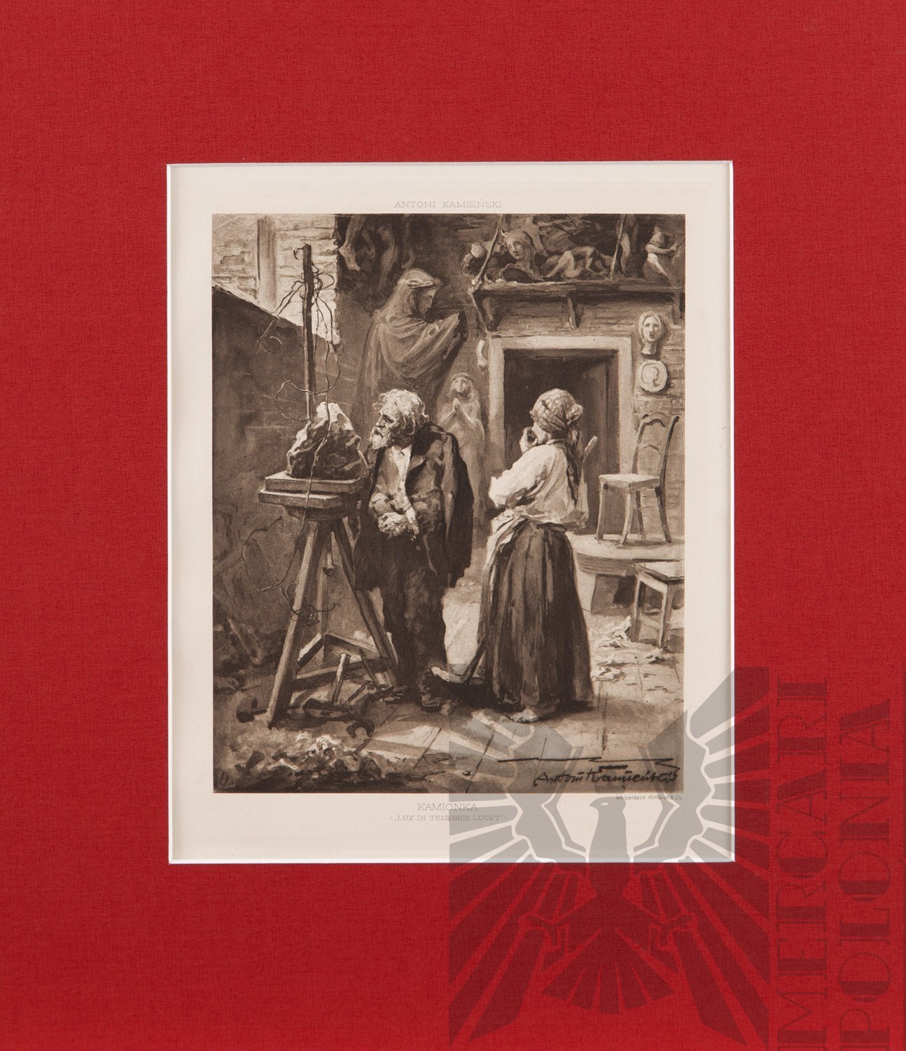 heliograwiura, papier; 23,5 x 19 cm (w świetle passe-partout), 36,5 x 31 cm (oprawa, passe-partout); sygn. na płycie. p. d.: Antonio Kamieński; opisany pod kompozycją na środku: KAMIONKA / ("LUX IN TENEBRIS LUCET"); p. d.: Meisenbach Riffarth & Co.