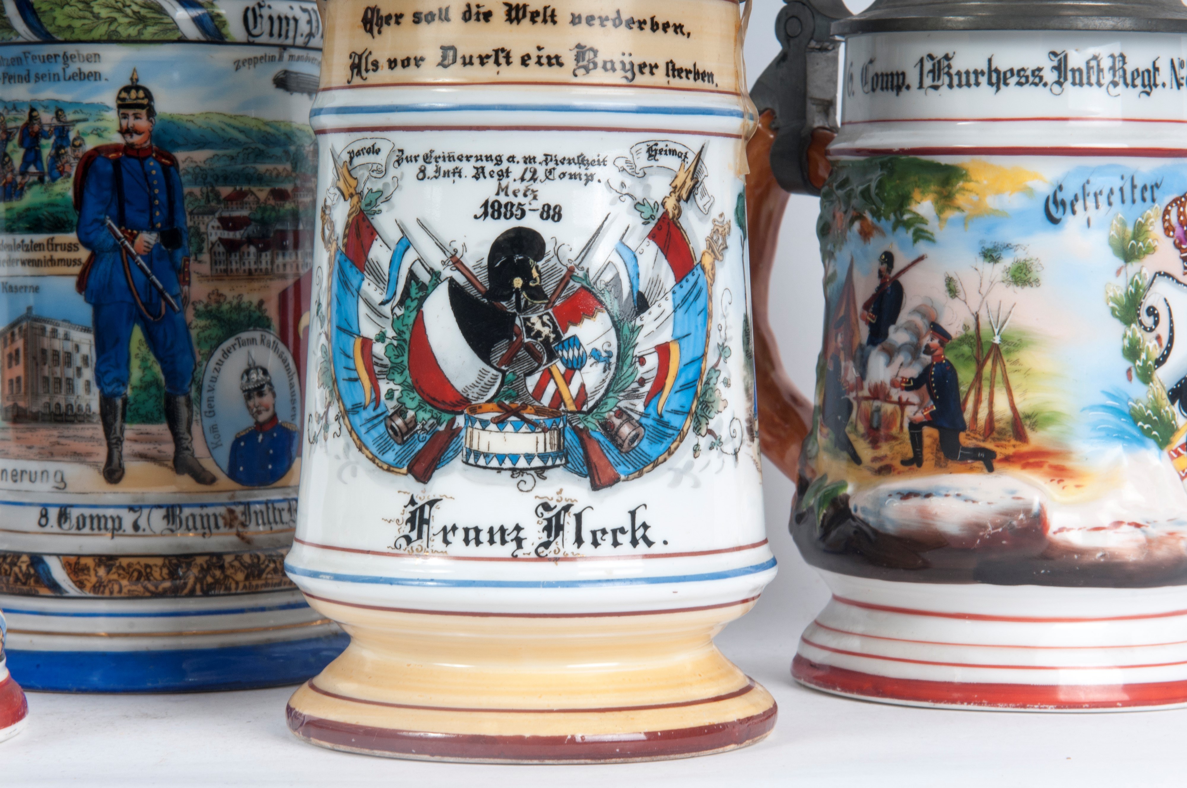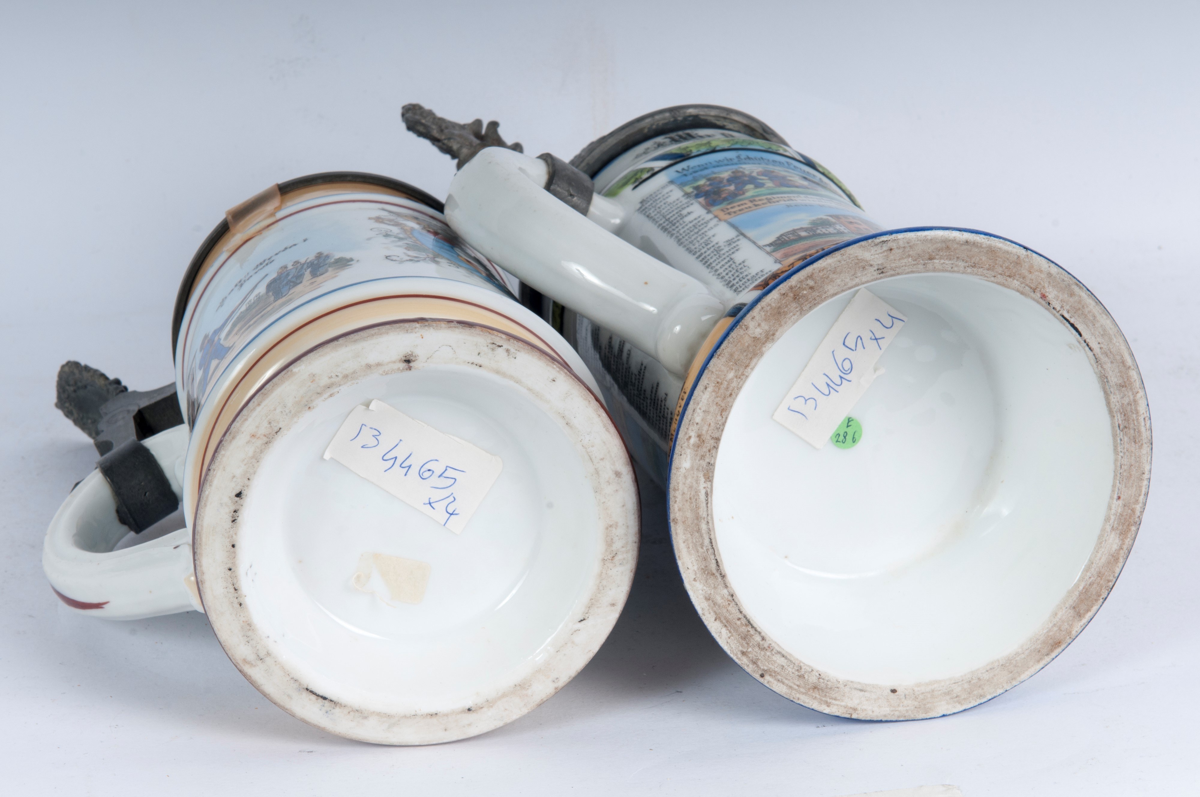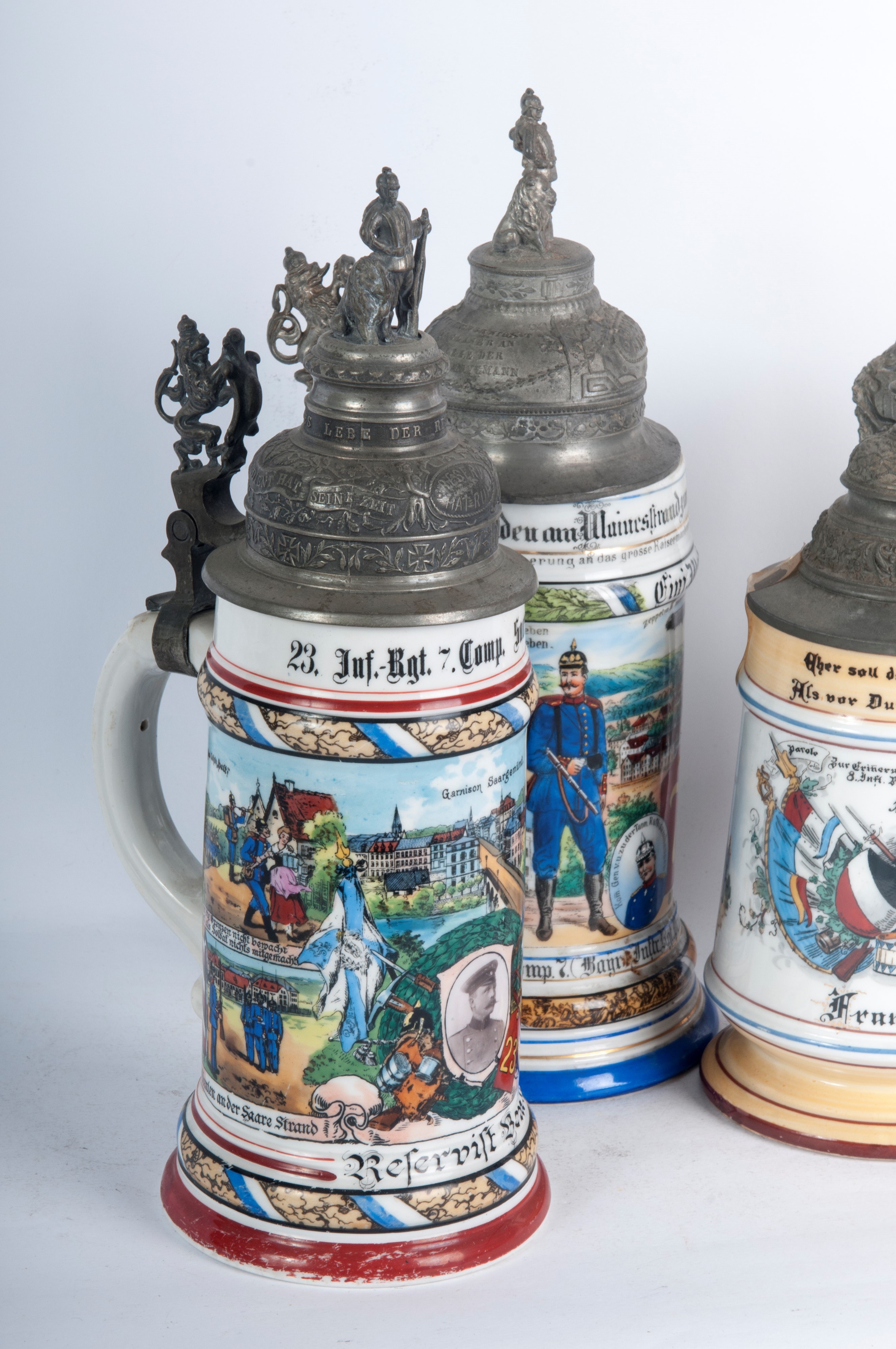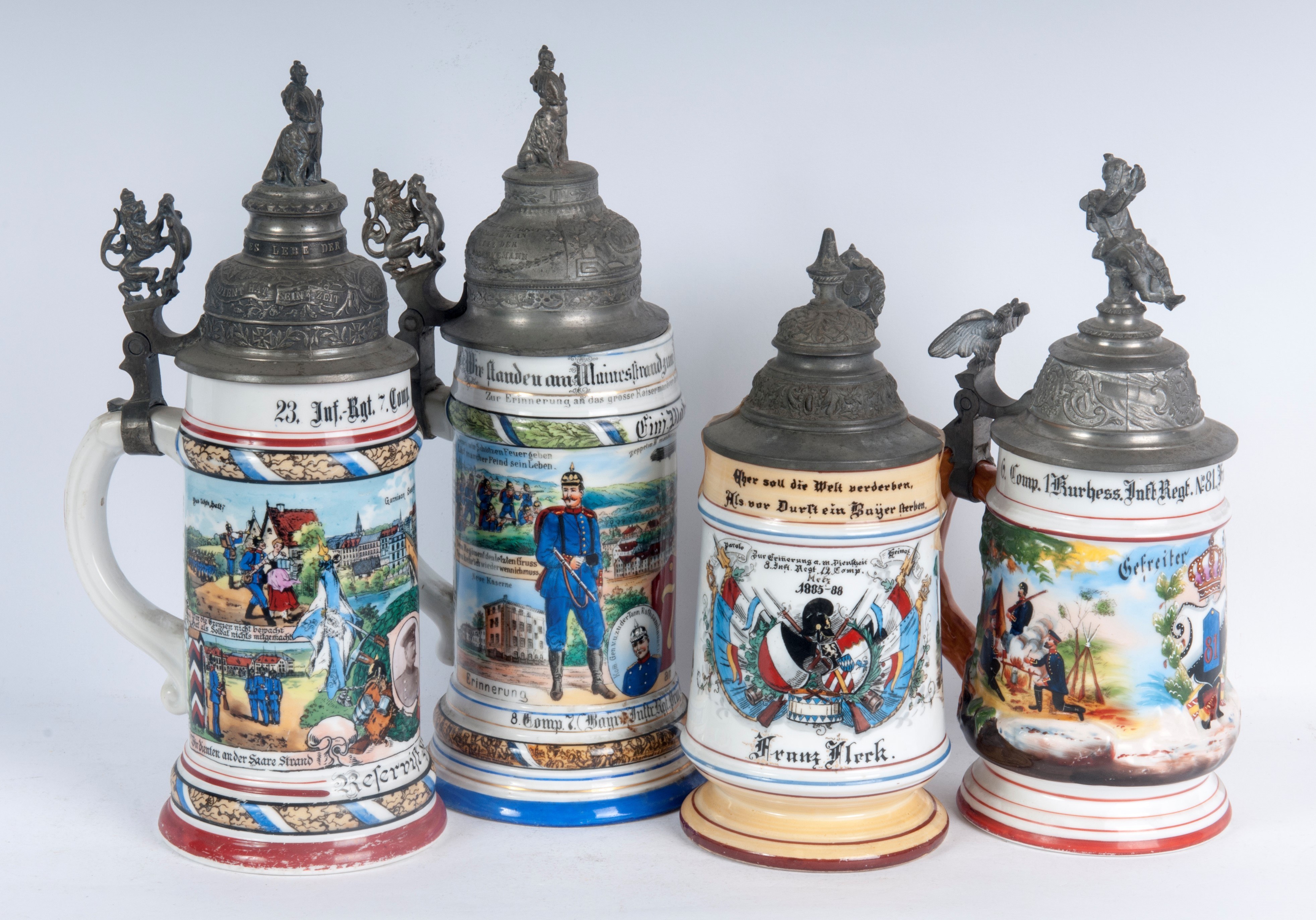 in ceramica policroma con coperchio in peltro due con figure militari, due a cupola.