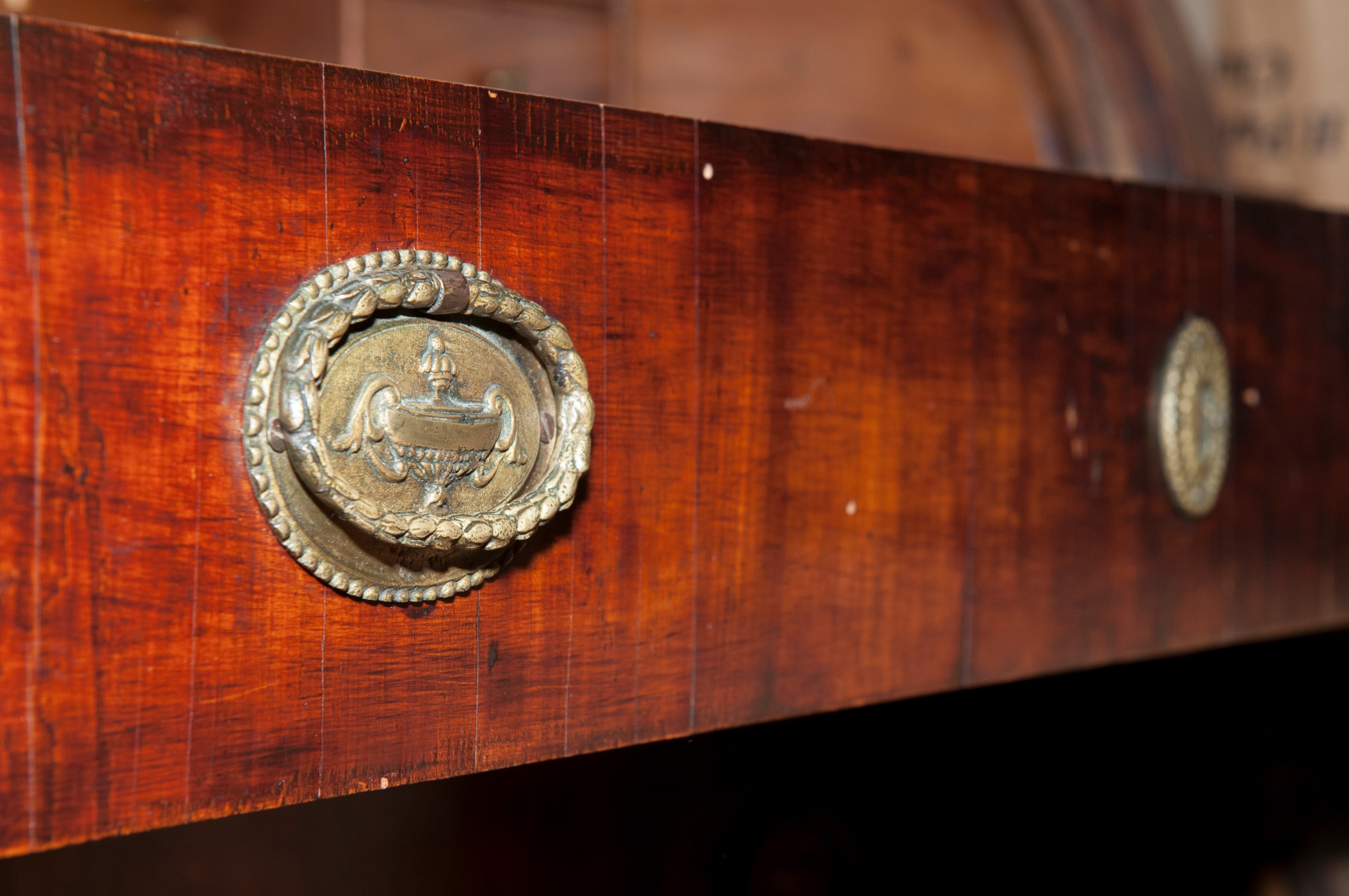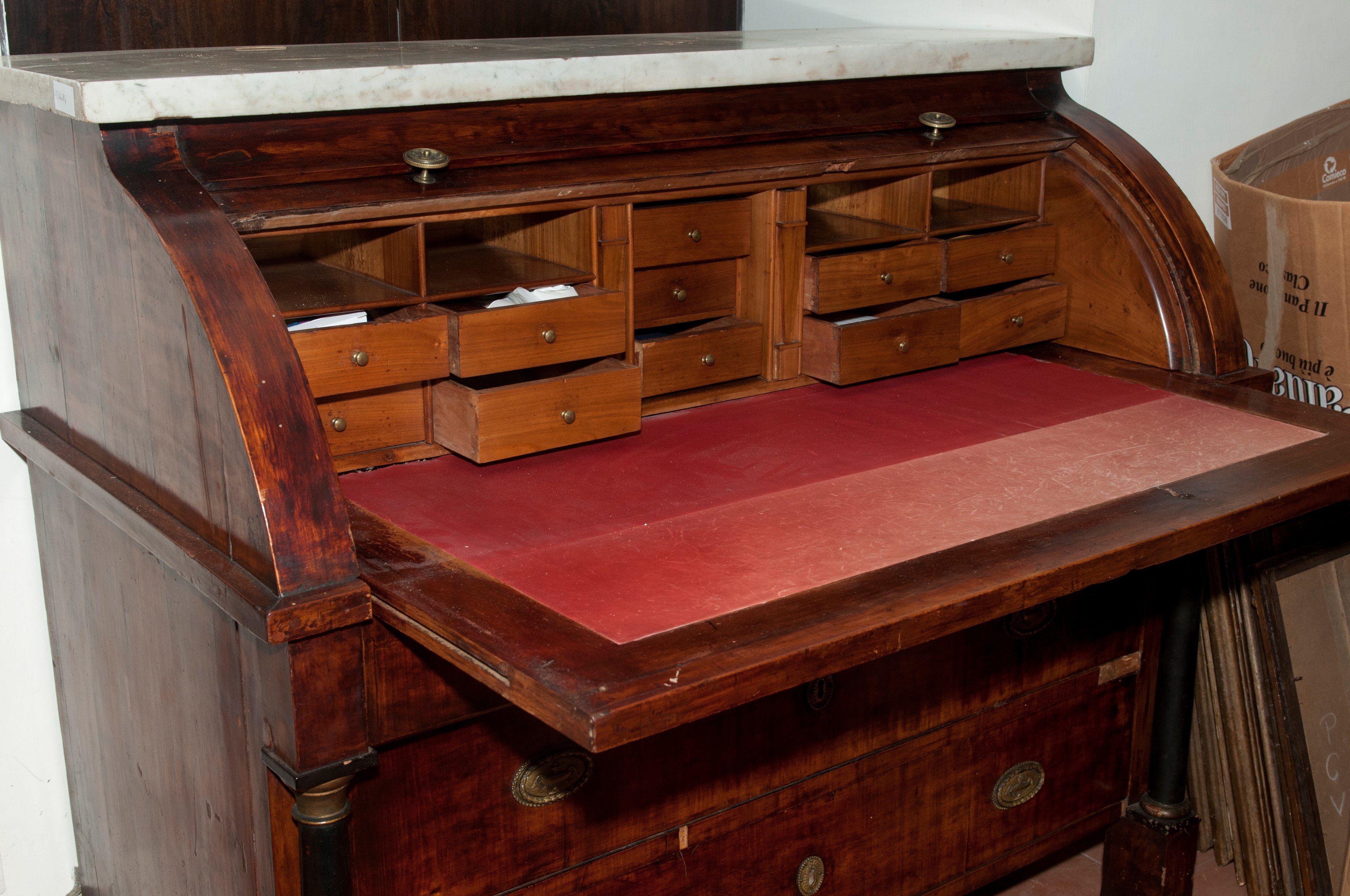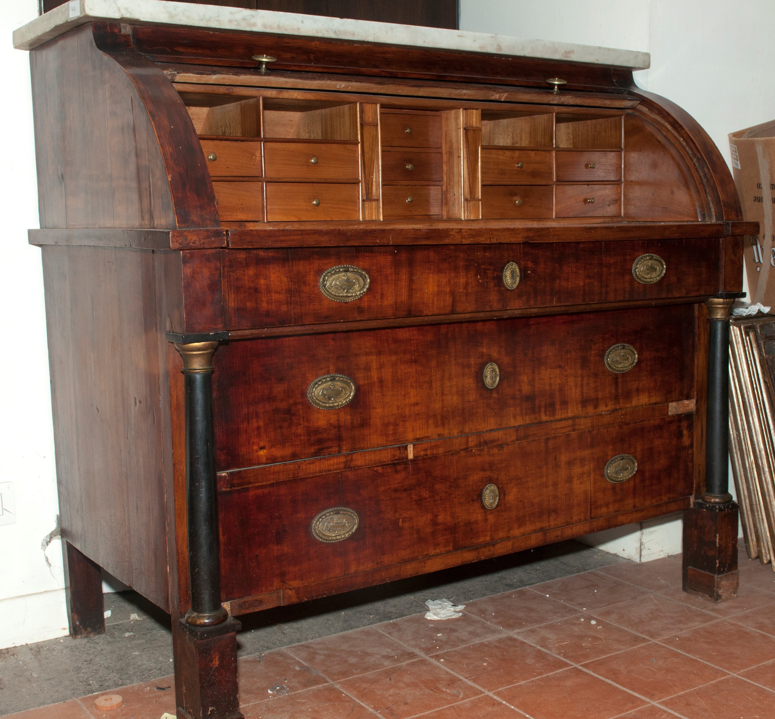 with three drawers, the thinnest of which protrudes from the band beneath the top of the cylindrical stand with cabinet and small drawers. Rectangular in shape, ending with a white Carrara marble top, smooth sides, and a front with a pair of ebonized columns with gilded capitals. Plinth base at the front and straight rear legs.