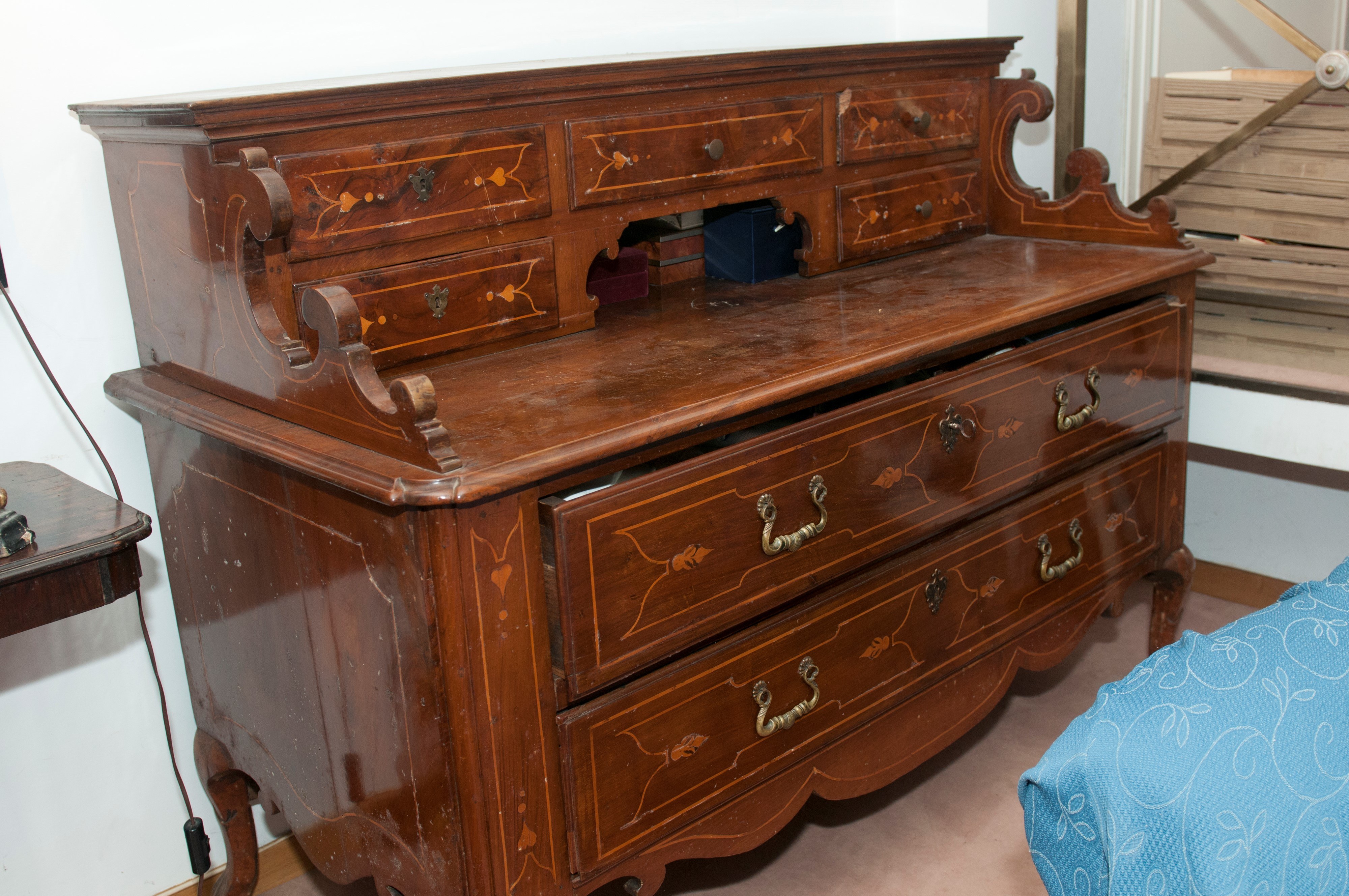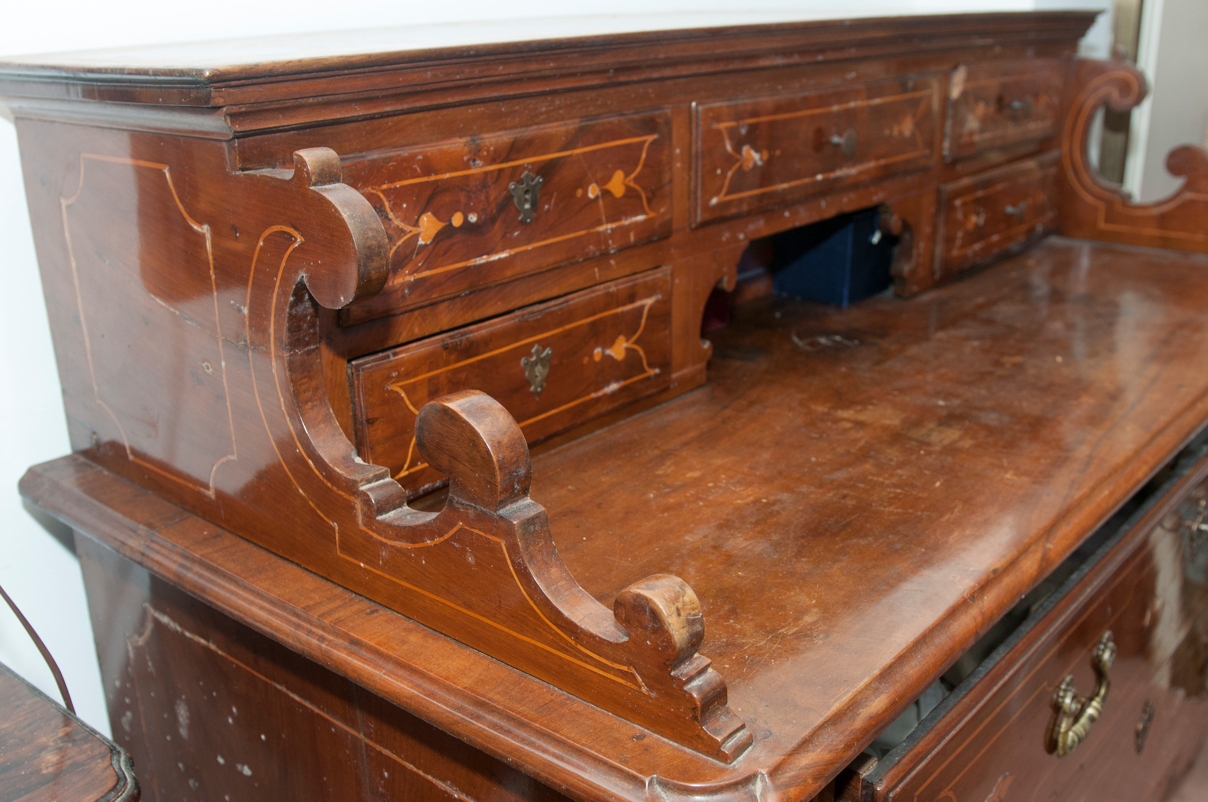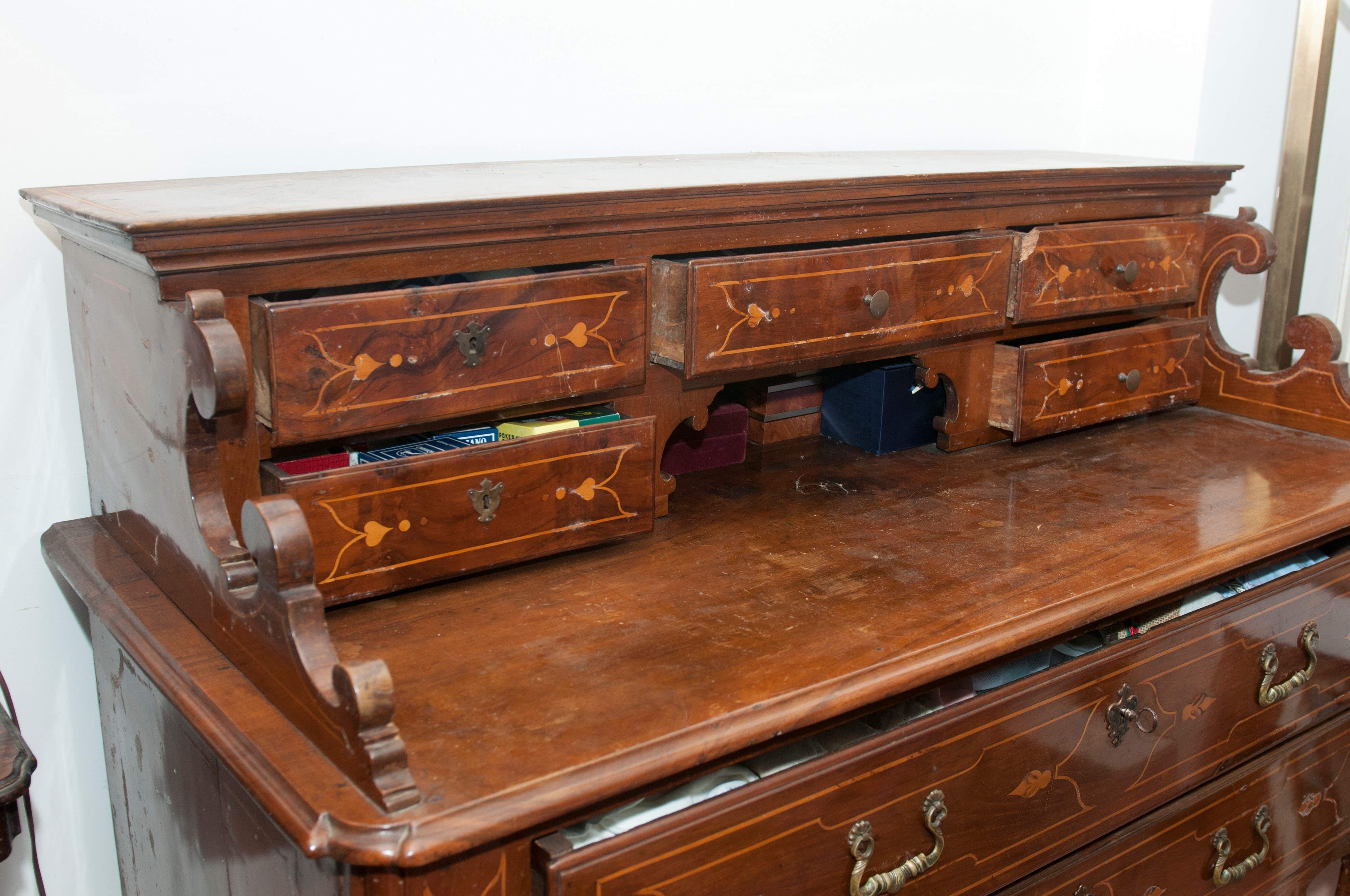 Rectangular in shape. Body with two drawers and a five-drawer upper section with a compartment. Sabre legs, rounded front corners. Plant-shaped decoration in fruitwood on the front and sides. Bronze hardware.