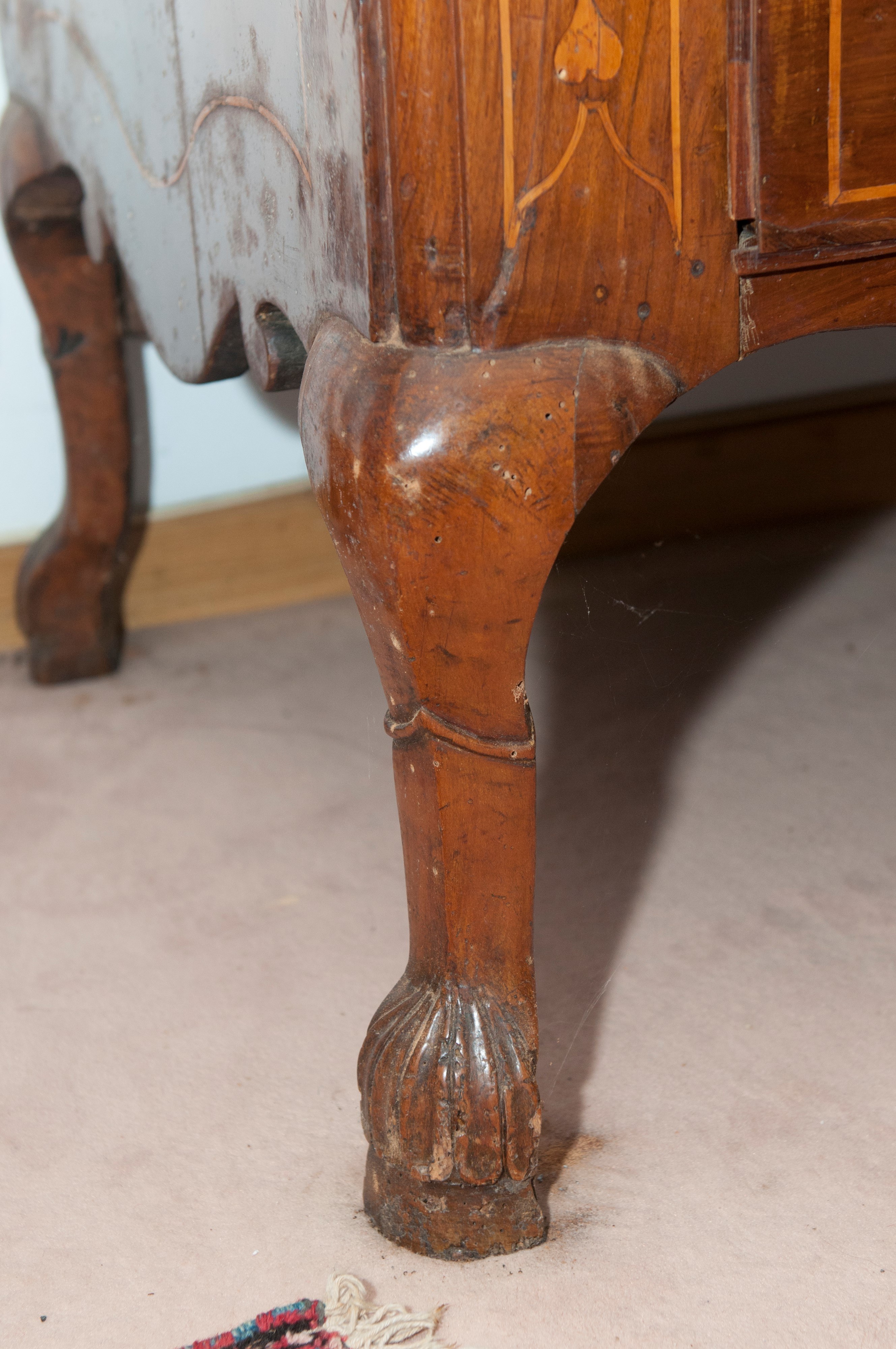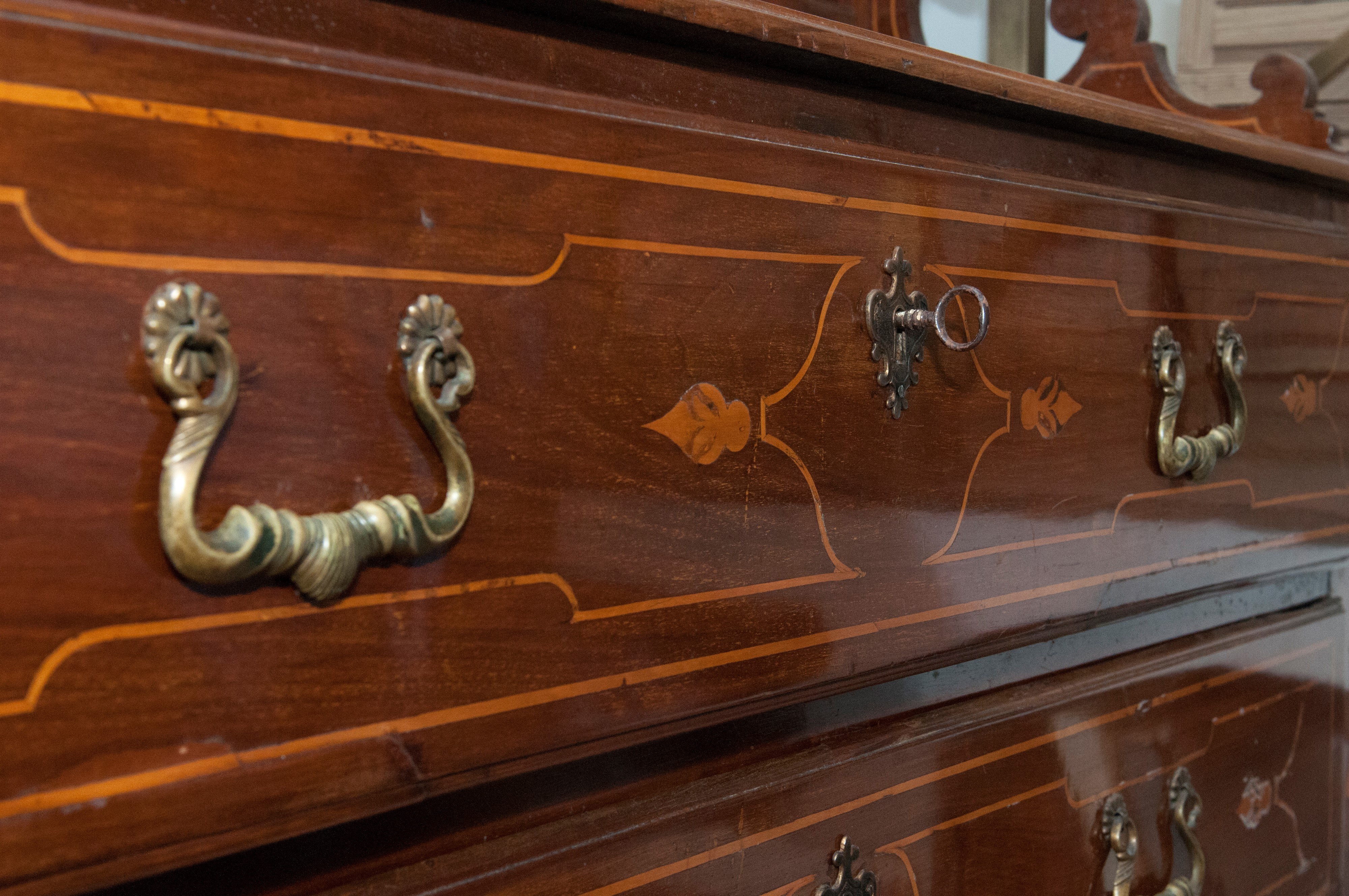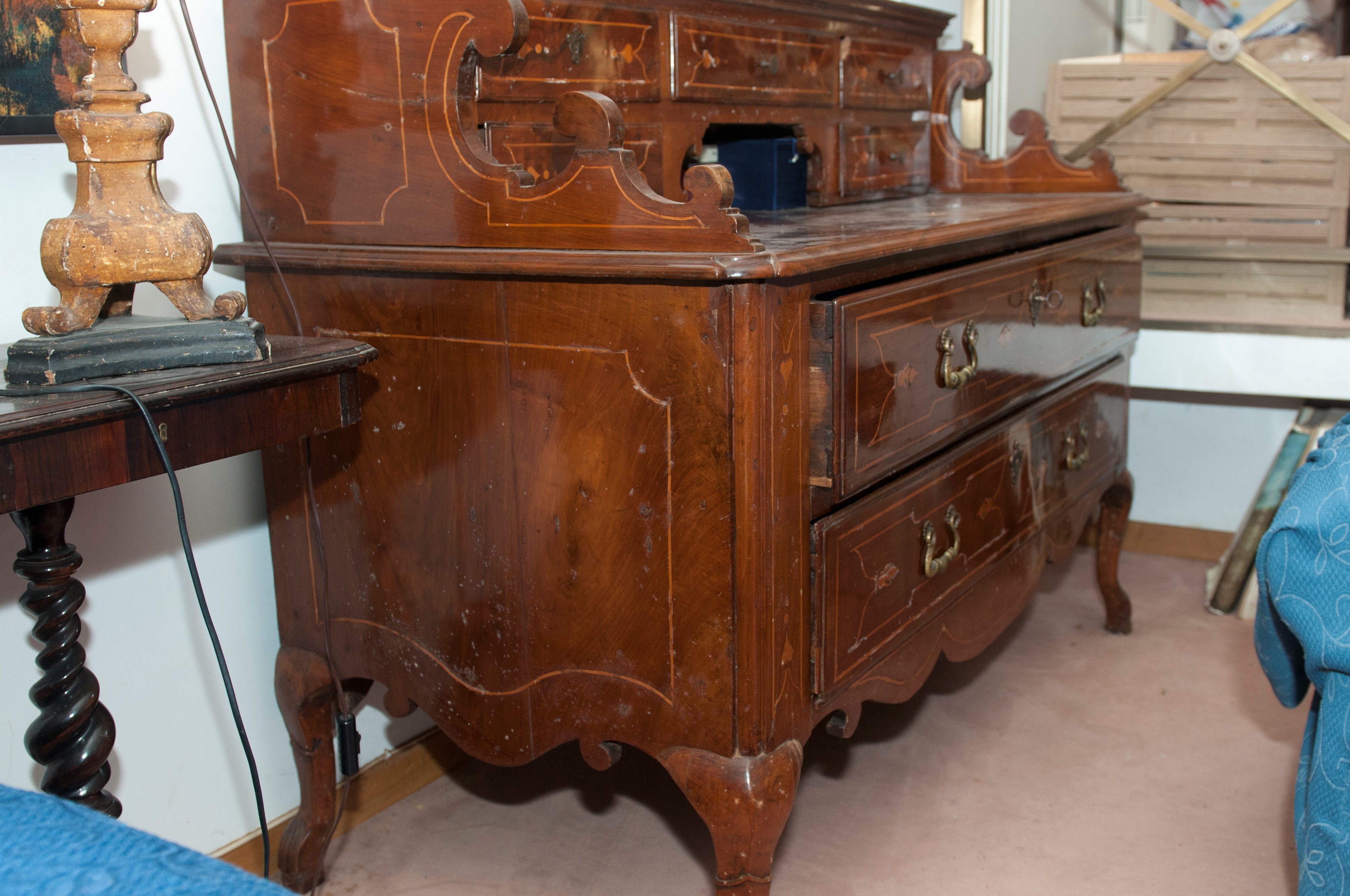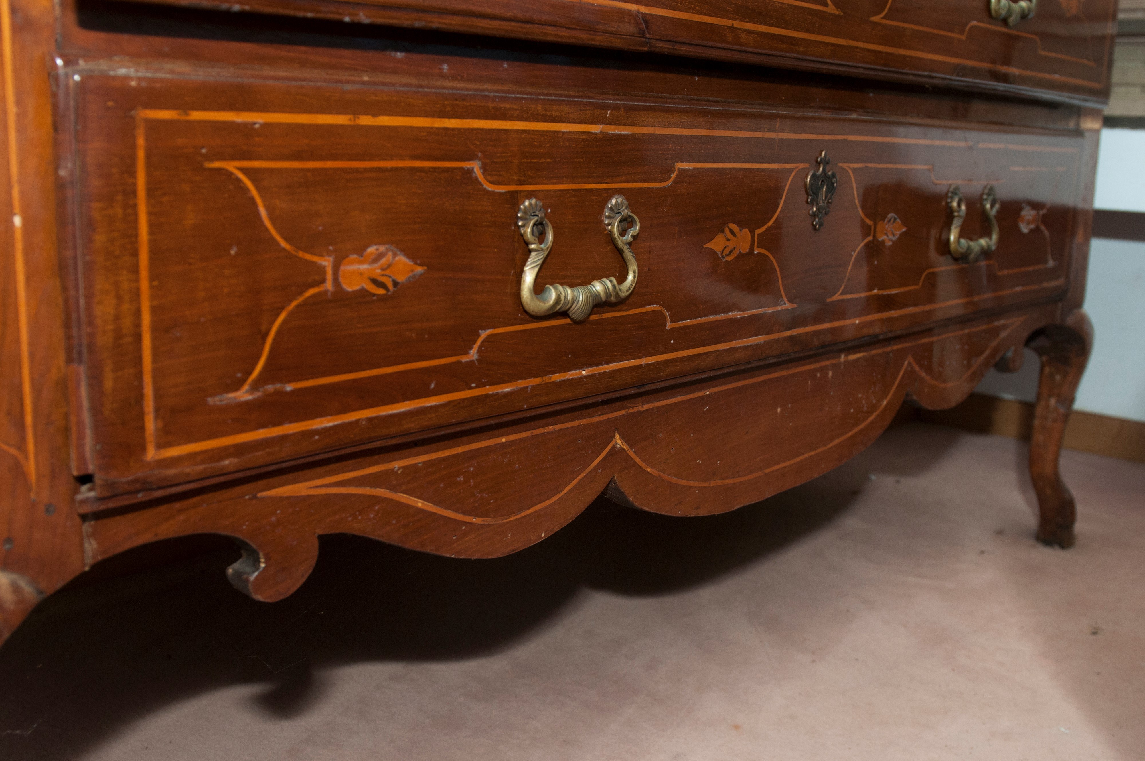 Rectangular in shape. Body with two drawers and a five-drawer upper section with a compartment. Sabre legs, rounded front corners. Plant-shaped decoration in fruitwood on the front and sides. Bronze hardware.