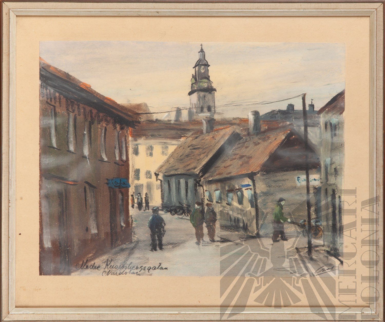 tempera, pastel, papier, 30 x 39 cm (w świetle passe-partout), 40 x 47 cm (oprawa, rama); opis autorski z nazwą miasta i ulicy l. d.; sygn. p. d. (nieczytelnie)