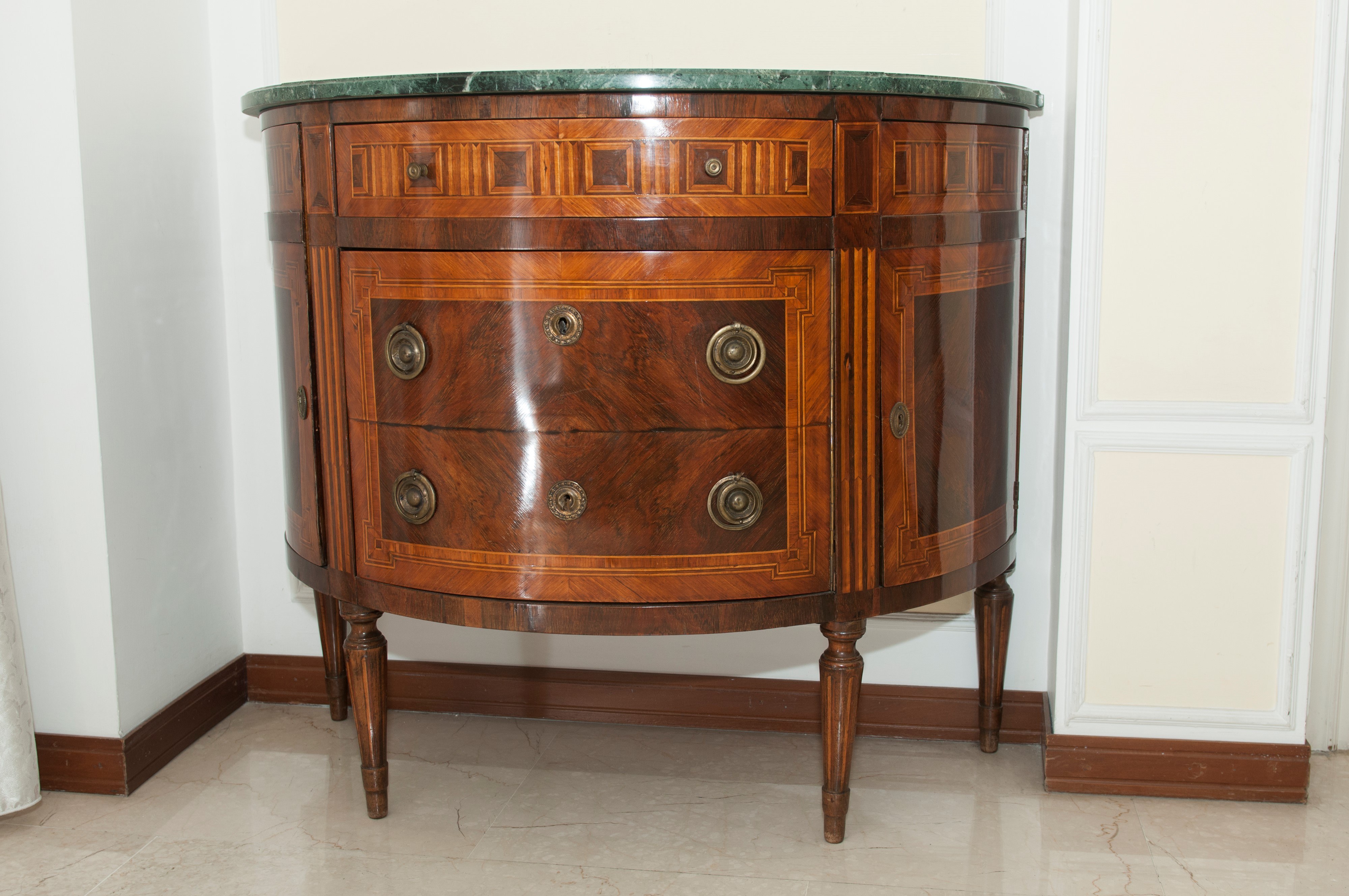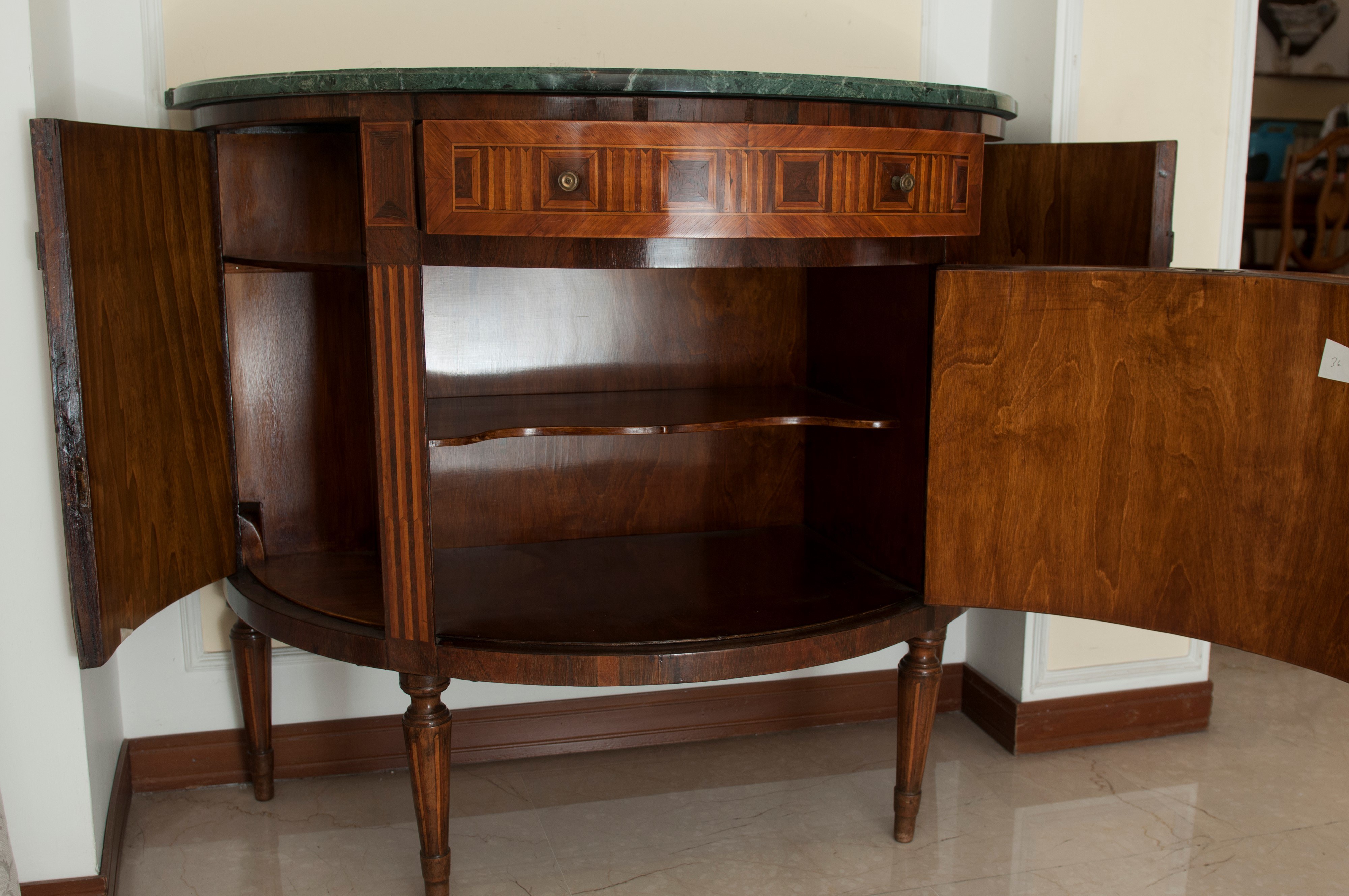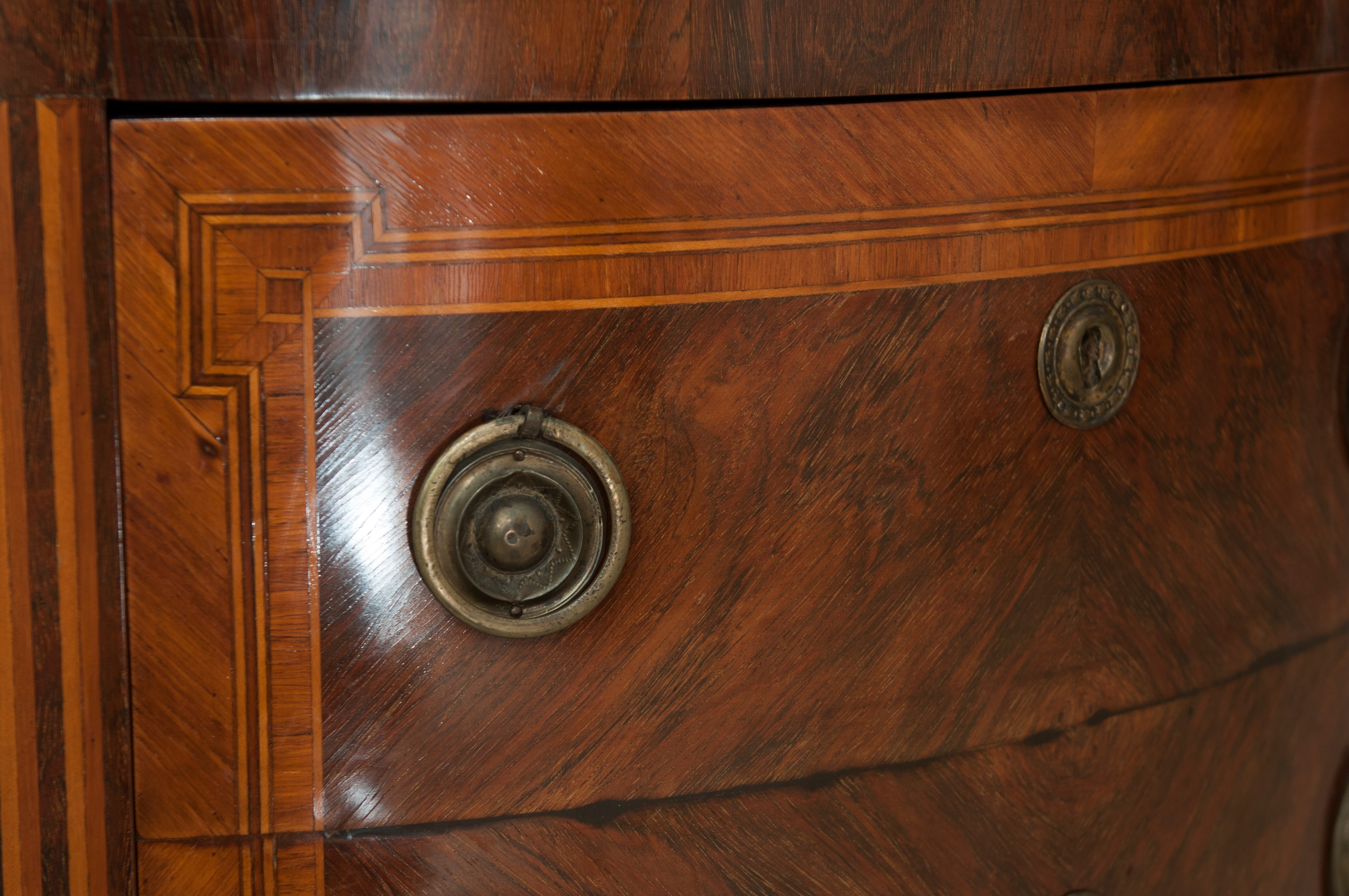 Made of mahogany. With three drawers in the upper section and three vaneaux doors in the body. Fluted inverted cone legs. Geometric fruitwood panels on the front and sides.