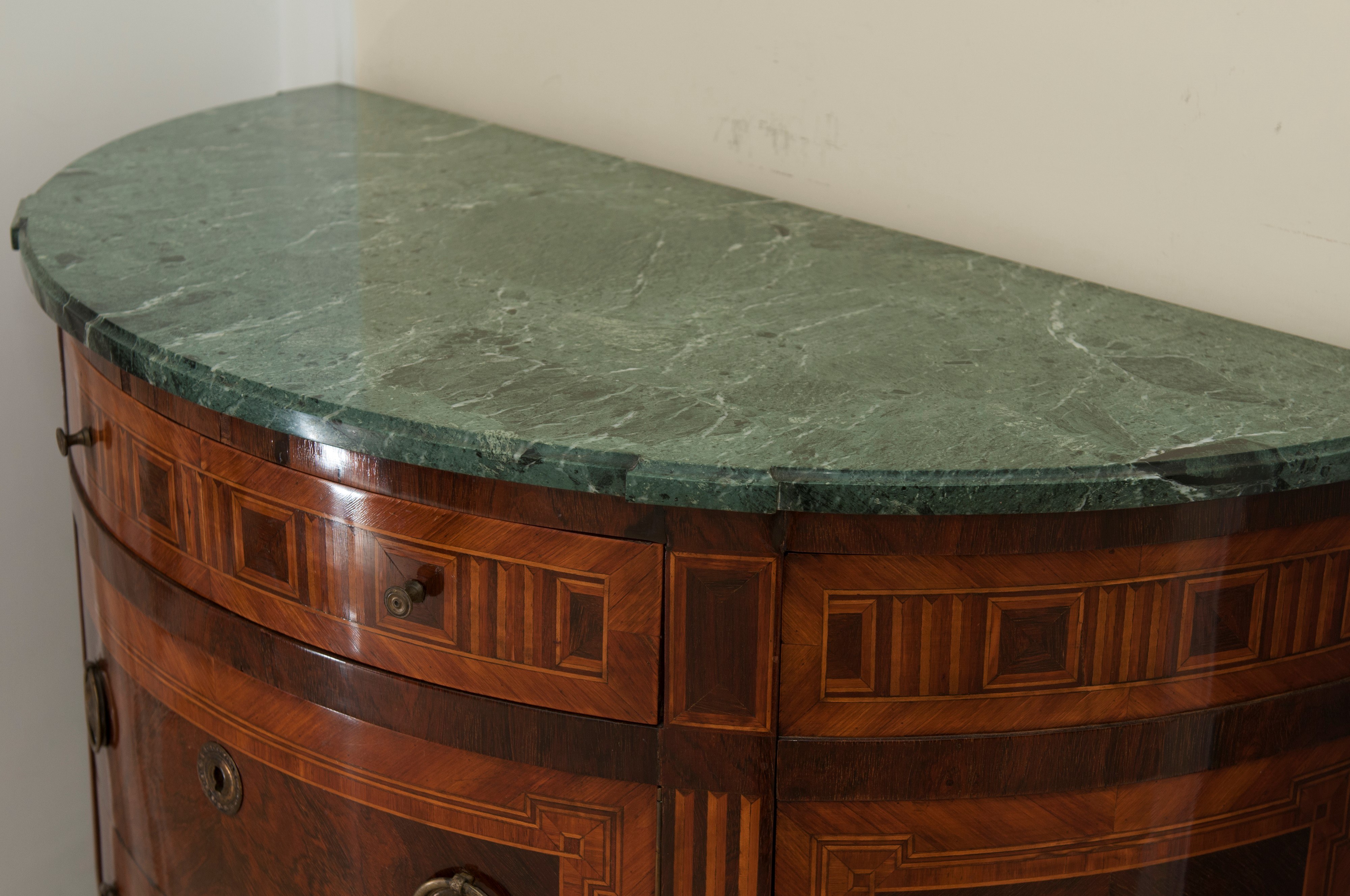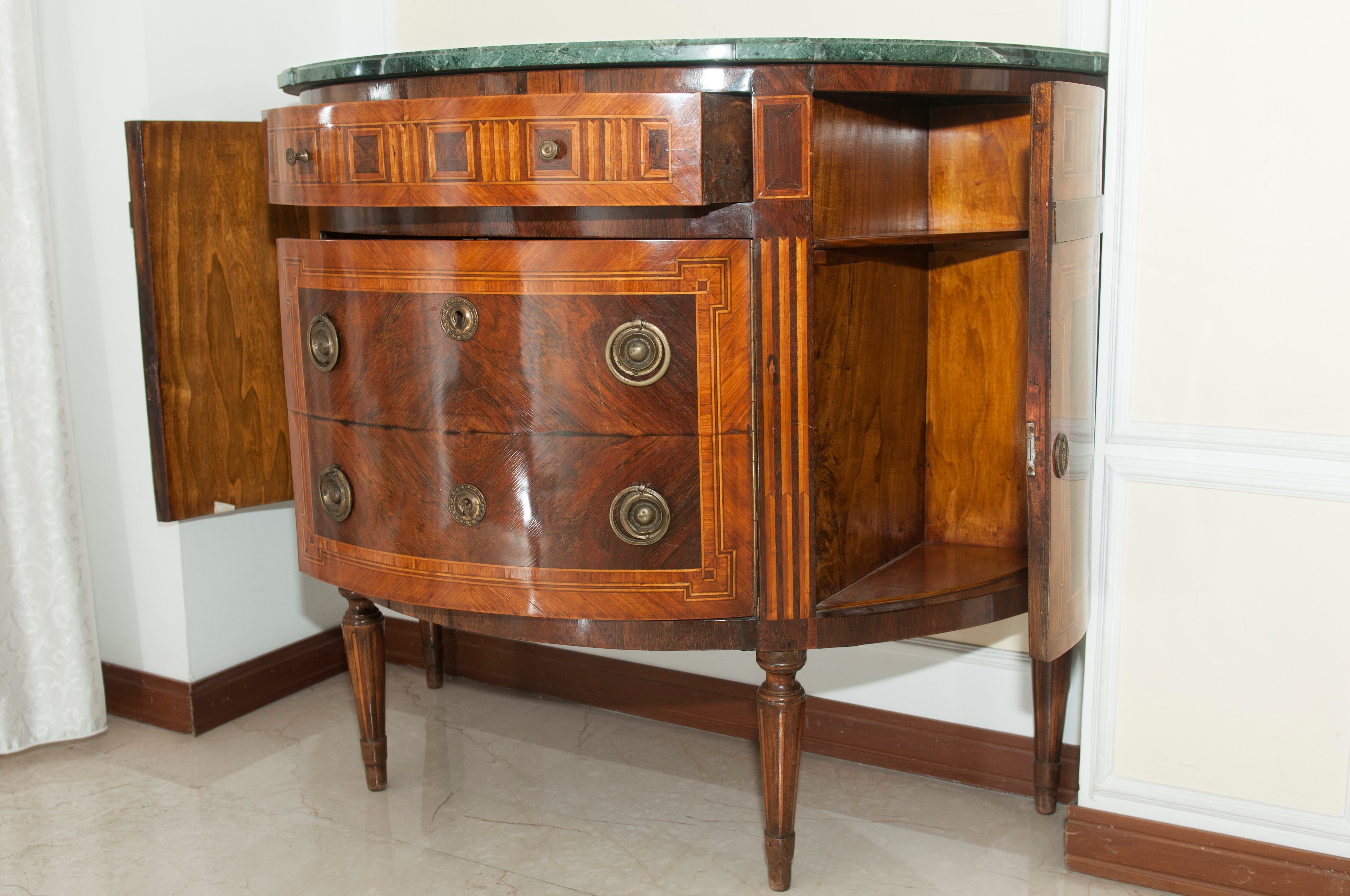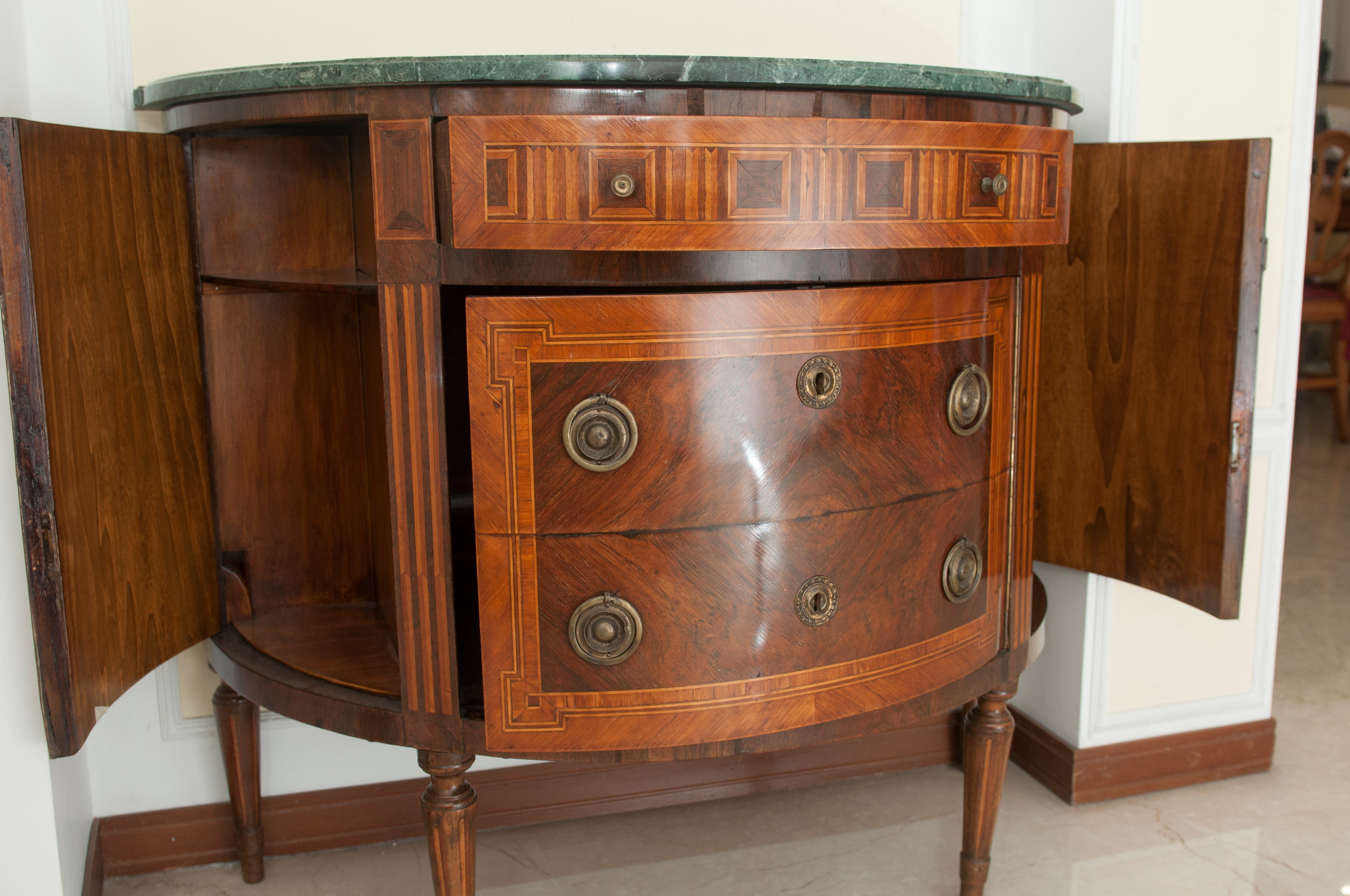 Made of mahogany. With three drawers in the upper section and three vaneaux doors in the body. Fluted inverted cone legs. Geometric fruitwood panels on the front and sides.