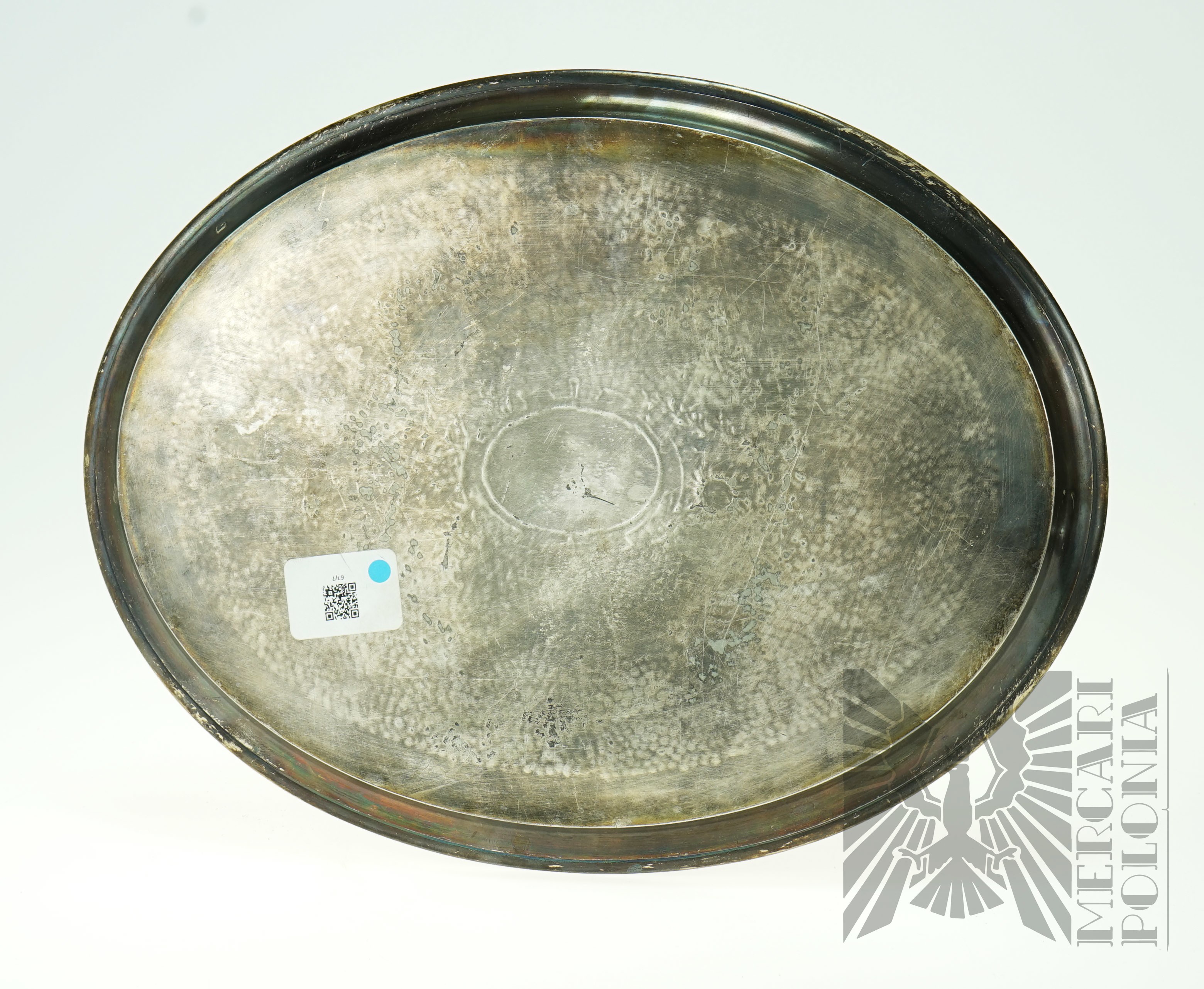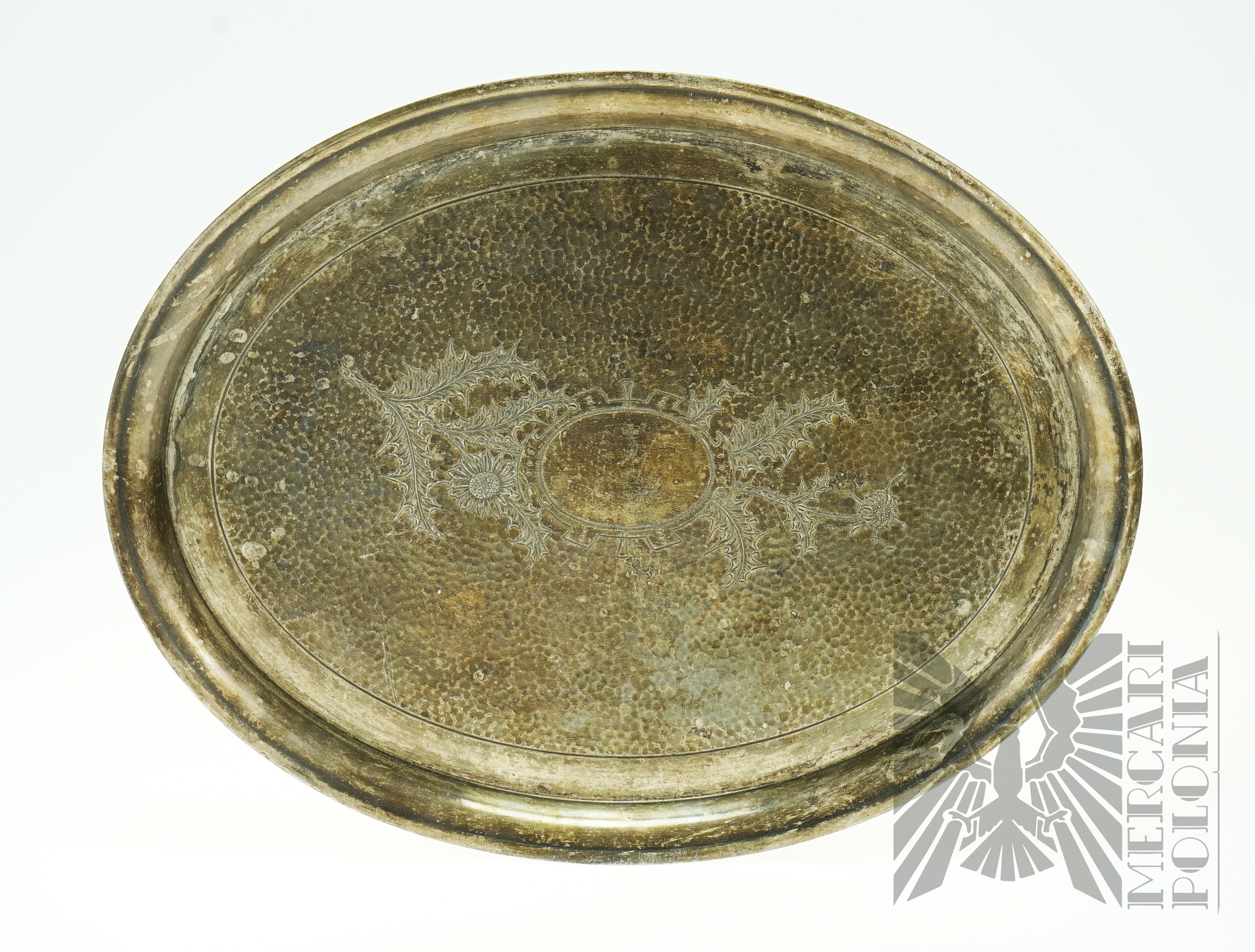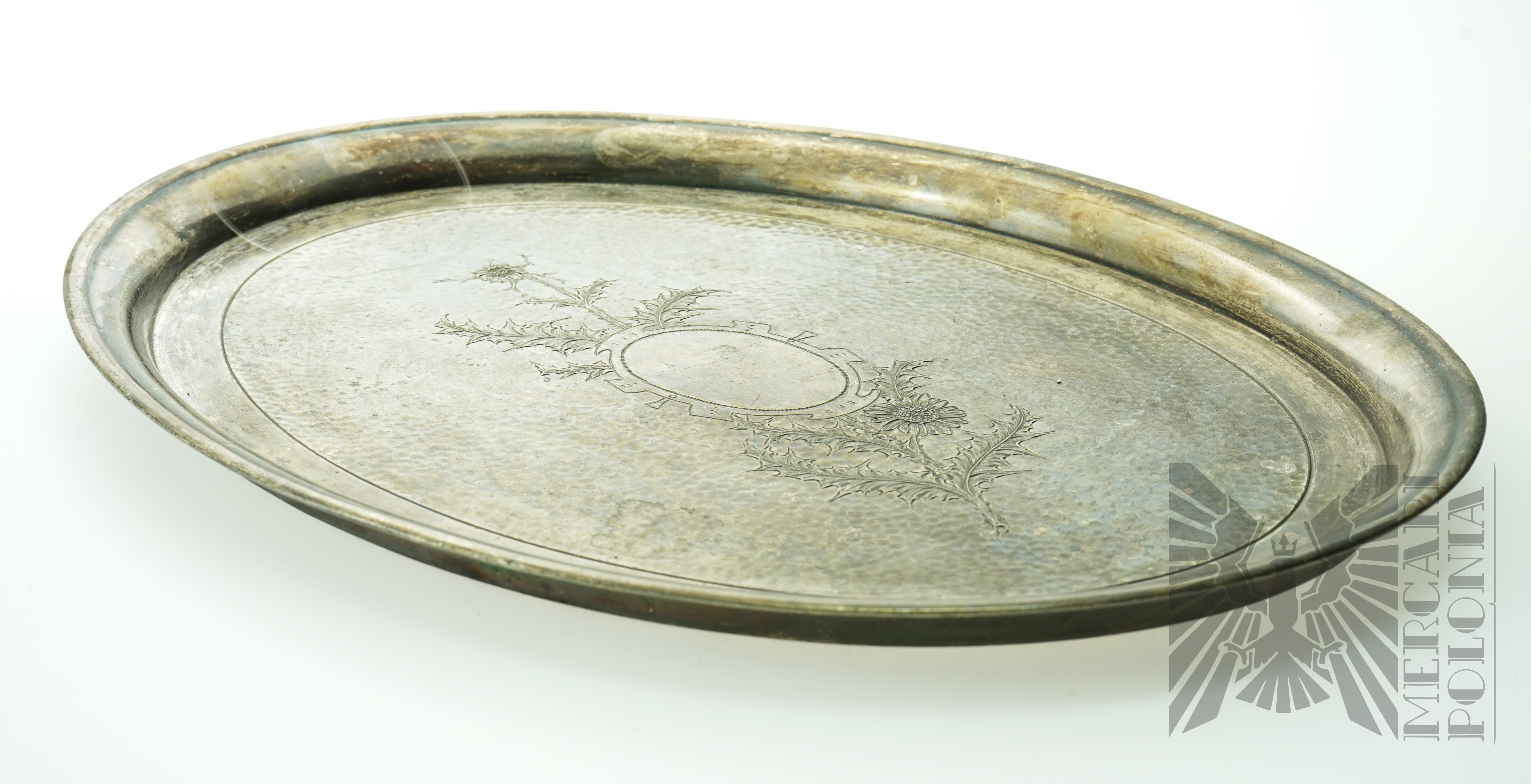 Patera w formie owalu, taca platerowana z widocznymi zdobieniami w formie kwiatów osetu, ranty wygięte ku górze mechanicznie tworzące piękne wykończenie patery.