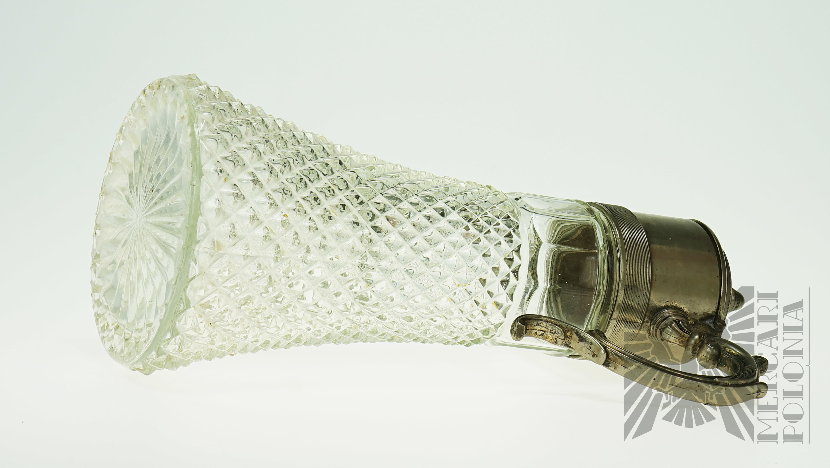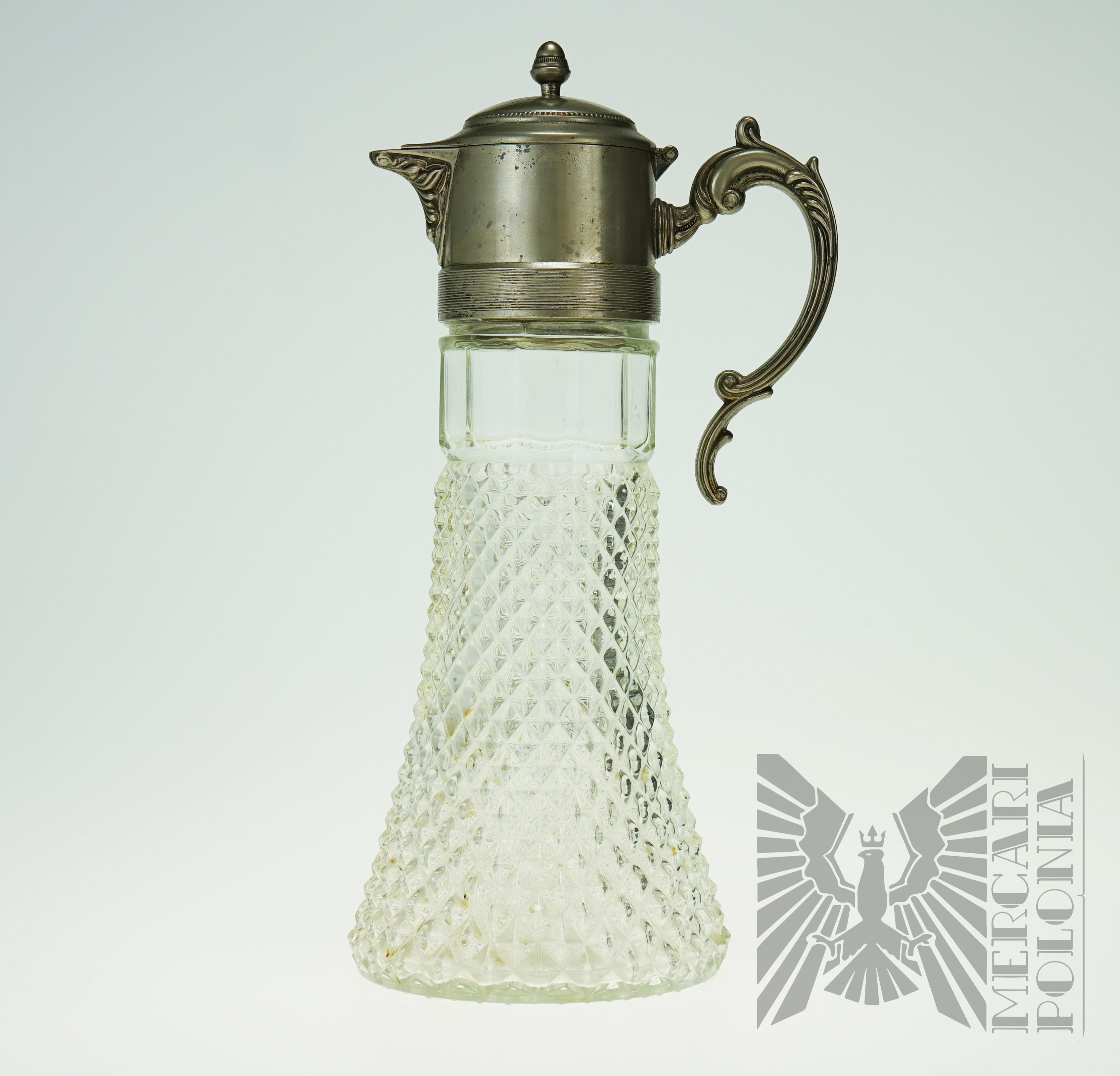 Dzbanek do wody, kryształowy, ze zdobieniami. Okuty metalowym wiekiem i uchwytem.