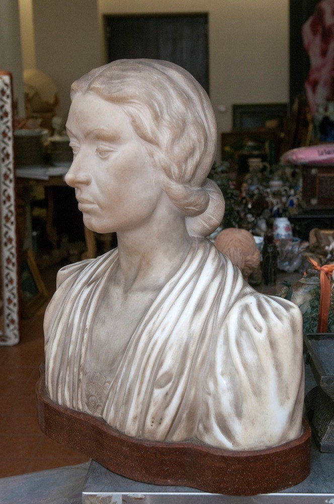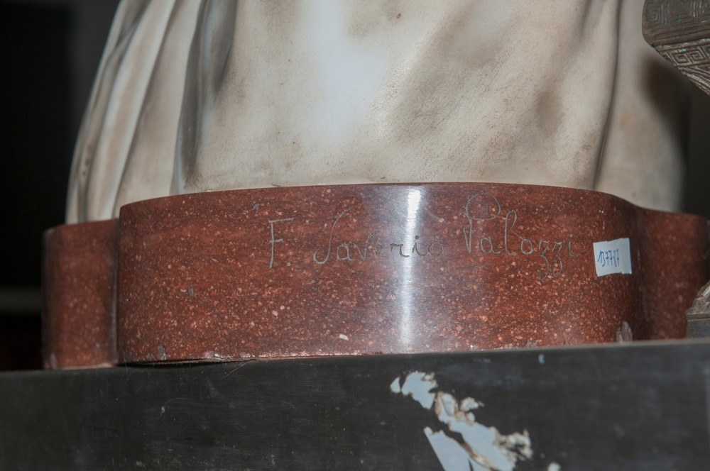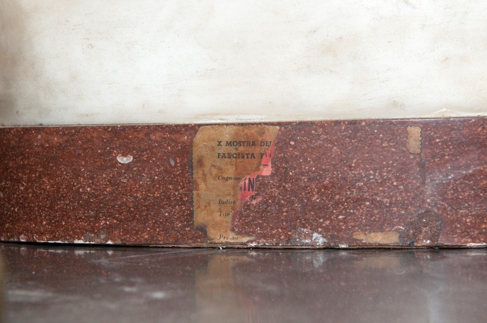 Made of white statuary marble on a red marble base. The work is signed by Francesco Saverio Palozzi. On the back of the base is part of the label from the tenth exhibition of fascist art in Rome, 1932-34, marking the tenth anniversary of the revolution.