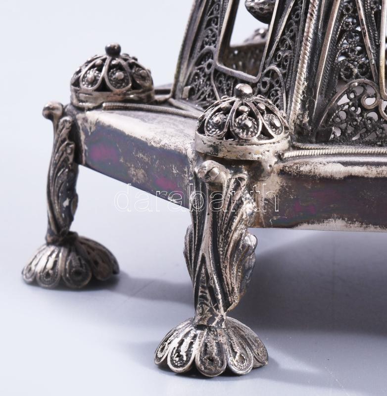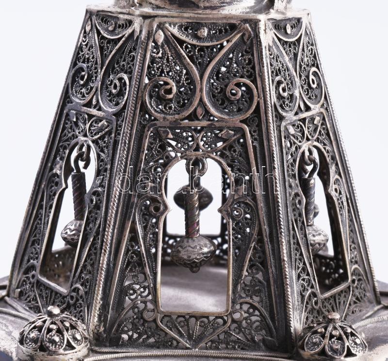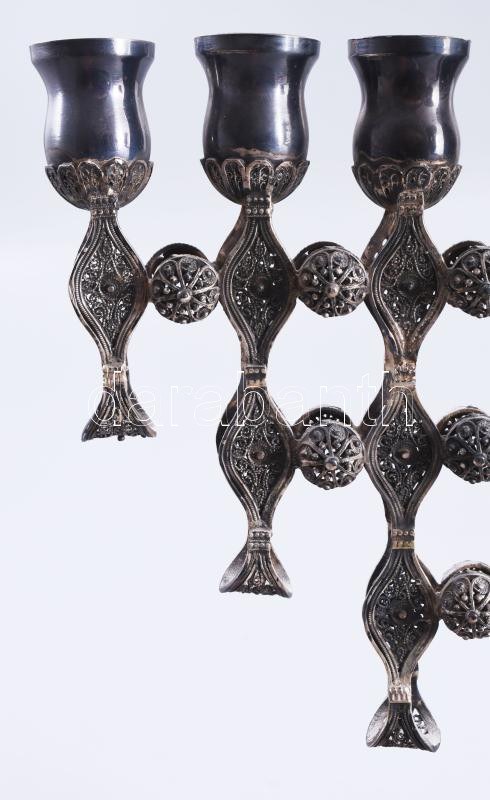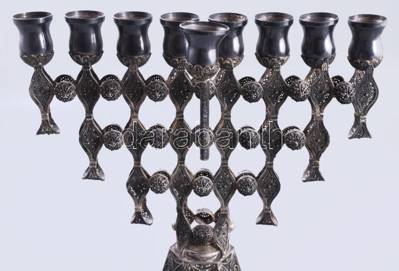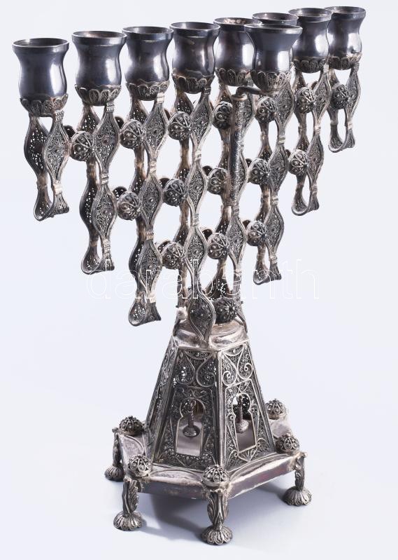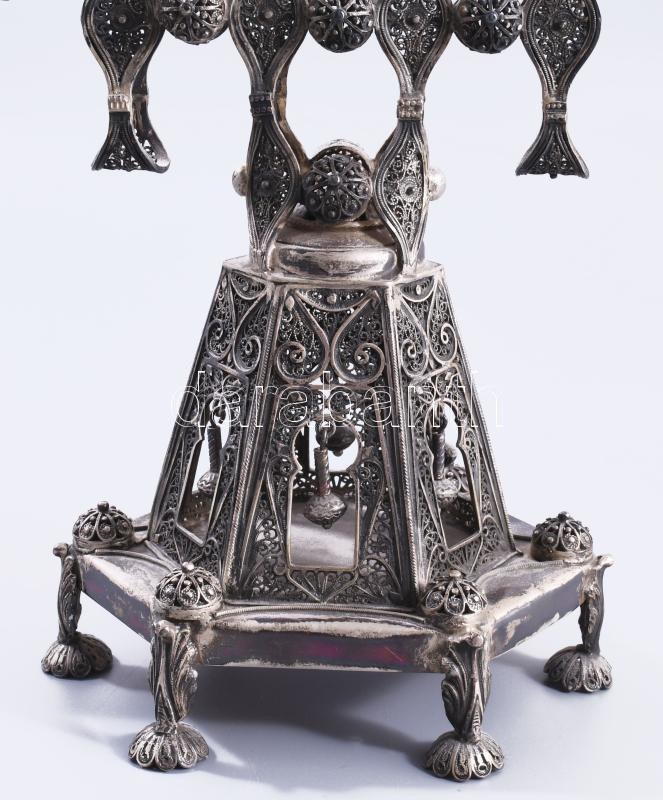 Filigrán ezüst (Ag) hanukai menóra samesszel. cca 19. sz. vége, gazdag filigrán díszítéssel, jelzett, 28x25 cm, nettó 754g /// Filigree Silver (Ag) Hanukkah Menorah with Samash, circa late 19th century, richly decorated with filigree, hallmarked, 28 × 25 cm, net weight 754 g. A tétel a Darabanth Galériában tekinthető meg és vehető át nyertes licit esetén. (Paulay Ede u. 25-27. https://www.darabanth.com/galeria/)