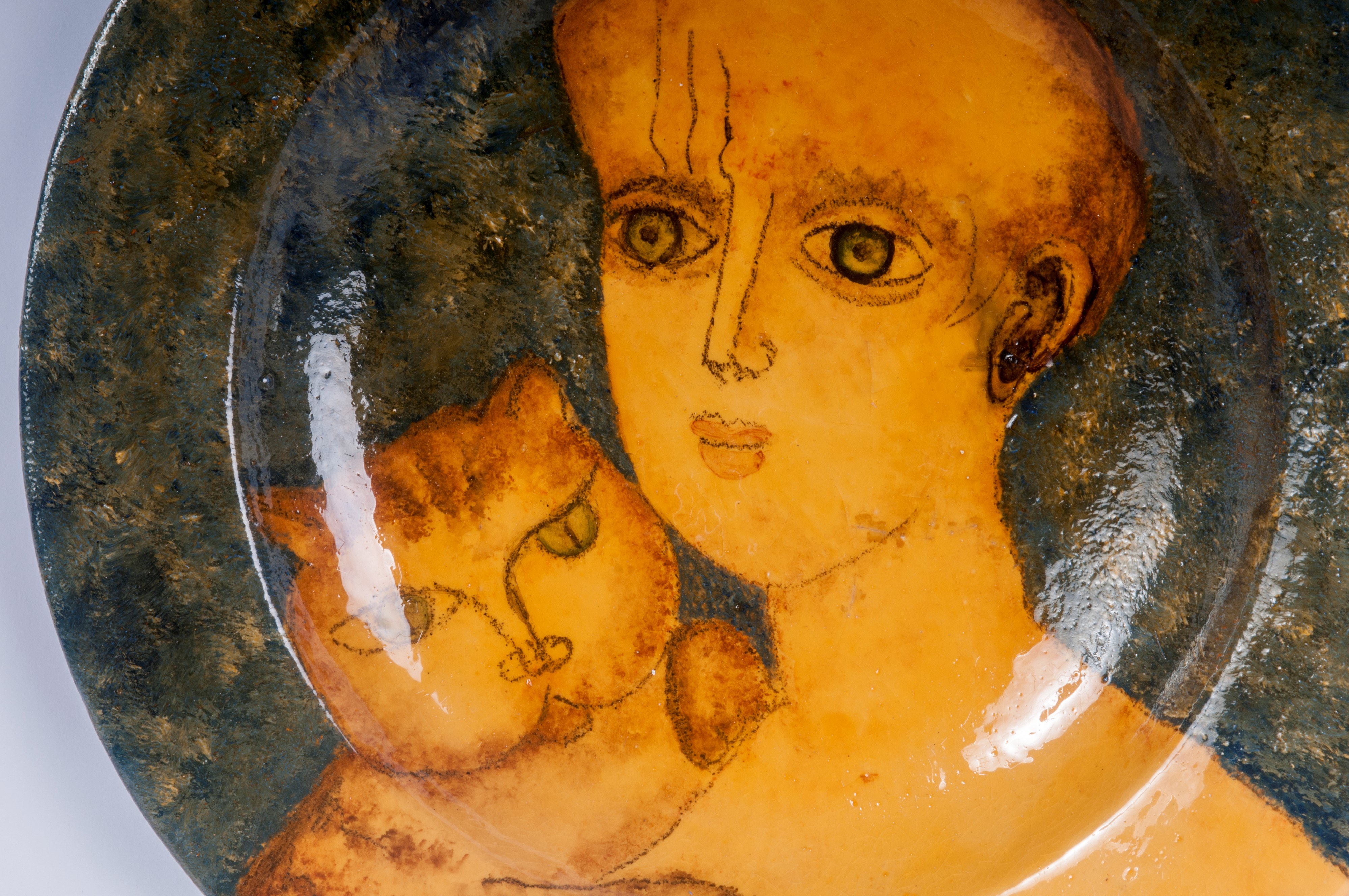 Decorated with a woman's face and a cat in ochre on a green background. Signed on the back by Manifattura G. Rossicone Milano.