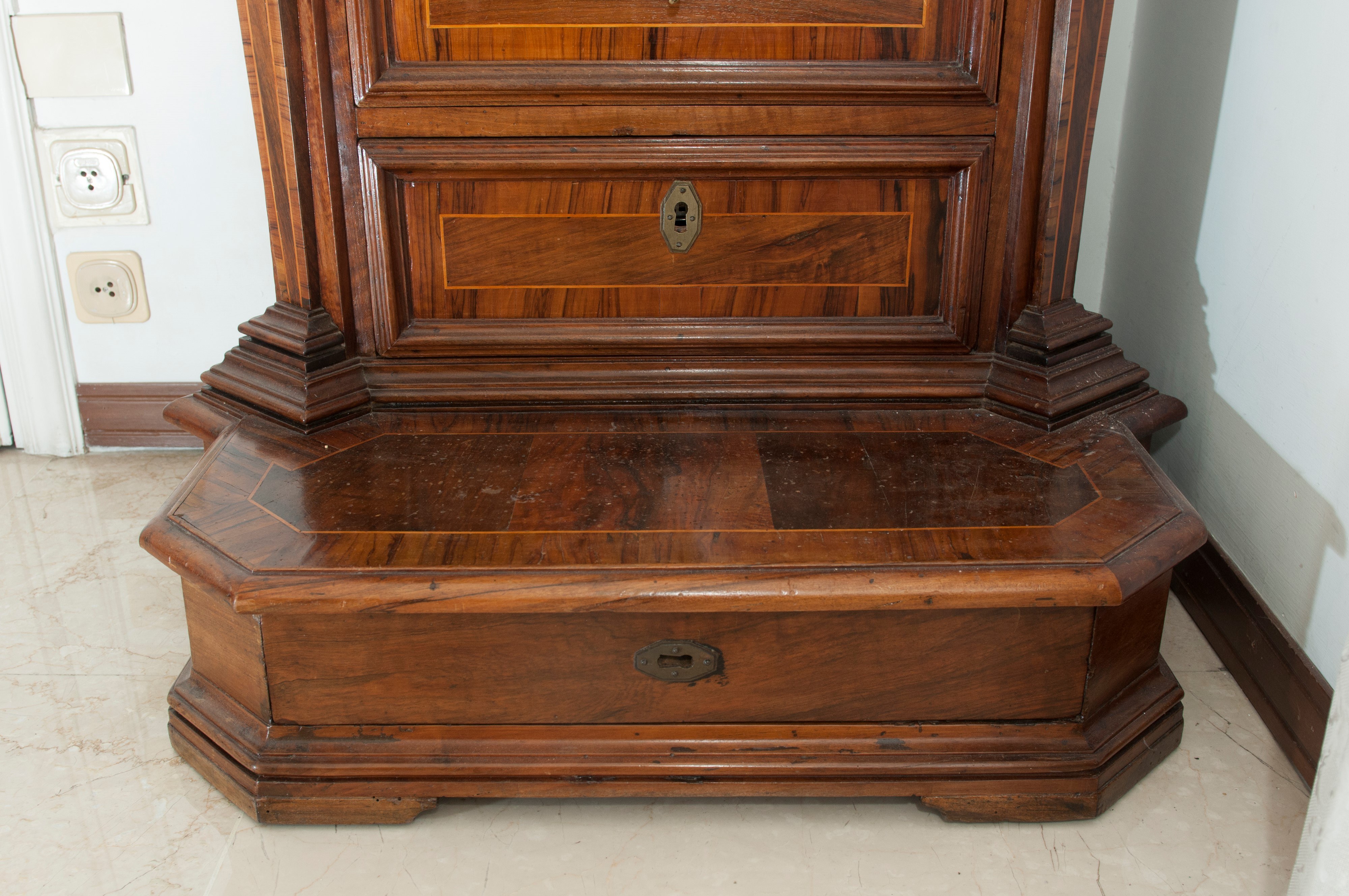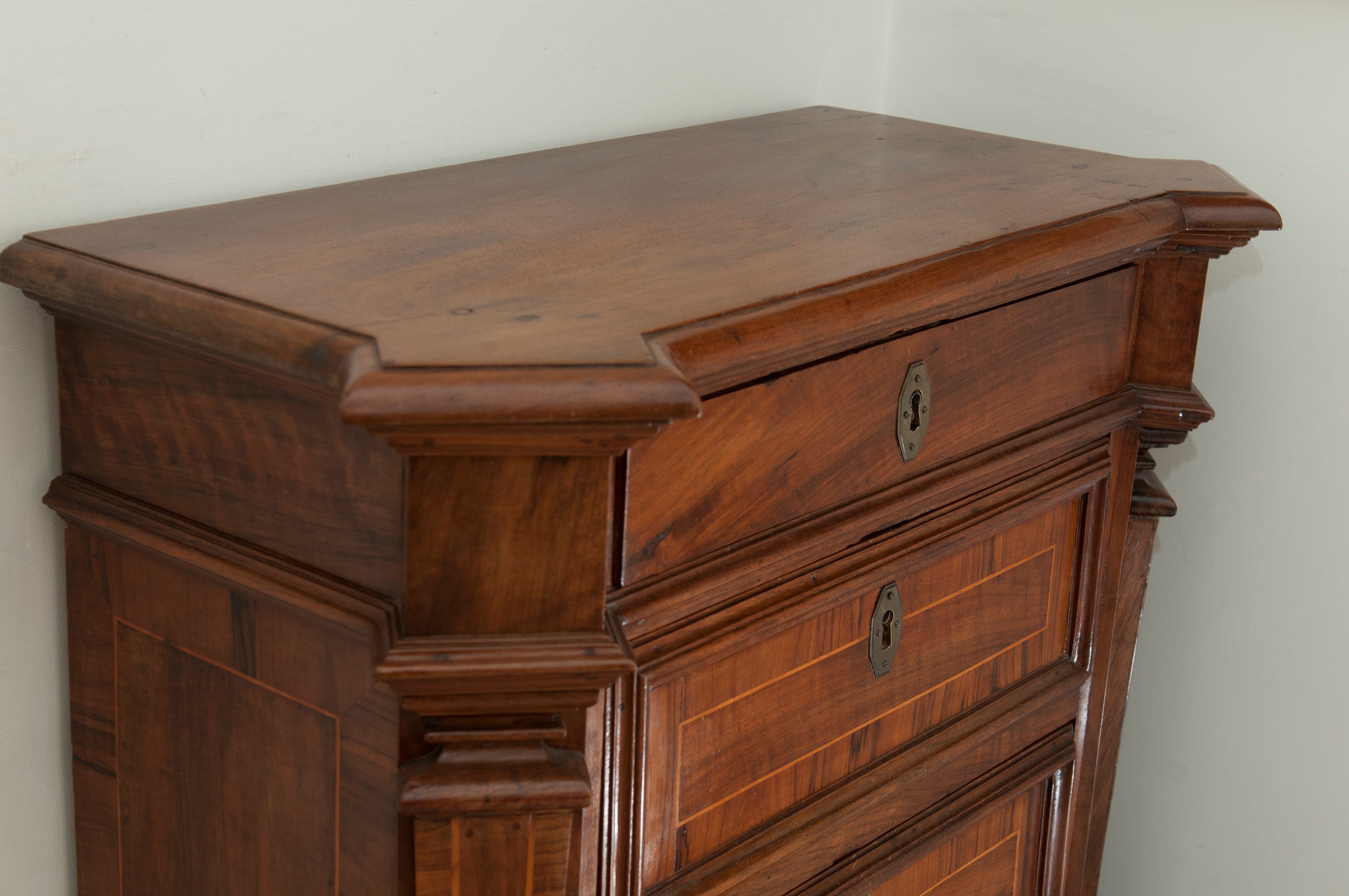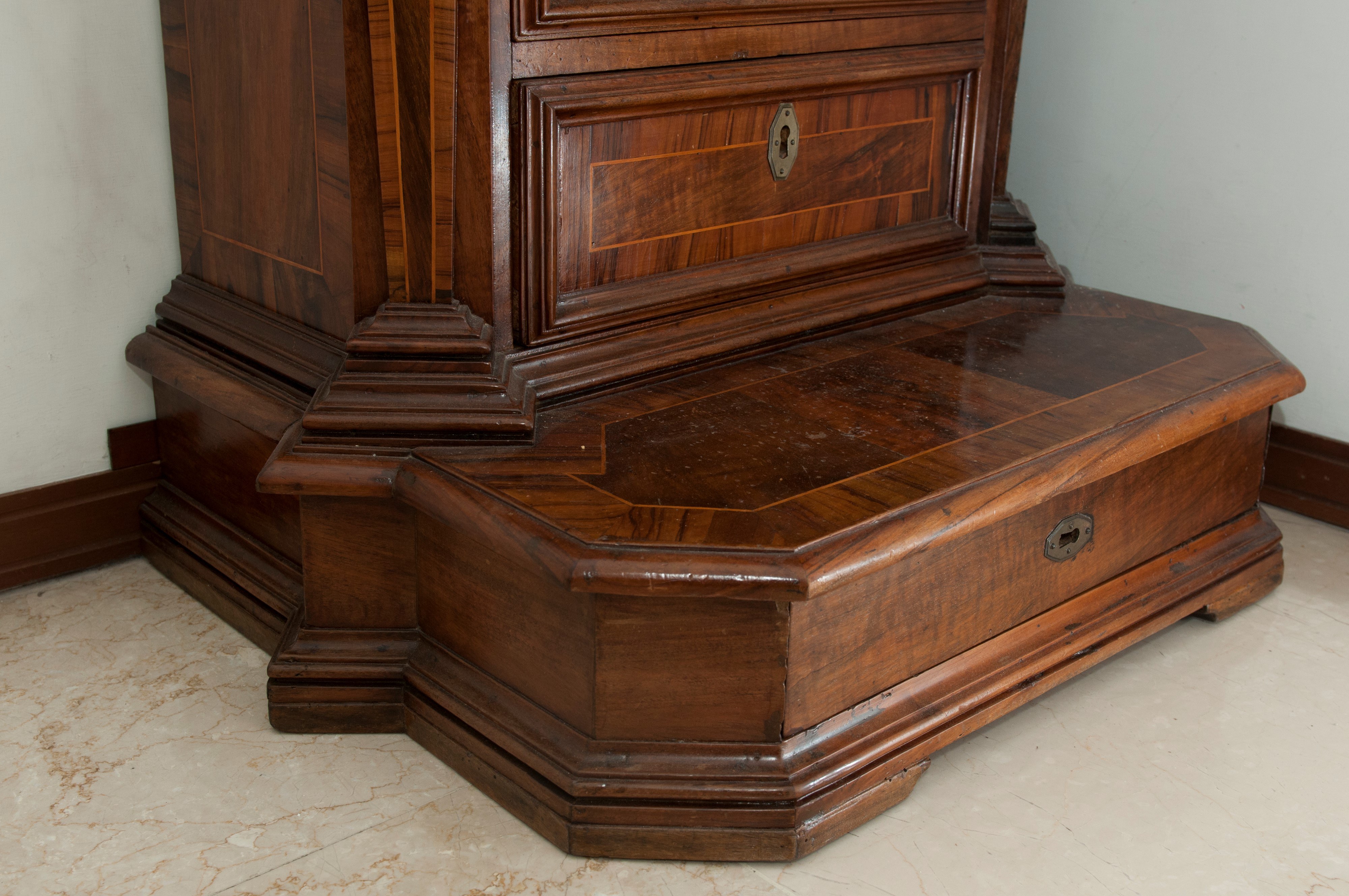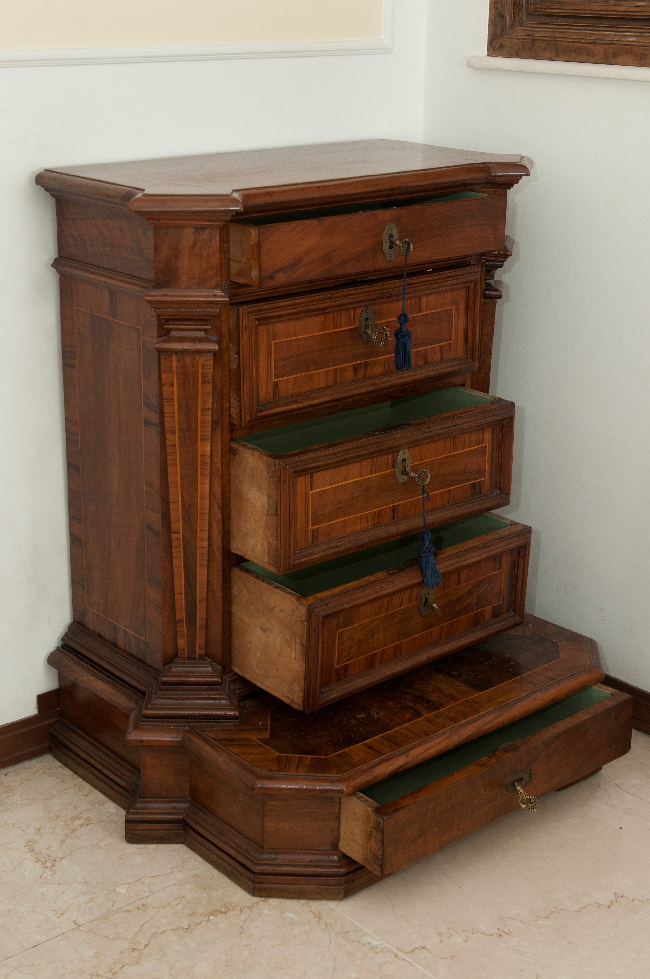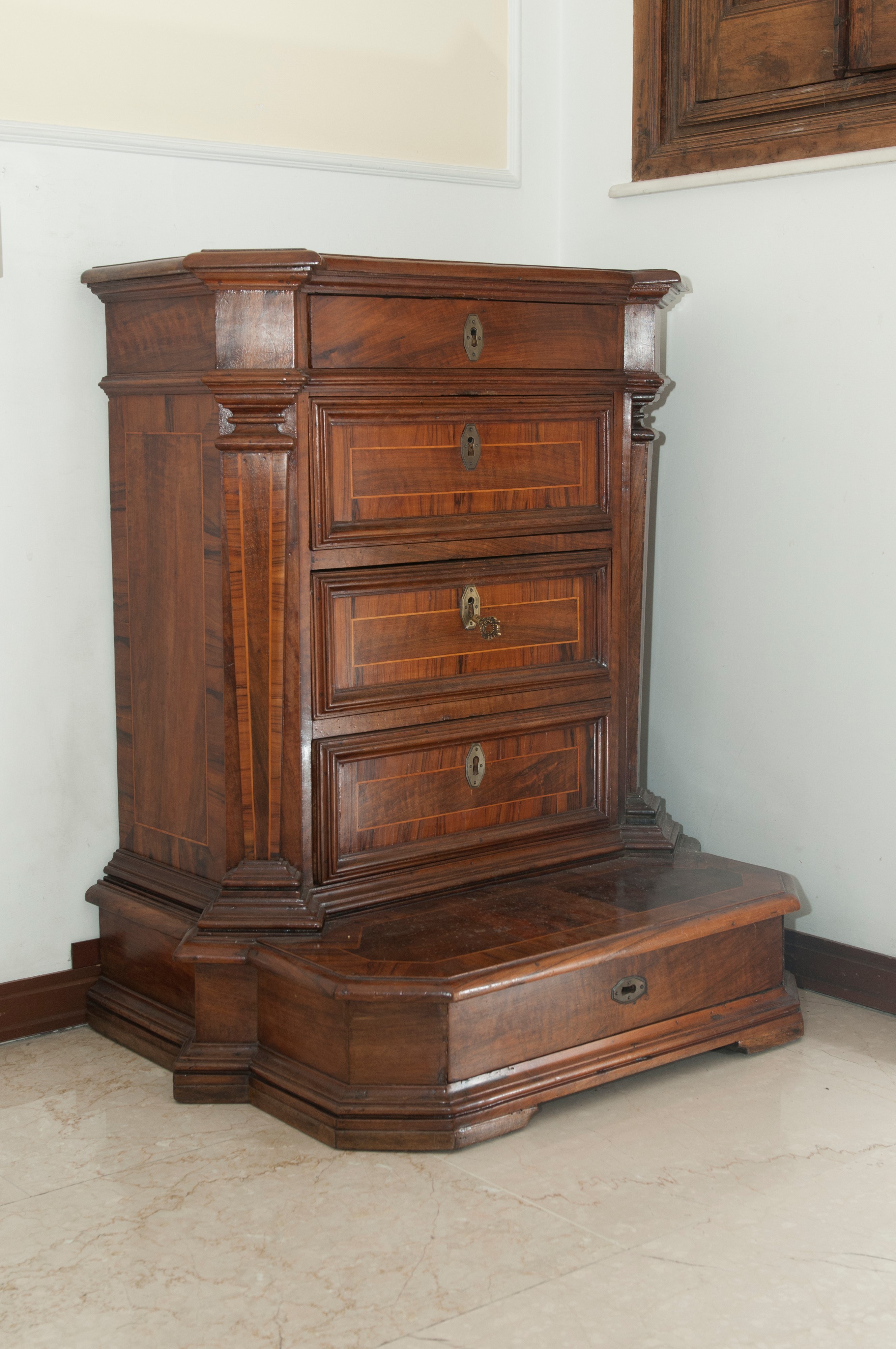 di forma rettangolare con angoli scantonati a lesene e pedana d'appoggio, cornice del piano aggettante a becco di civetta. Fronte , fianchi e pedana con quadrature in legno di frutto. Boccole dei cassetti in lamierino di ottone esagonale.