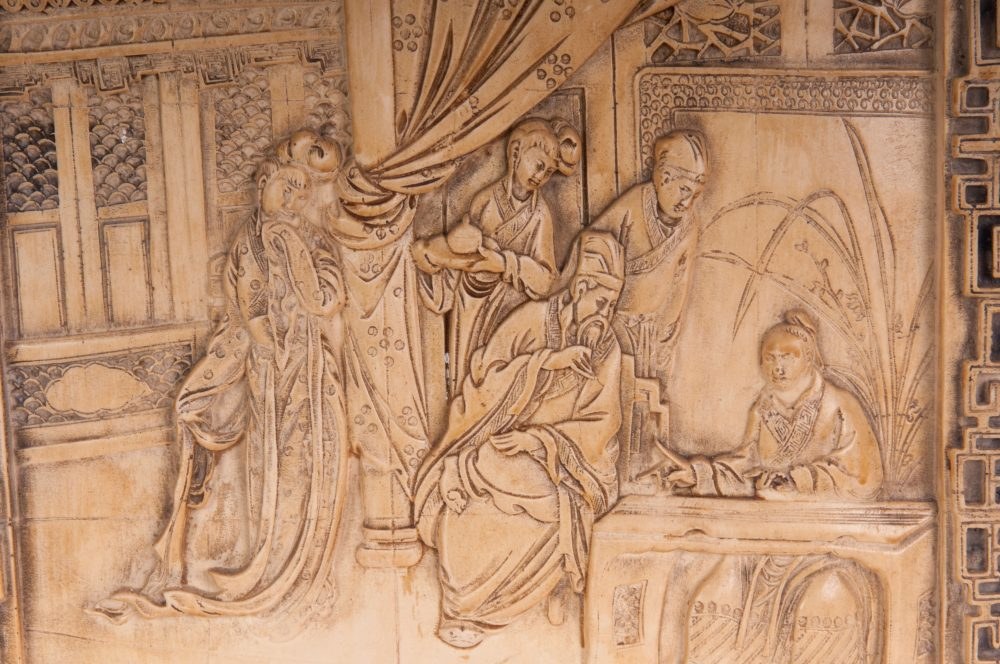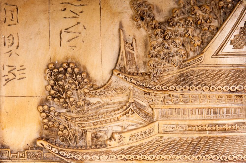 with scenes from the Far Eastern repertoire with characters and temples.