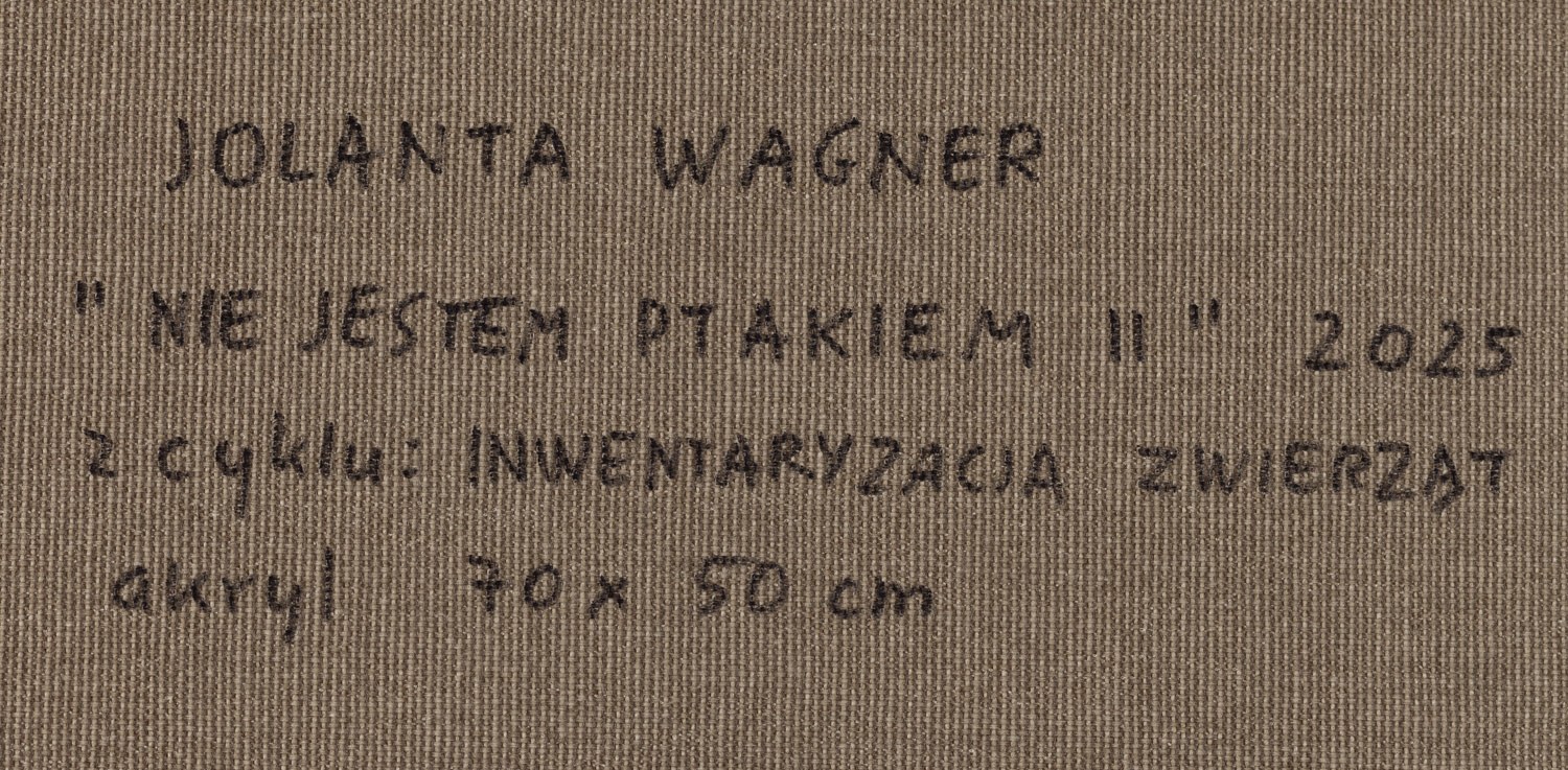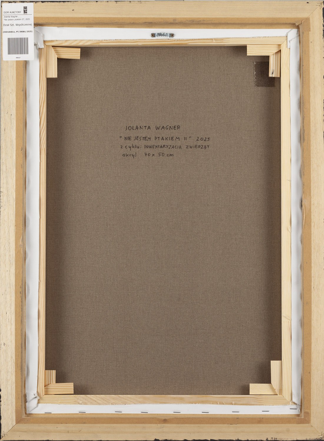 sygnowany, datowany i opisany na odwrociu: 'JOLANTA WAGNER | "NIE JESTEM PTAKIEM II" 2025 | z cyklu INWENTARYZACJA ZWIERZĄT | akryl 70 x 50 cm'