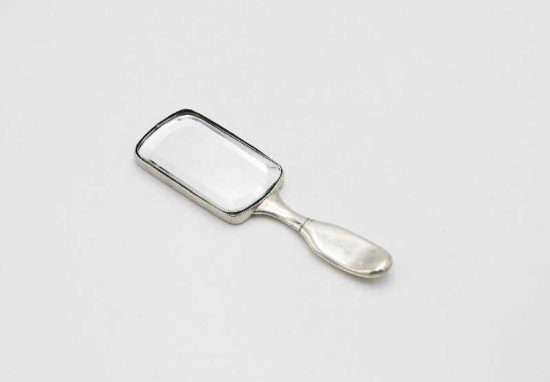Lusterko prostokątne, fasetowane w oprawie srebrnej z nakładanym kartuszem z herbem Korczak, otoczonym grawerowaną dekoracją akantową; raczka łopatkowata, gładka.