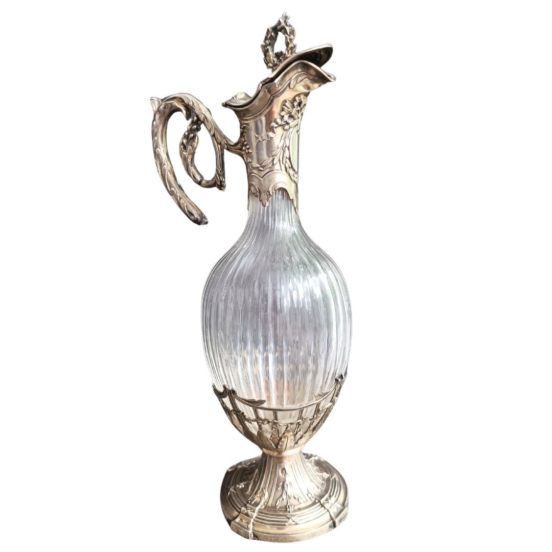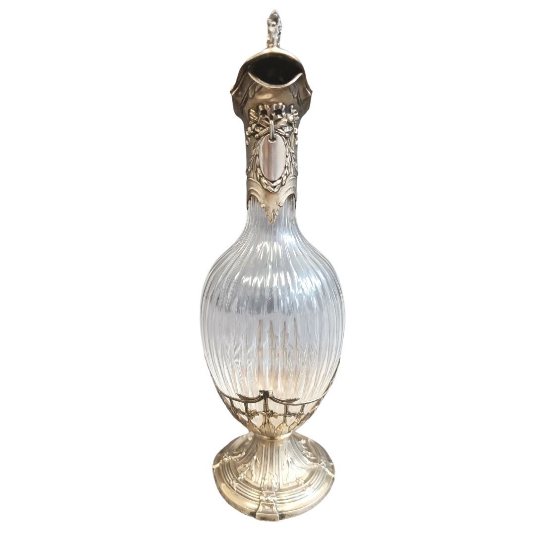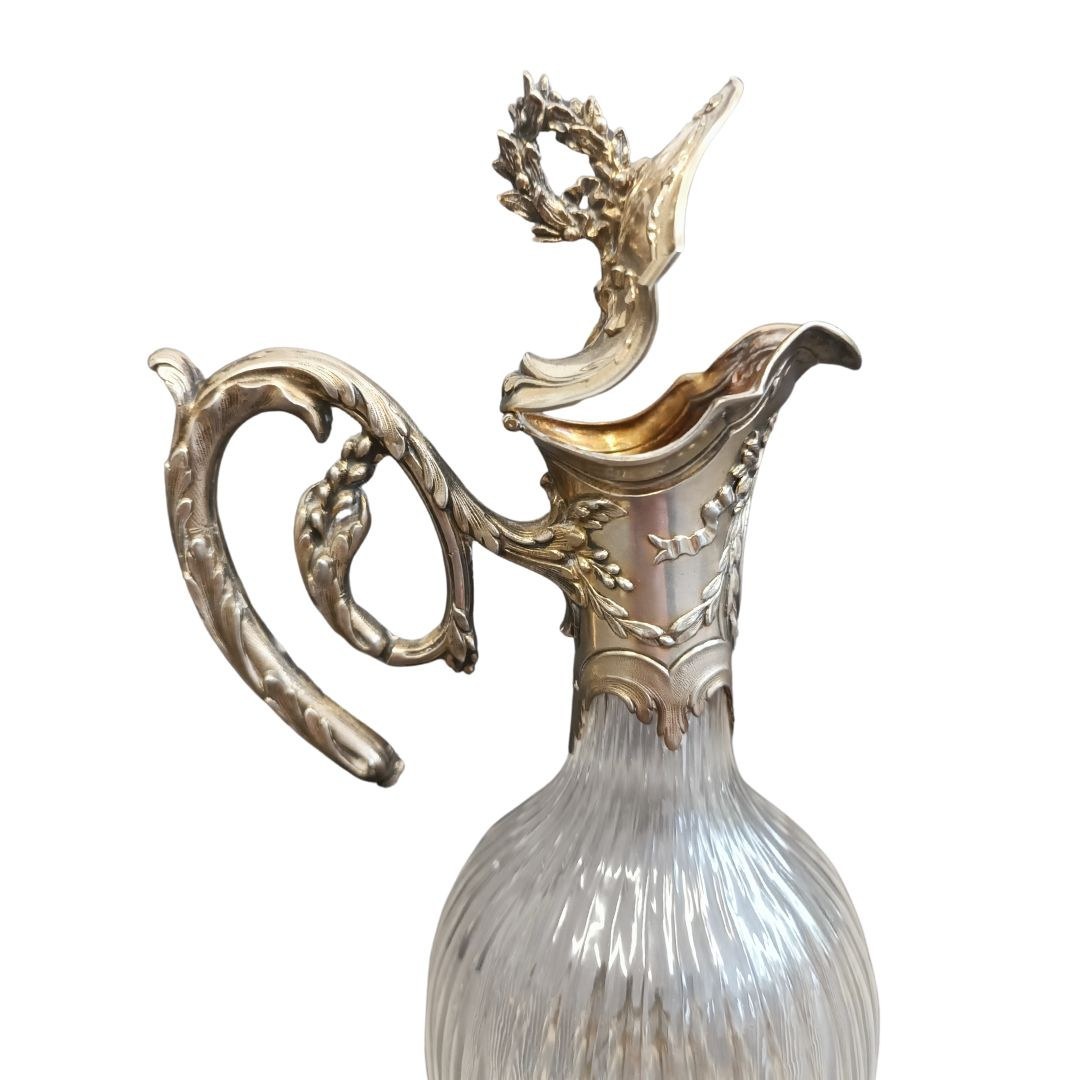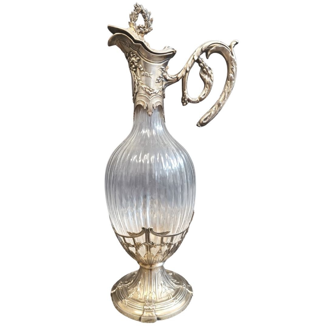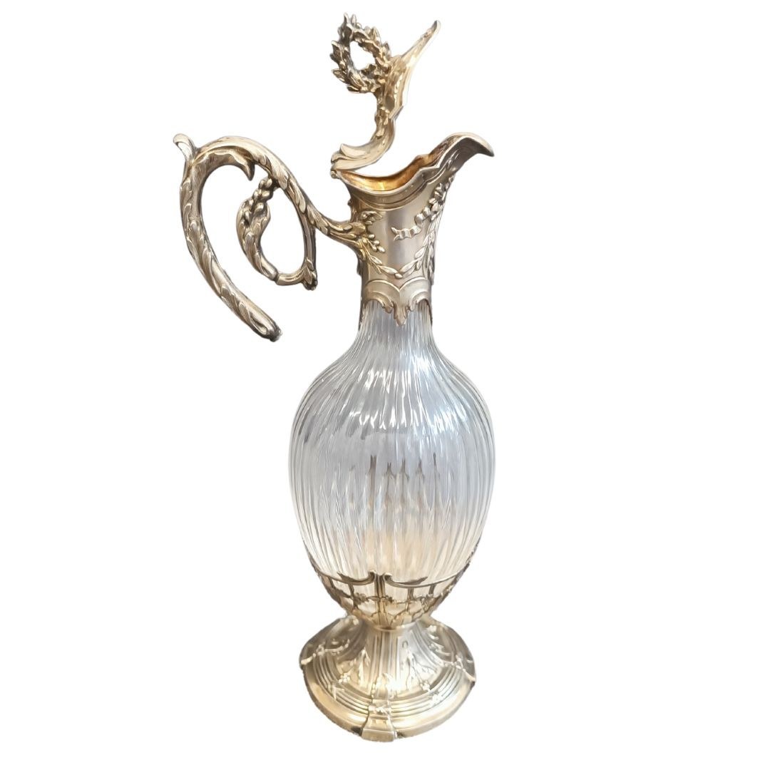 Piękna karafka z kryształu, z podstawą, rączką i dzióbkiem ze srebra, bogato zdobiona motywami roślinnymi. Wykonana w stylu Ludwika XV / neorokoko, popularnym w II poł. XIX w., w paryskiej pracowni złotnika Victora Boivin*.