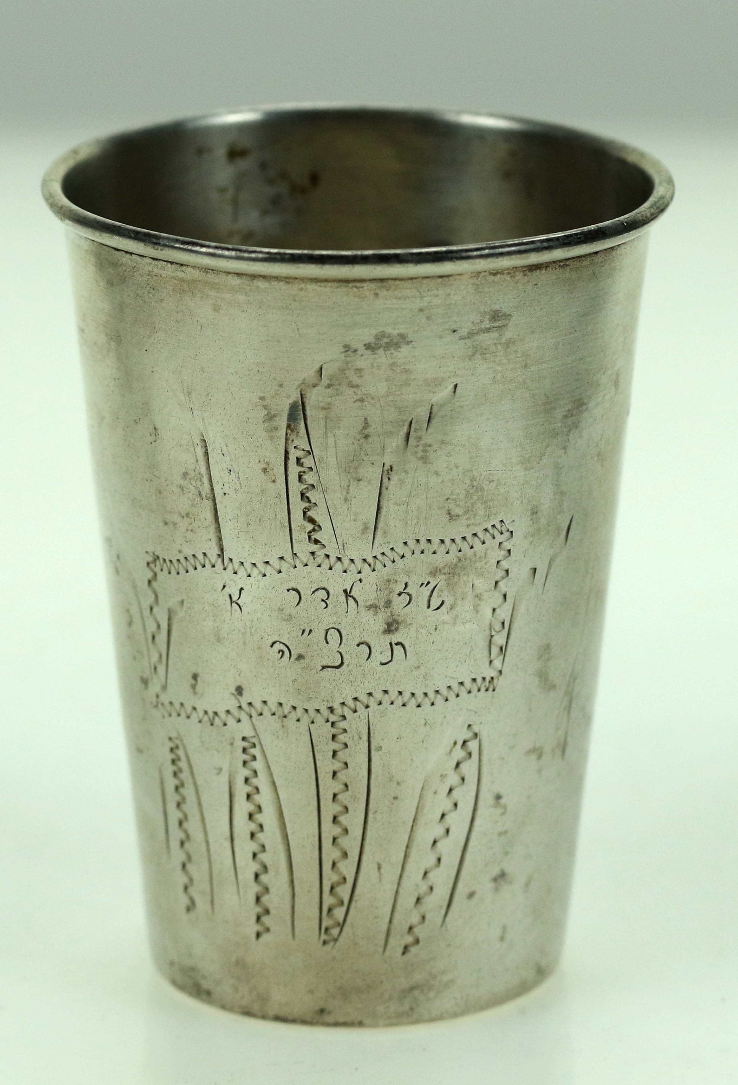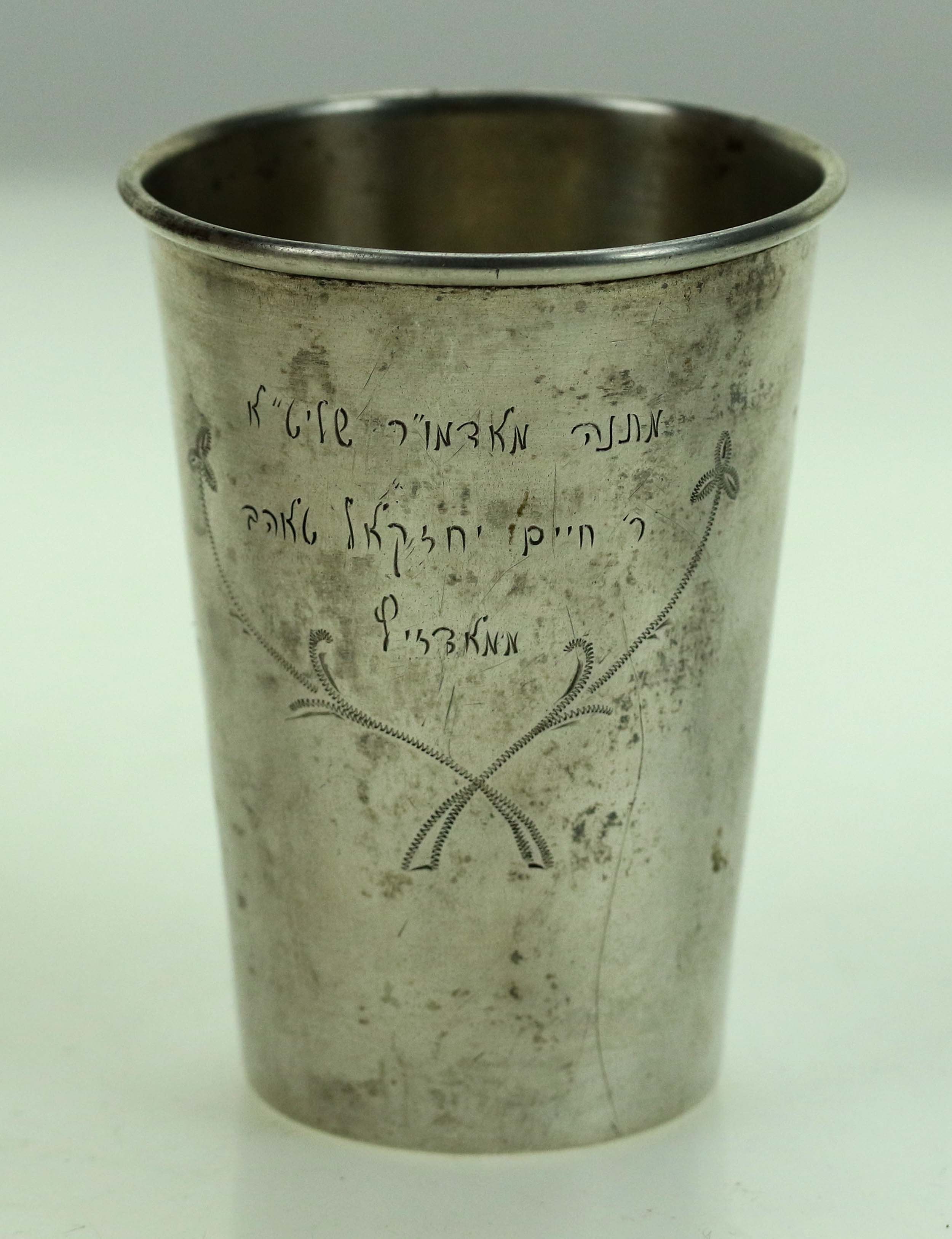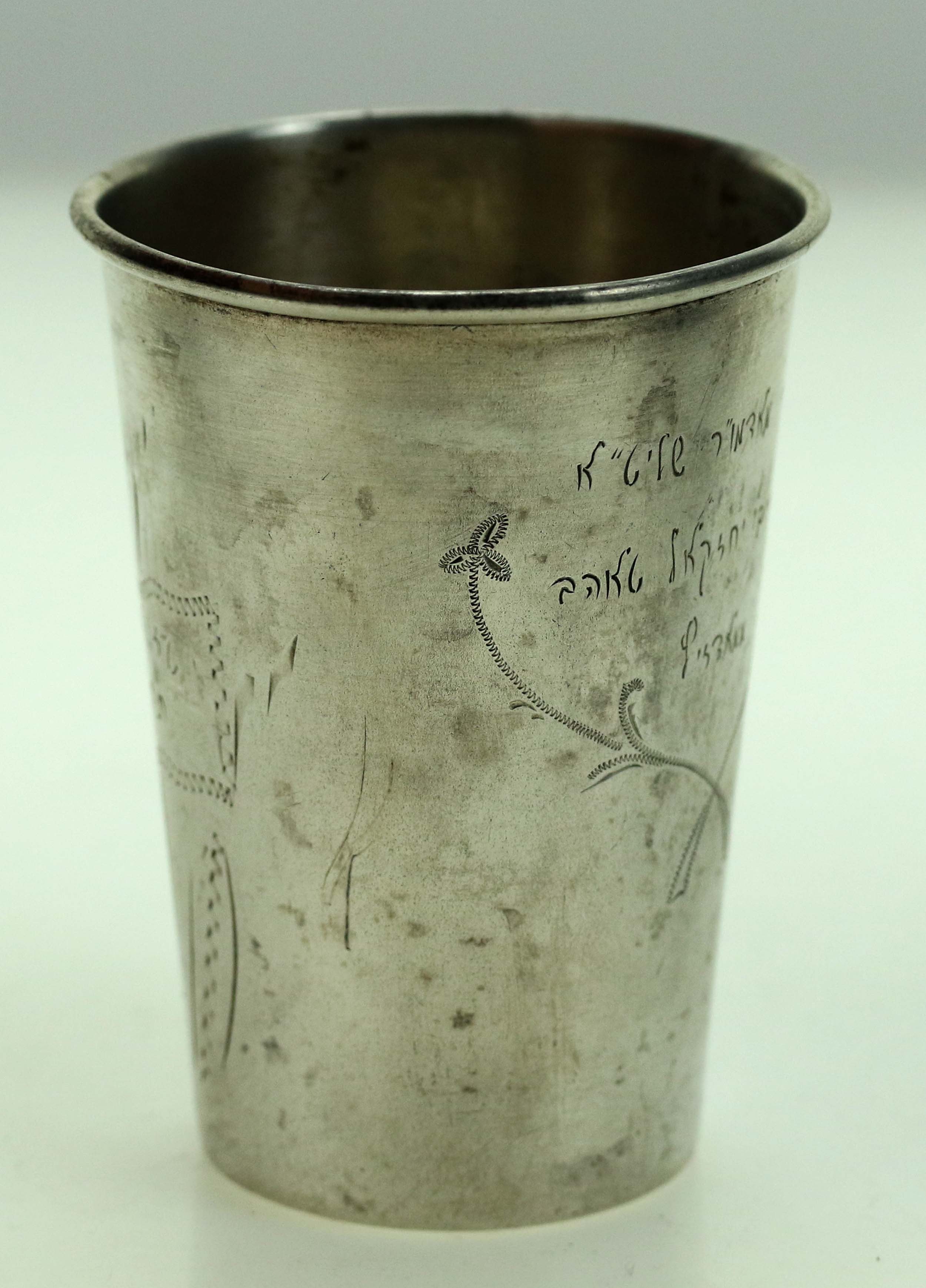 Kubek kiduszowy z napisem hebrajskim, Warszawa ok. 1930 r. Judaika. Przedwojenna warszawska cecha srebra 3 oraz nierozpoznana sygnatura wytwórcy. Napisy hebrajskie wykonane w epoce wkomponowane w zdobnictwo kubka. Srebro, waga 60g. Wysokość 8 cm.
