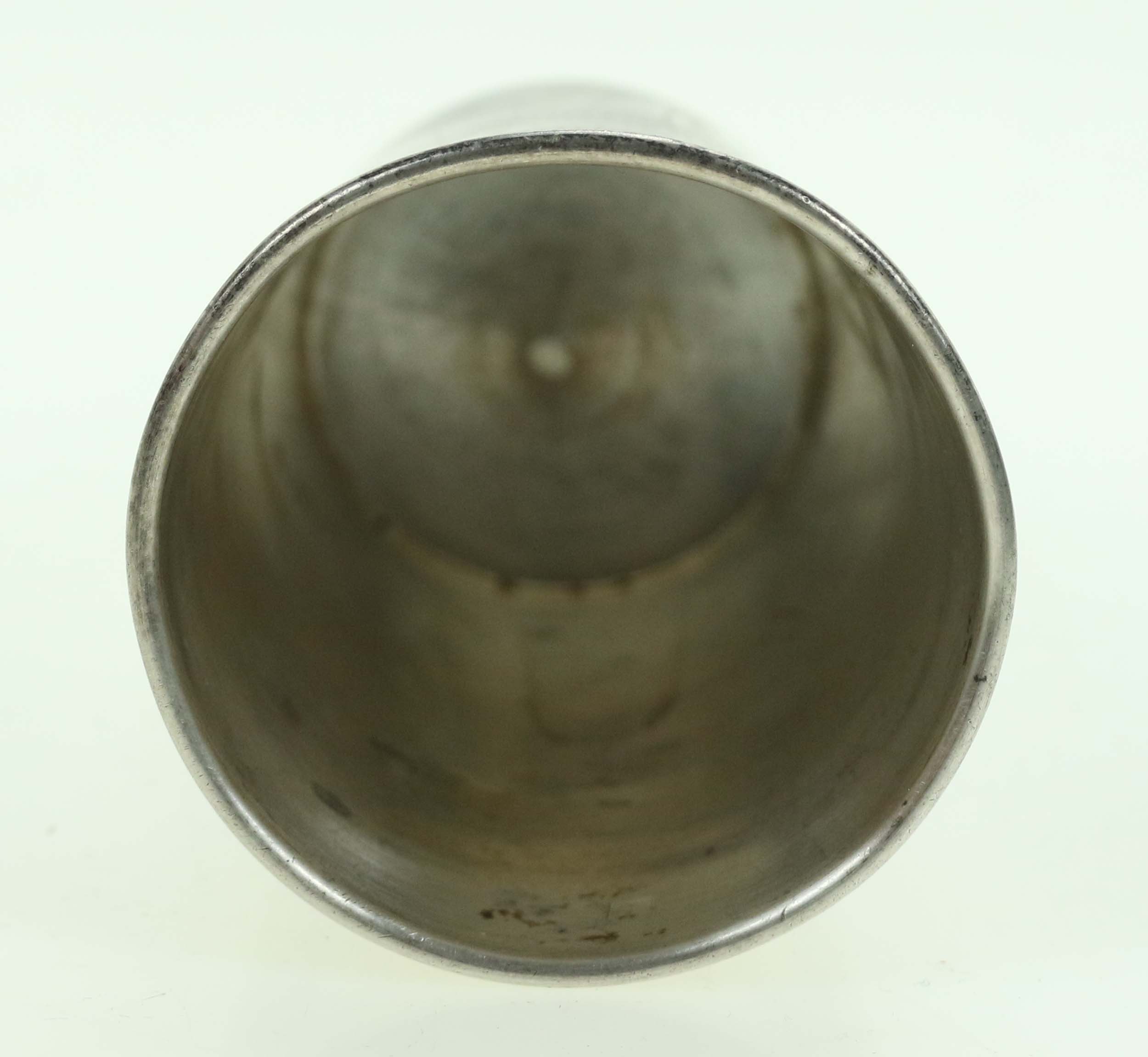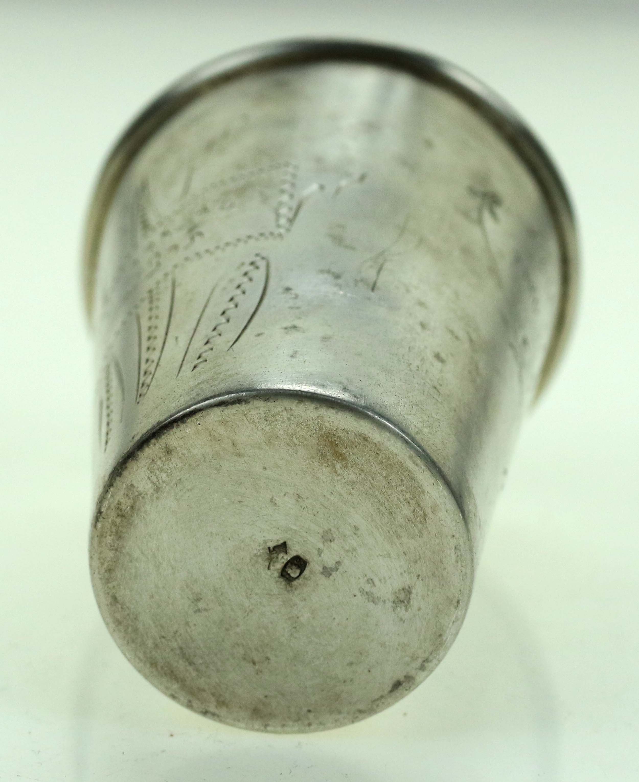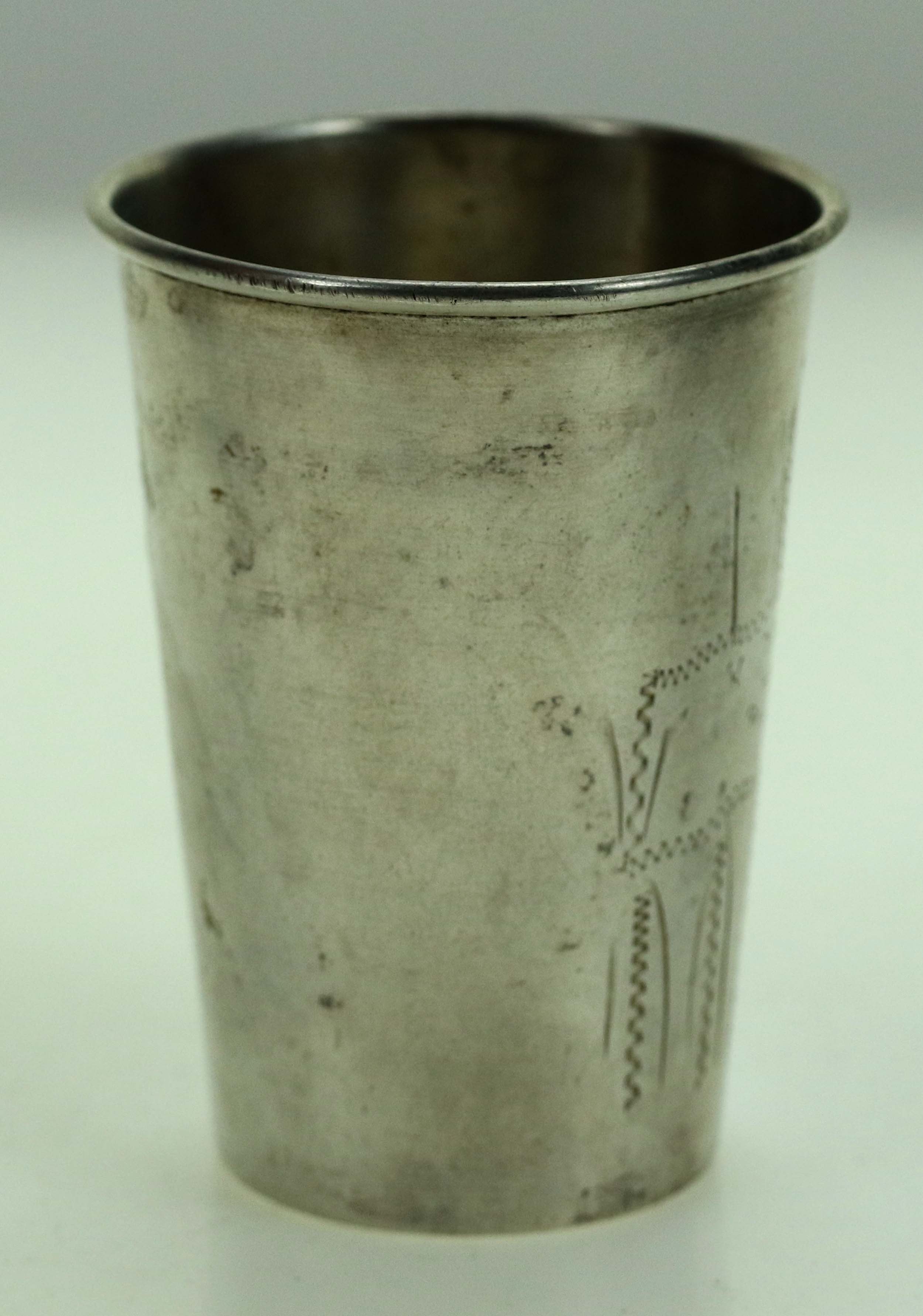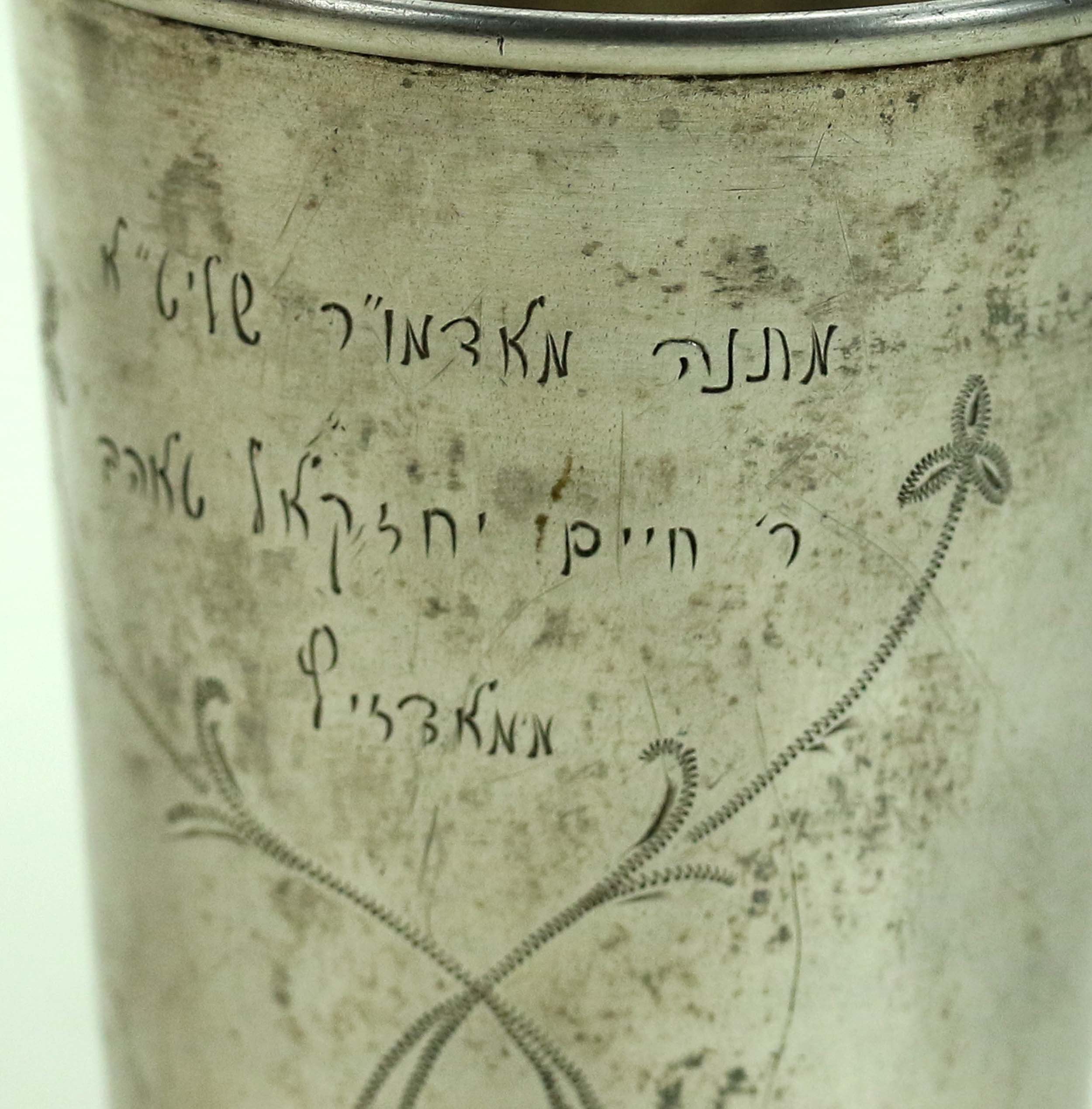 Kubek kiduszowy z napisem hebrajskim, Warszawa ok. 1930 r. Judaika. Przedwojenna warszawska cecha srebra 3 oraz nierozpoznana sygnatura wytwórcy. Napisy hebrajskie wykonane w epoce wkomponowane w zdobnictwo kubka. Srebro, waga 60g. Wysokość 8 cm.