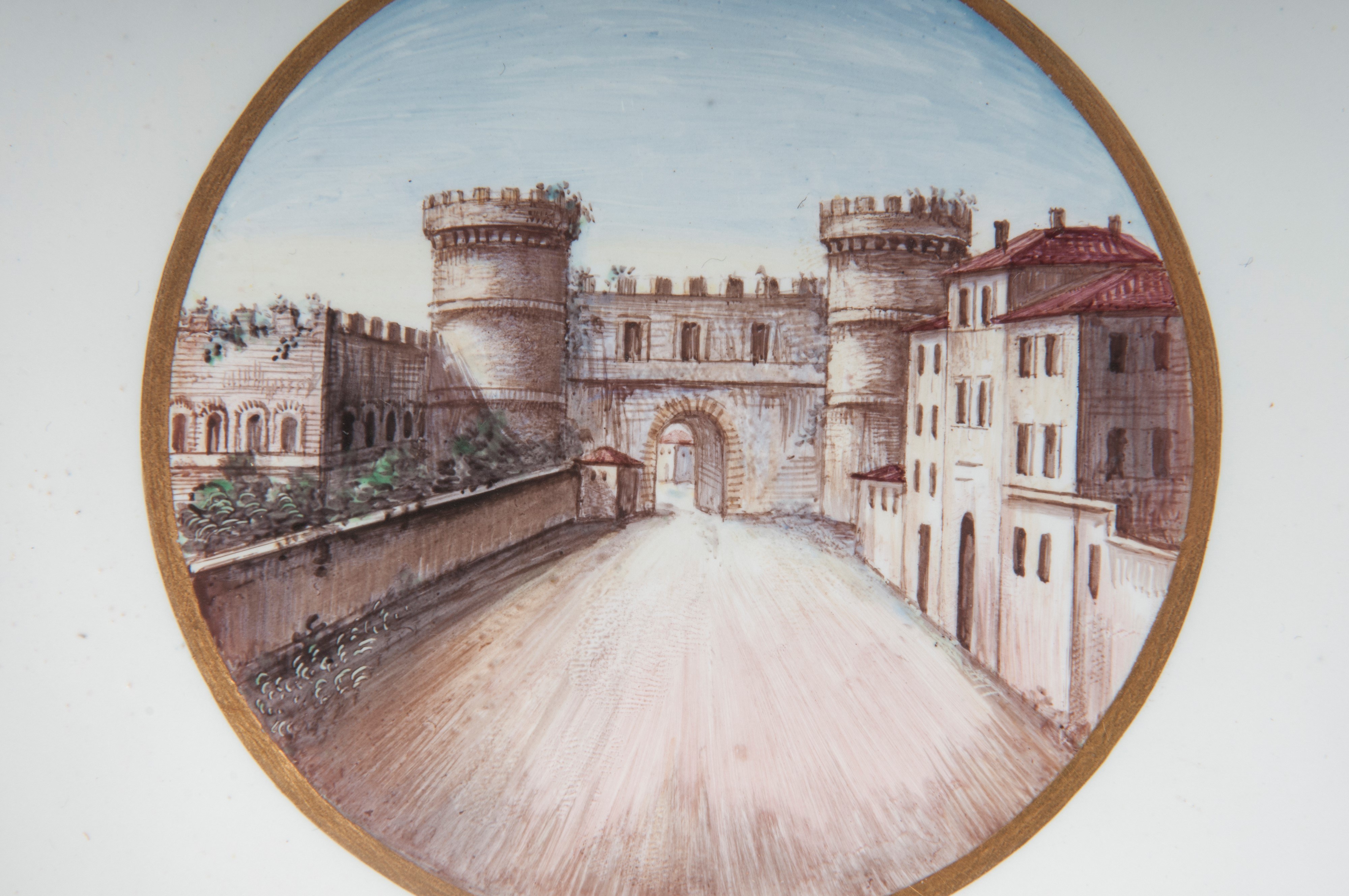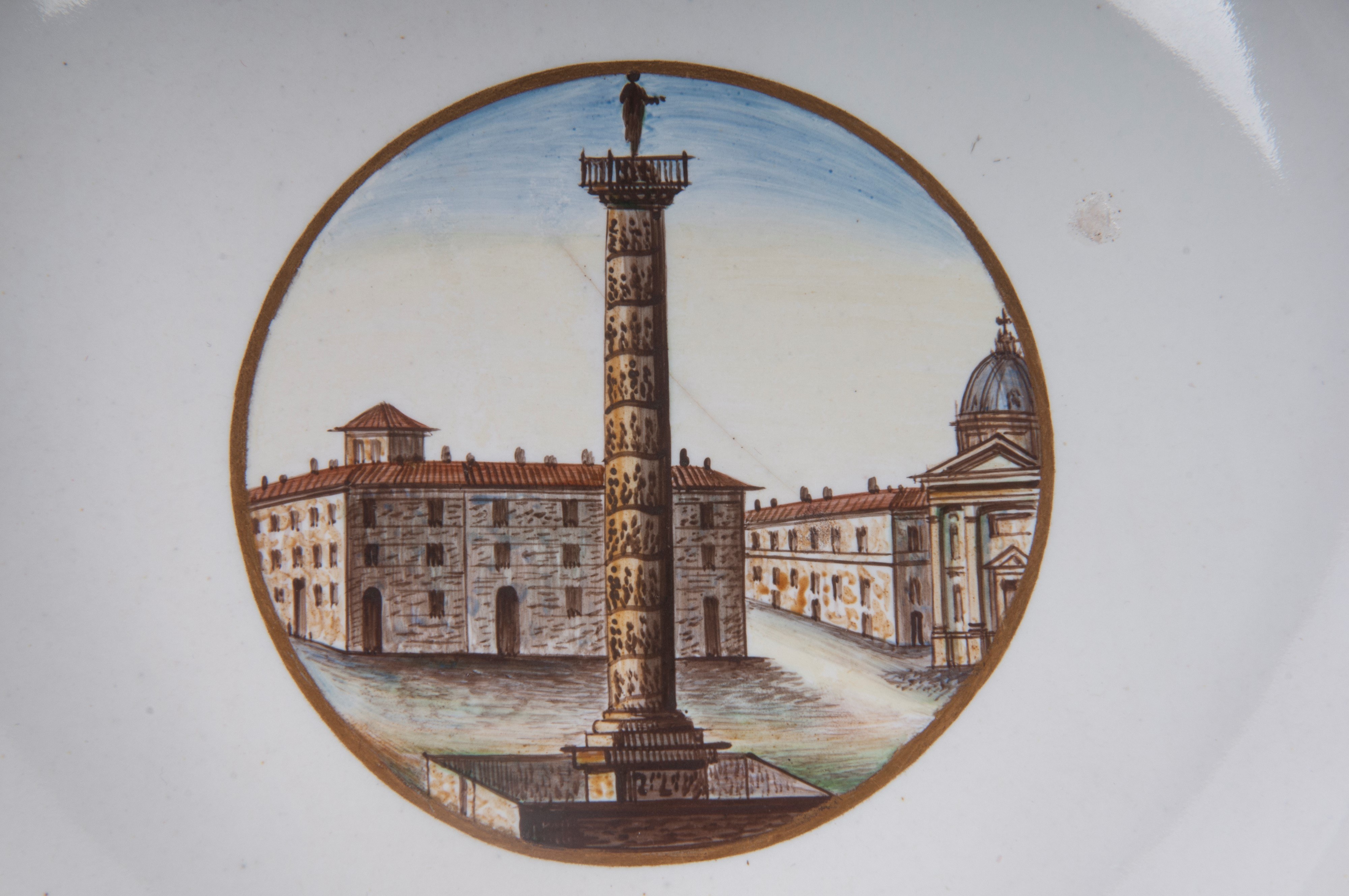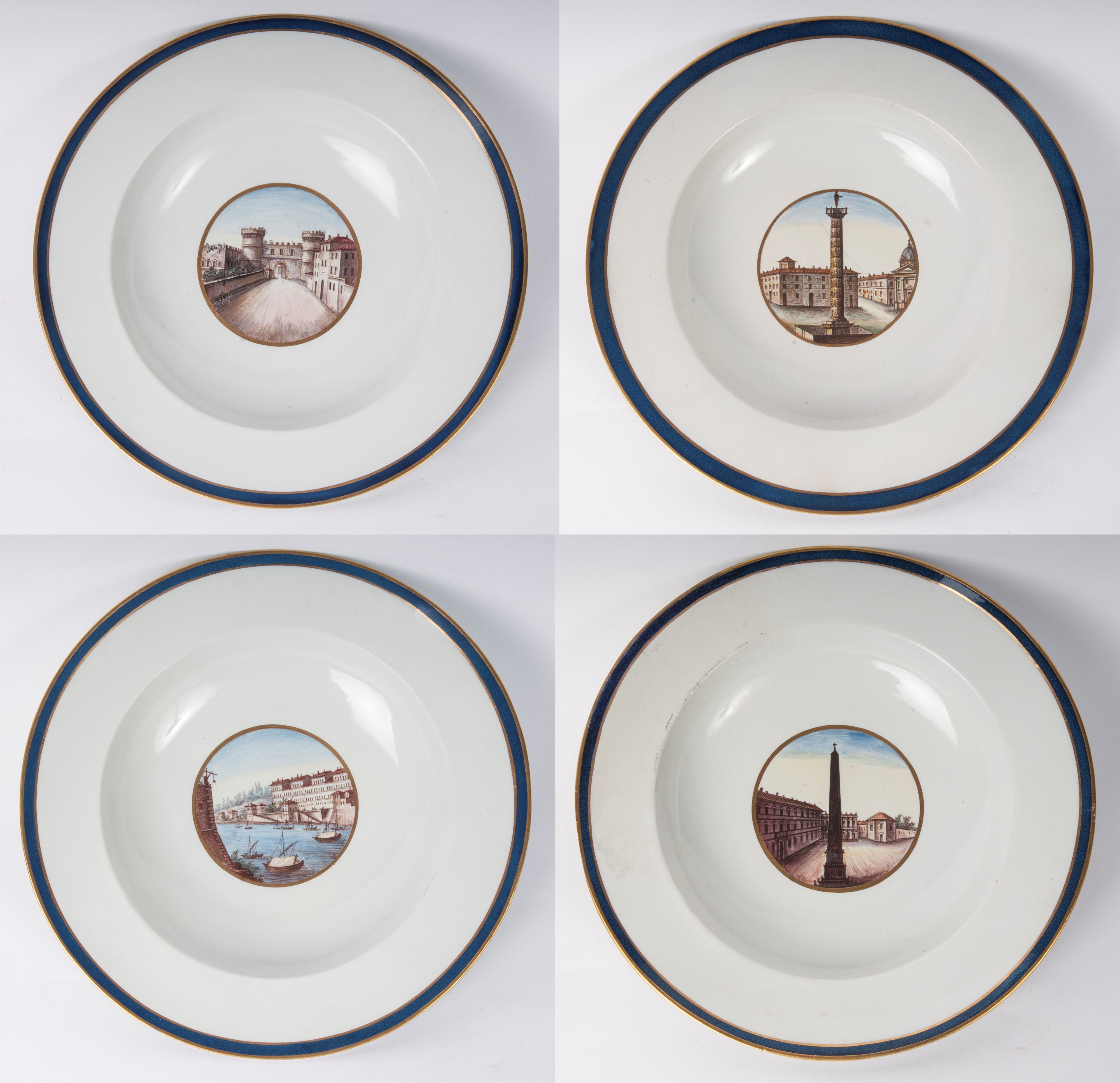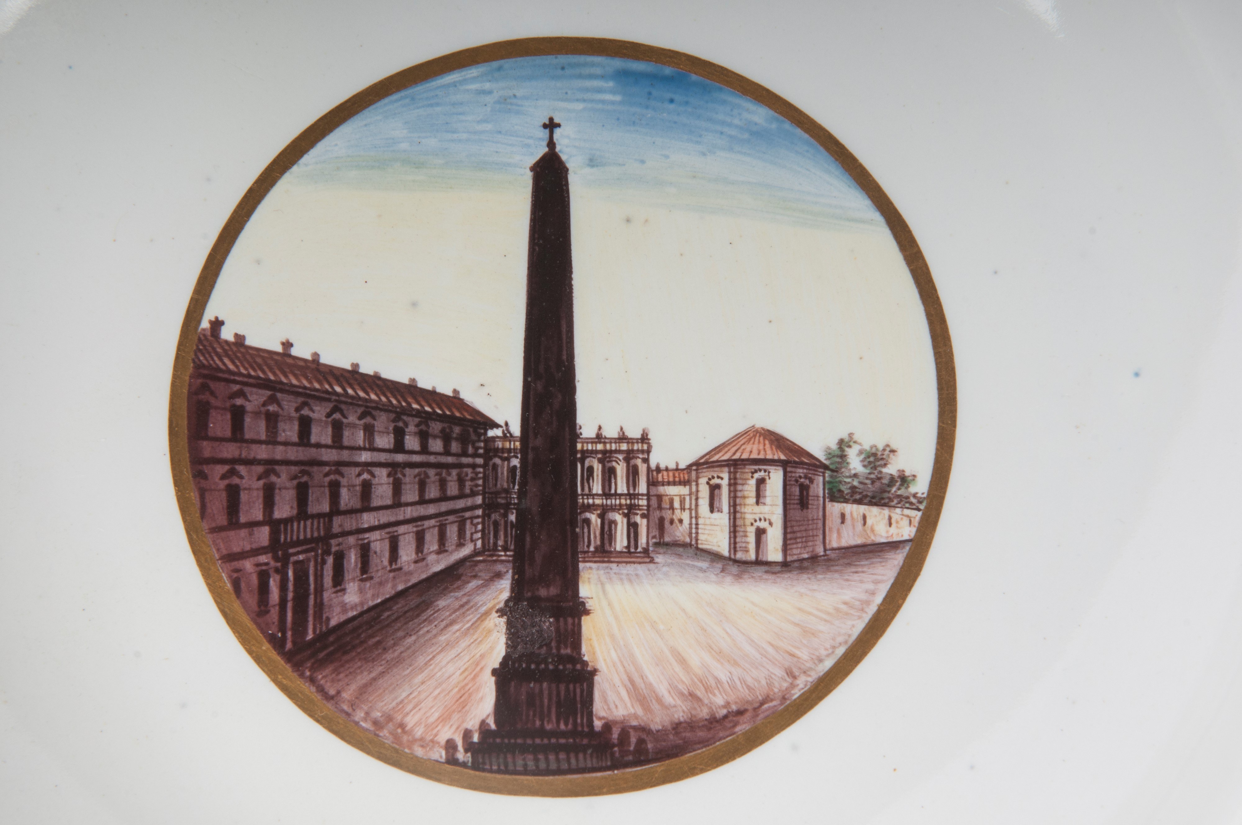 Wide brim with steep flounce and wide bottom, ring support on the back with slightly lowered bottom. Decoration with view of the monuments of Rome within a gold reserve on a white background. Cobalt blue border with double pure gold profile.