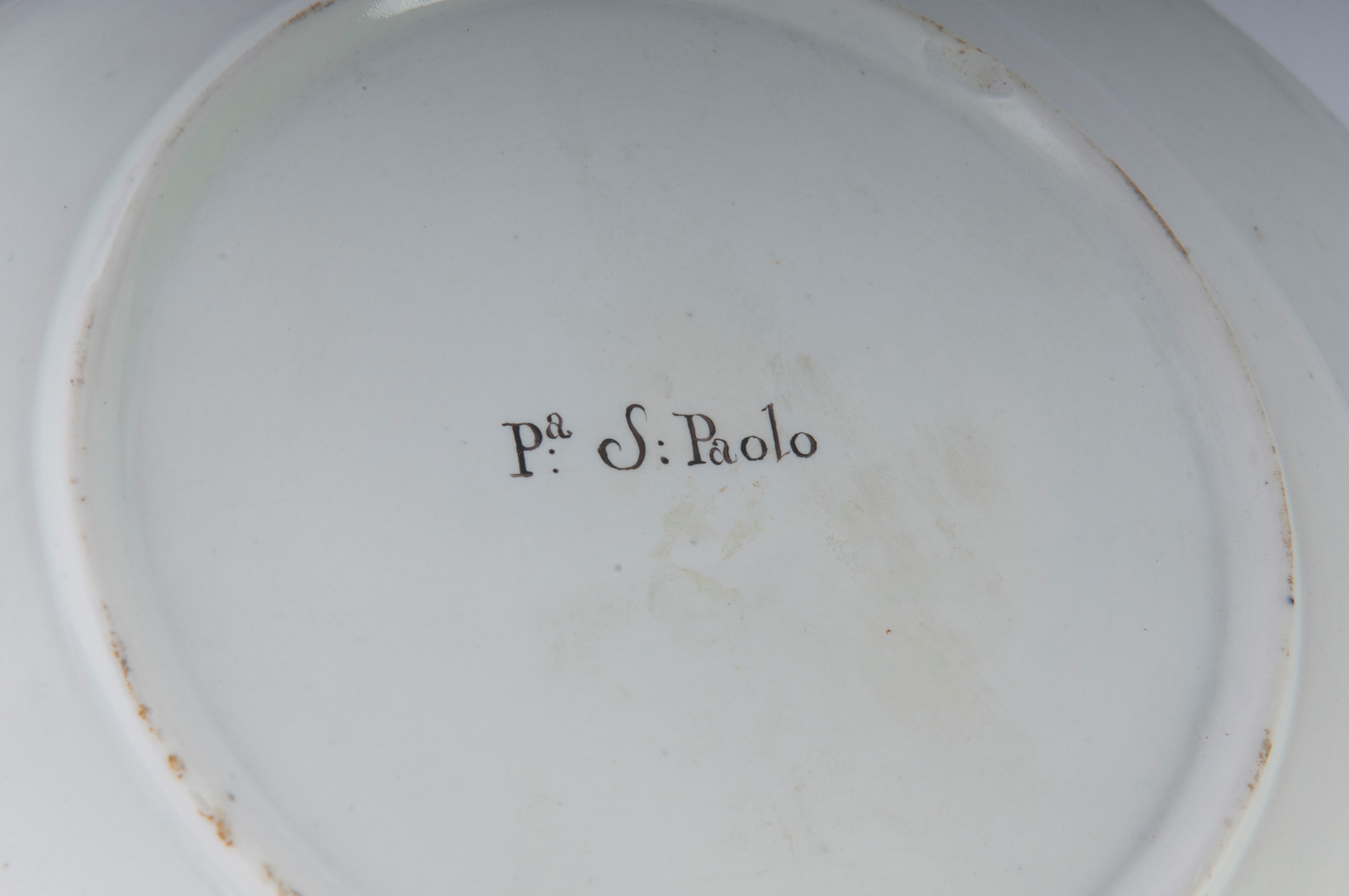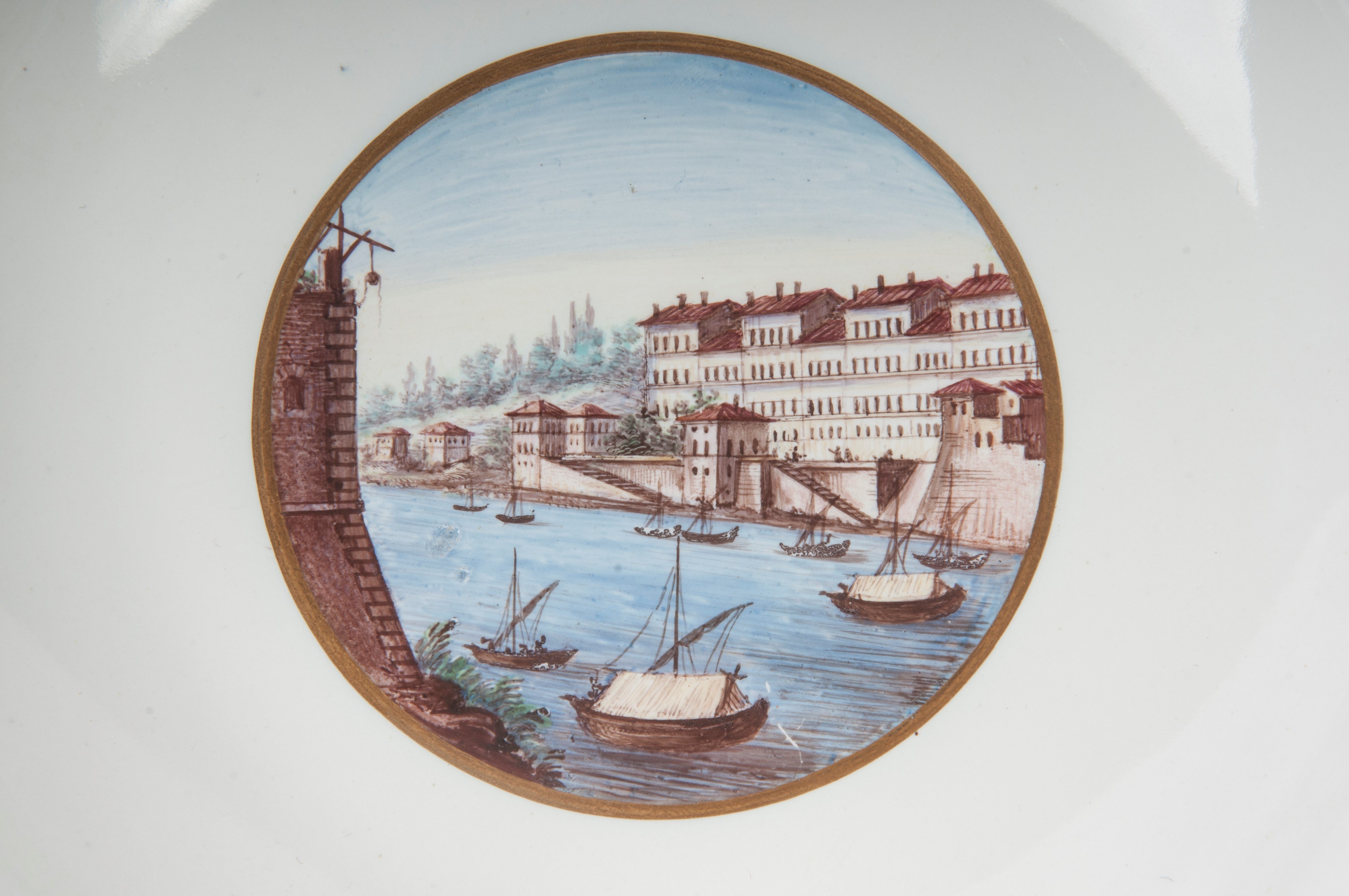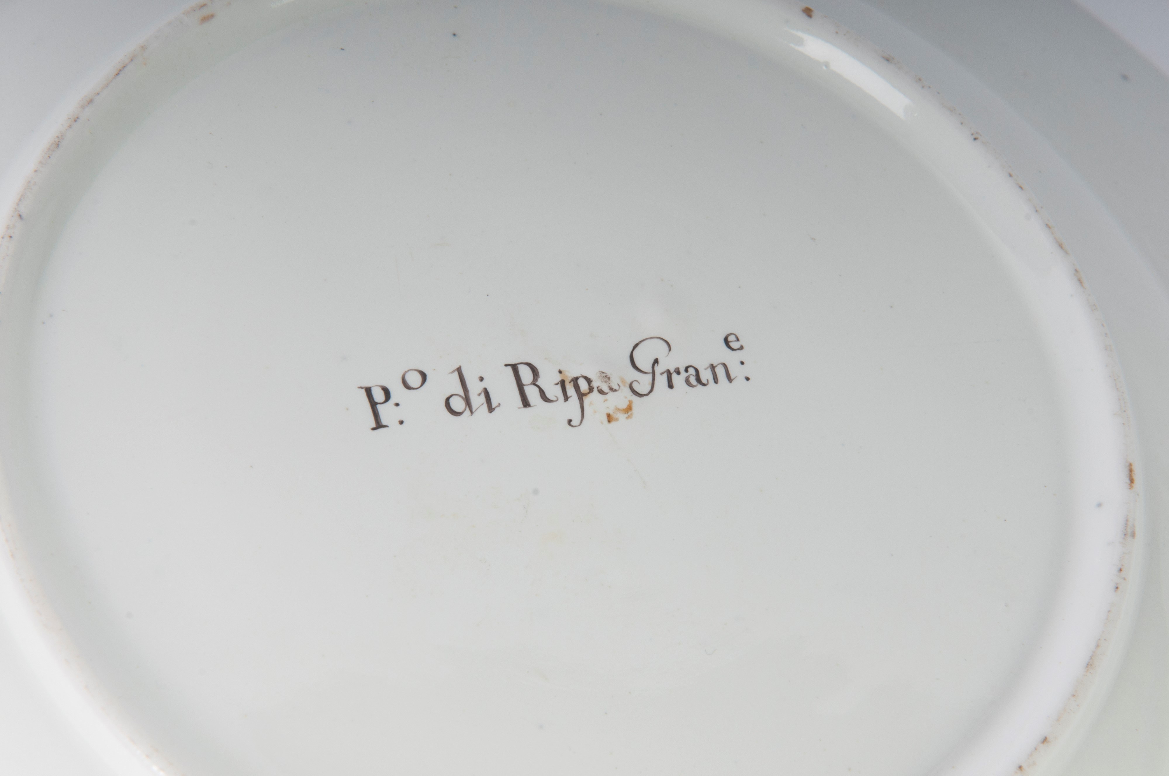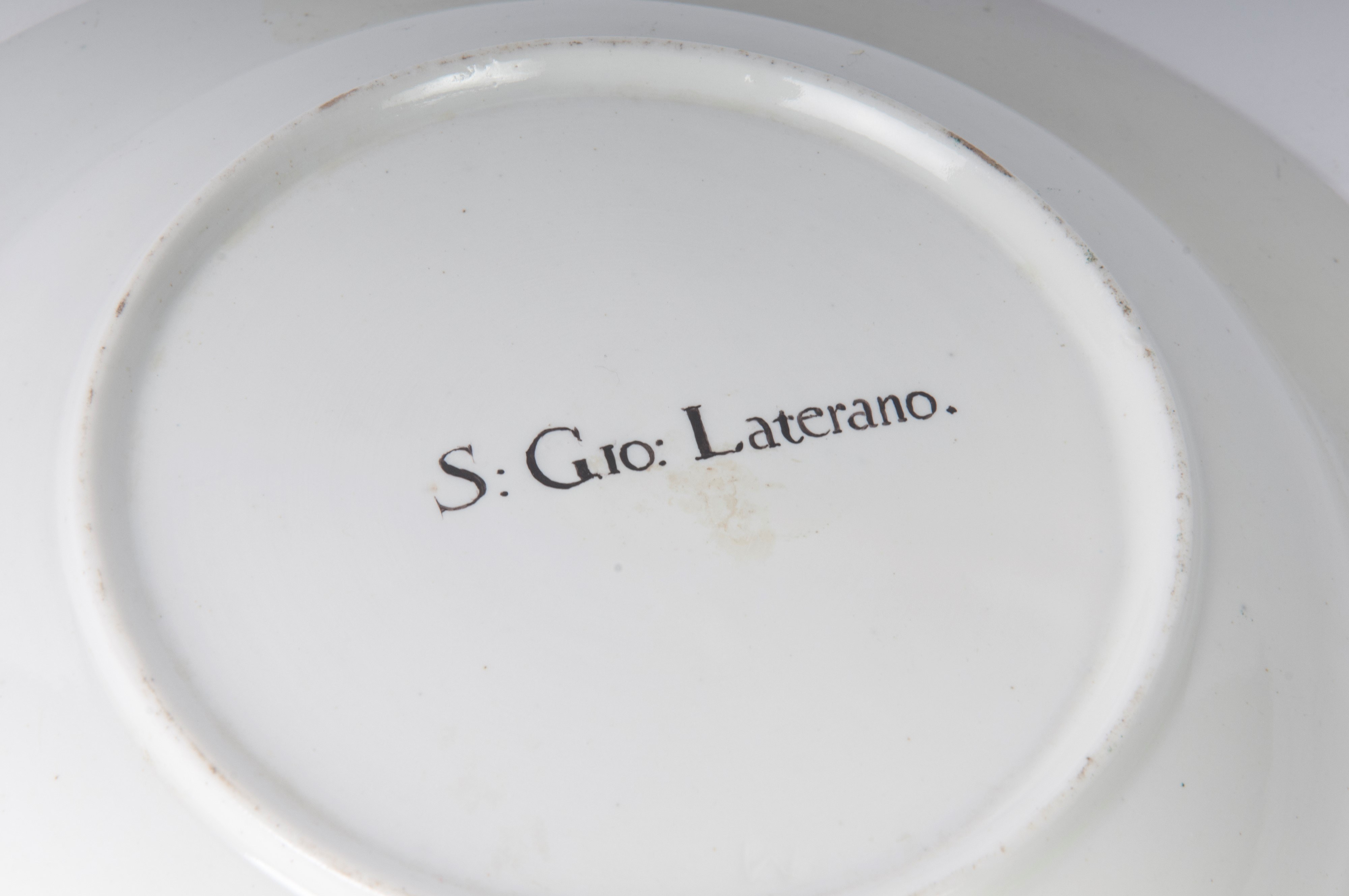 Wide brim with steep flounce and wide bottom, ring support on the back with slightly lowered bottom. Decoration with view of the monuments of Rome within a gold reserve on a white background. Cobalt blue border with double pure gold profile.
