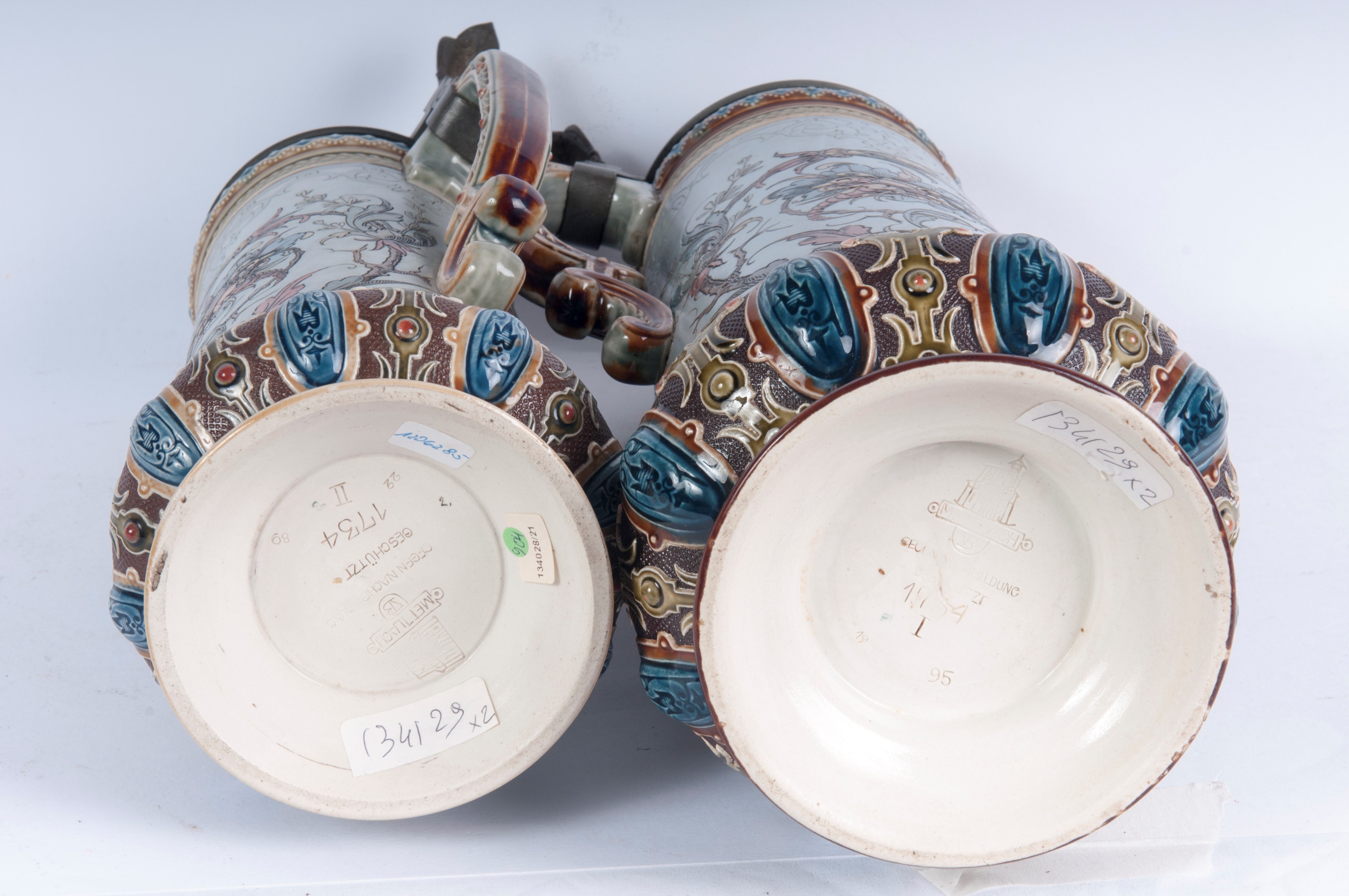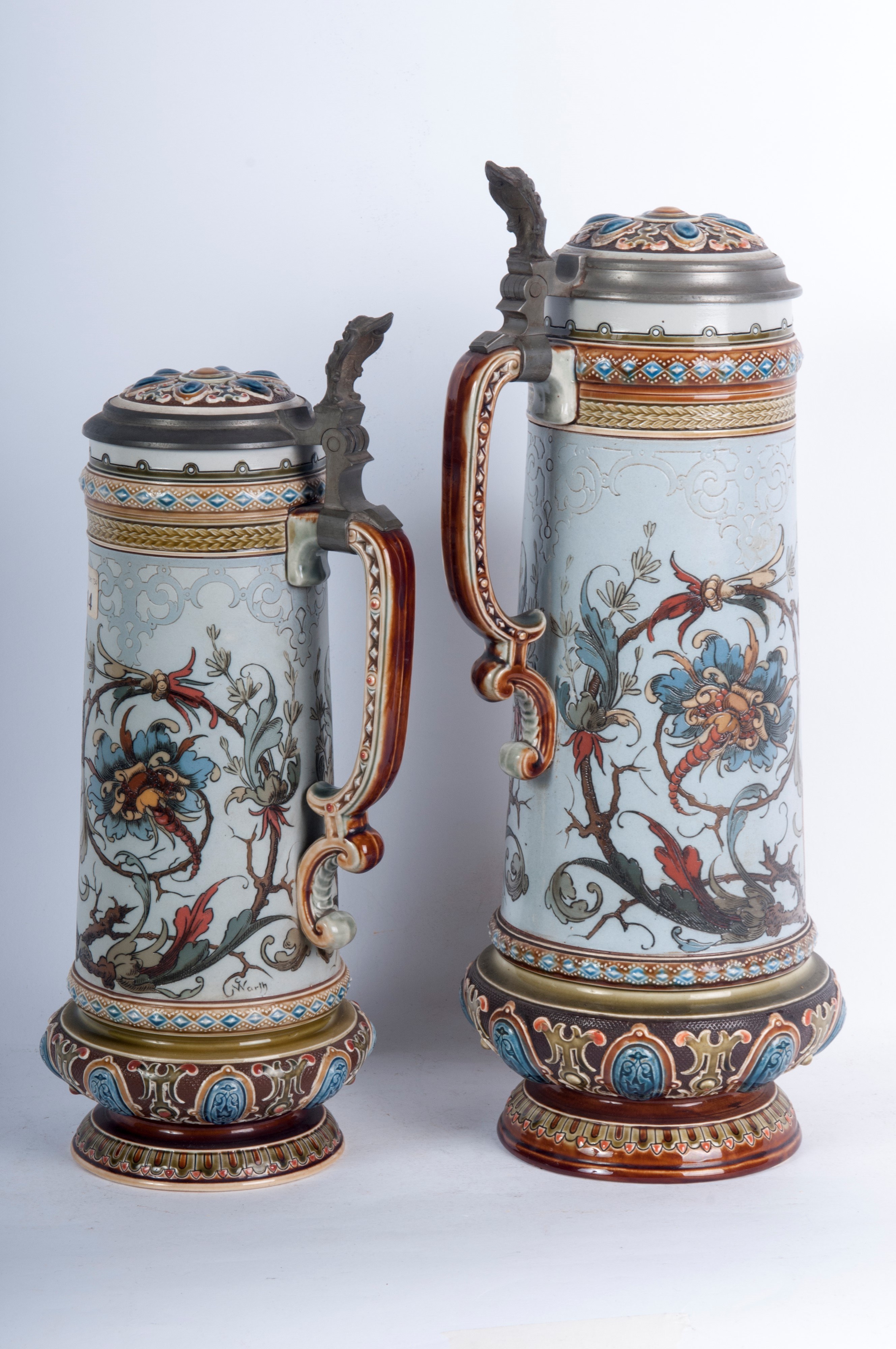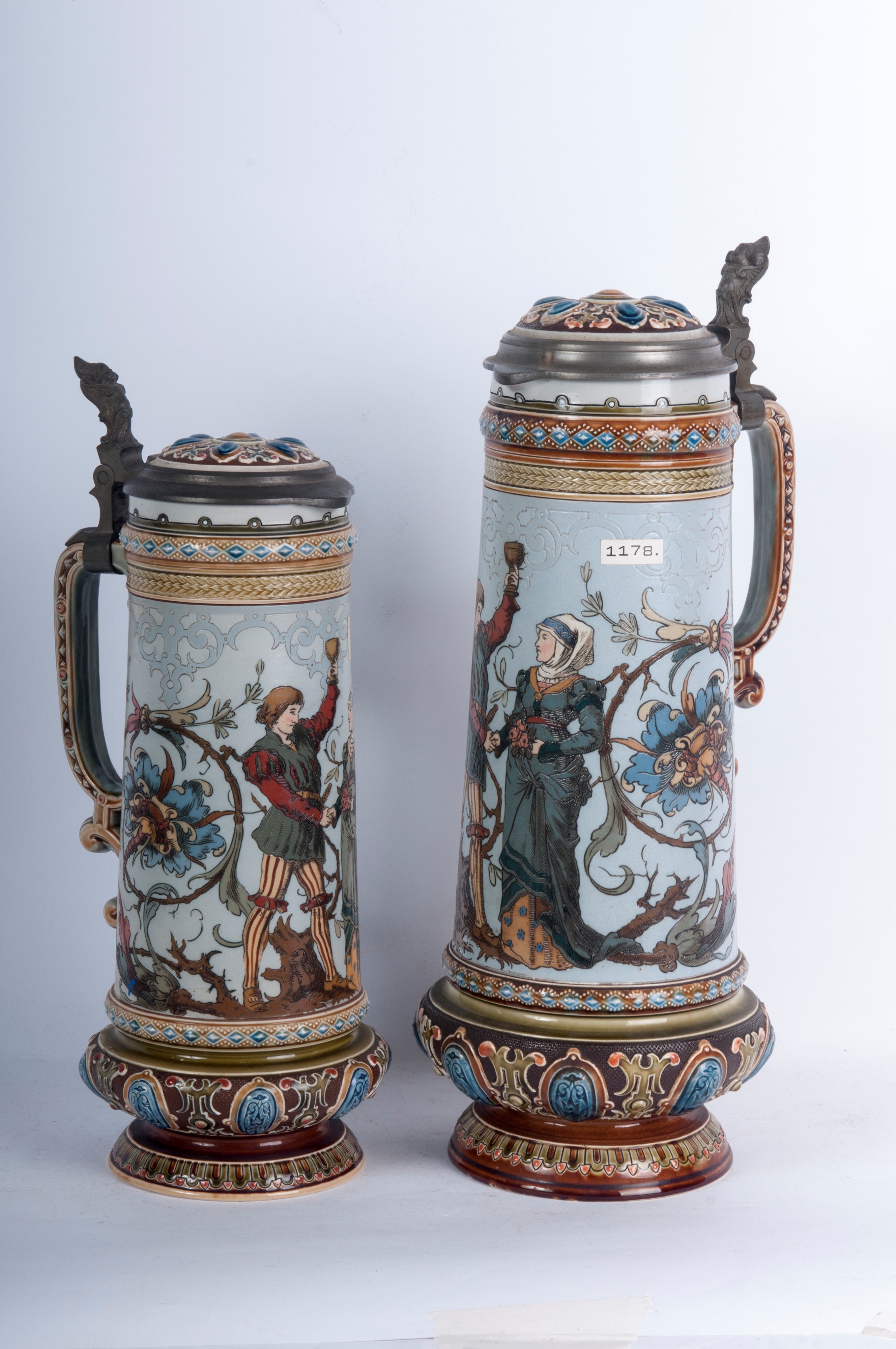 Polychrome ceramic with a pewter lid. The body is decorated with figures and leafy scrolls on a blue background. The decorator's signature is on the body of the vase, and the manufacturer's signature is engraved on the base. Villeroy & Boch manufacture.